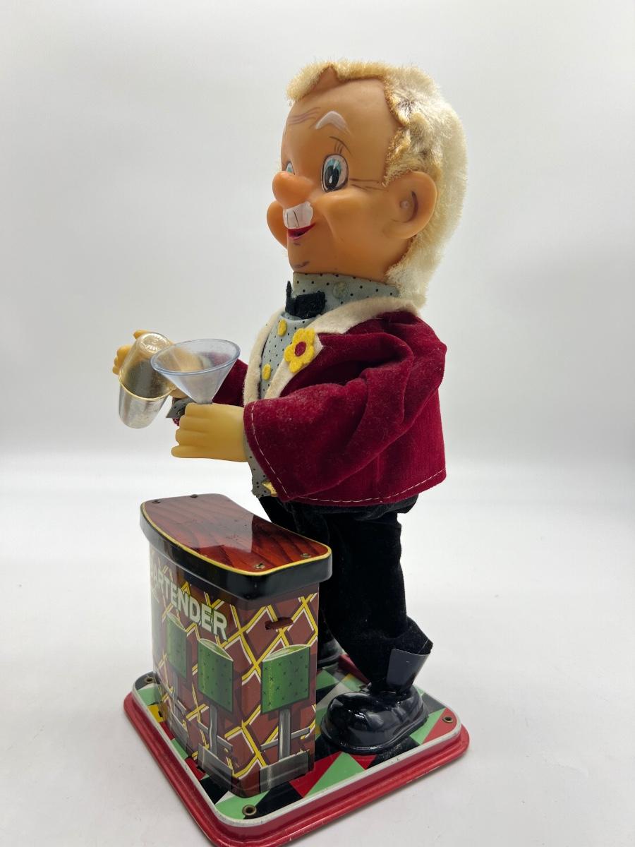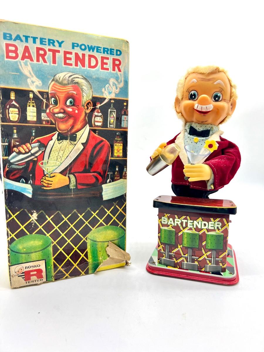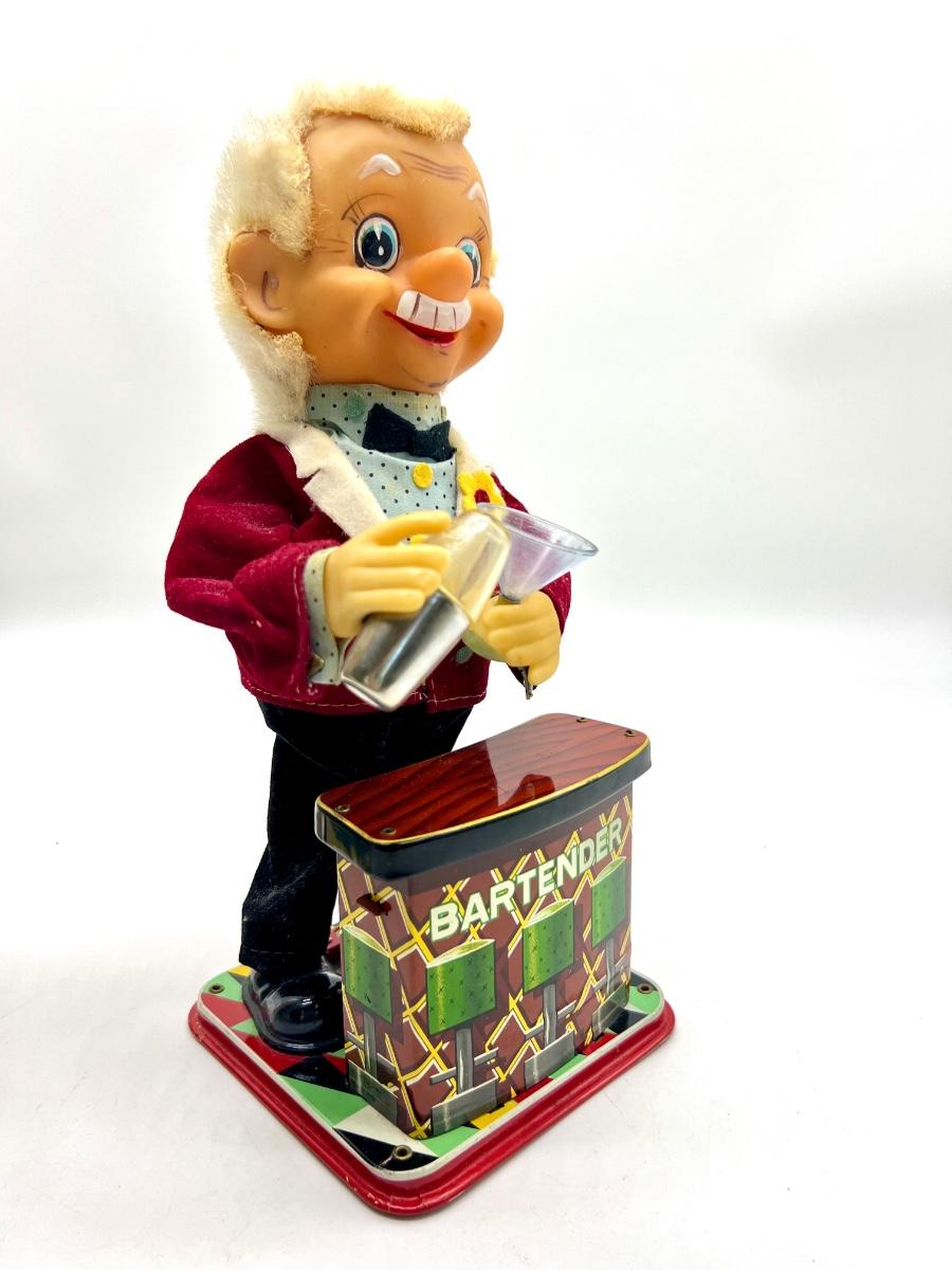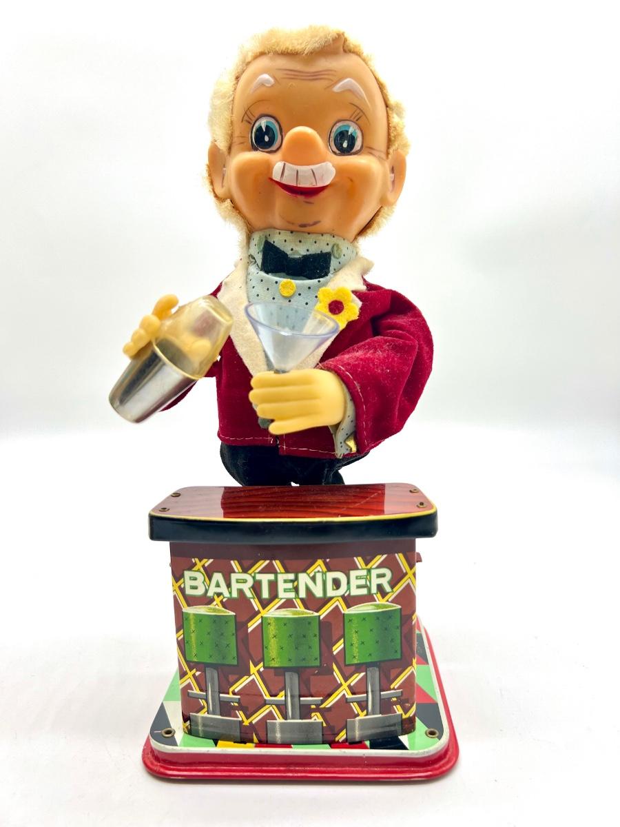 The Bartender Rosko at your service with the original box. He’s not tested. Selling as a conversation piece. Measures 11 inches tall and 5 inches wide. He does have some discoloration on the edges of his hair and on the white part of his suit.