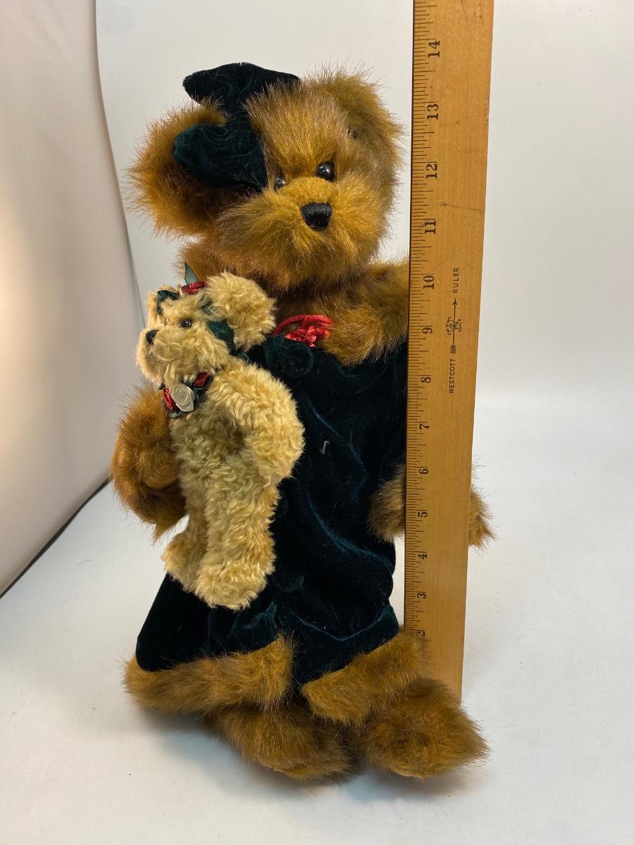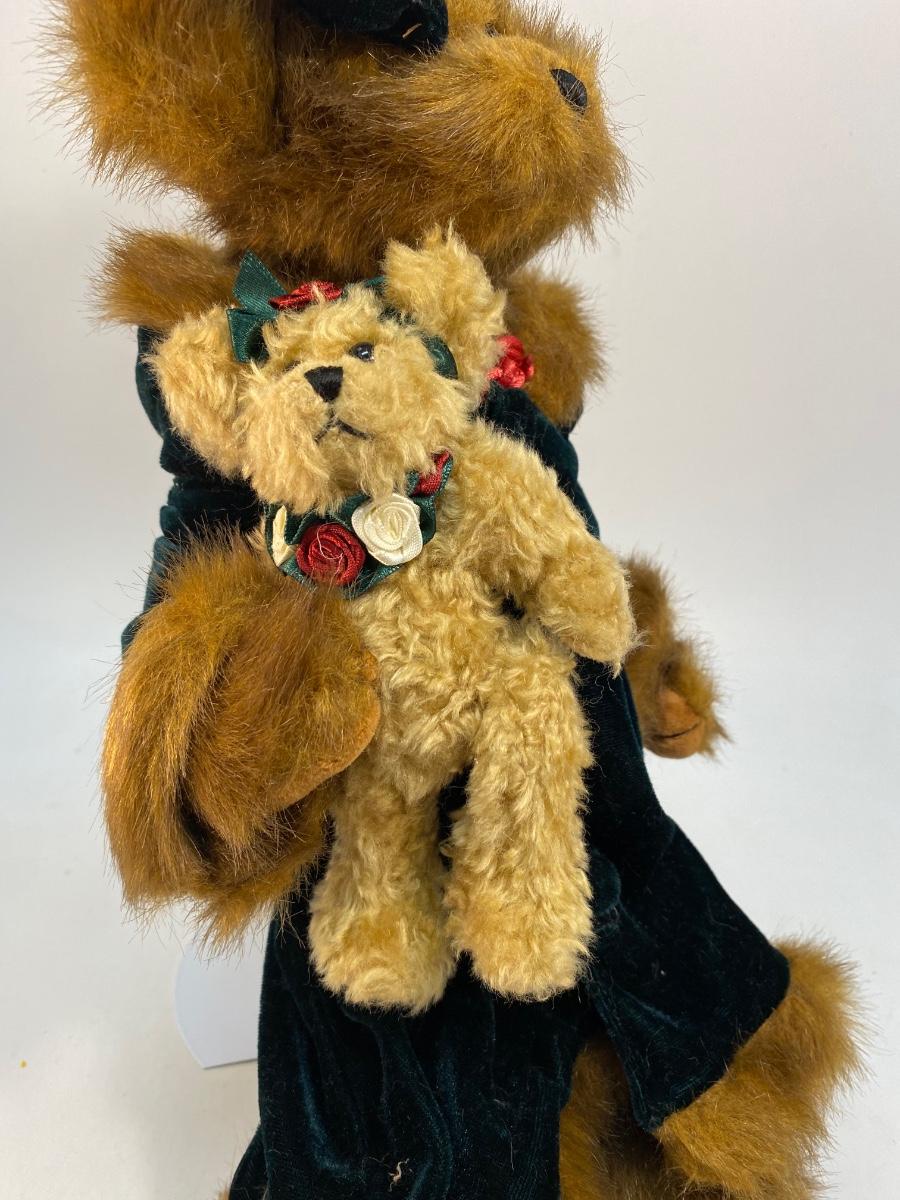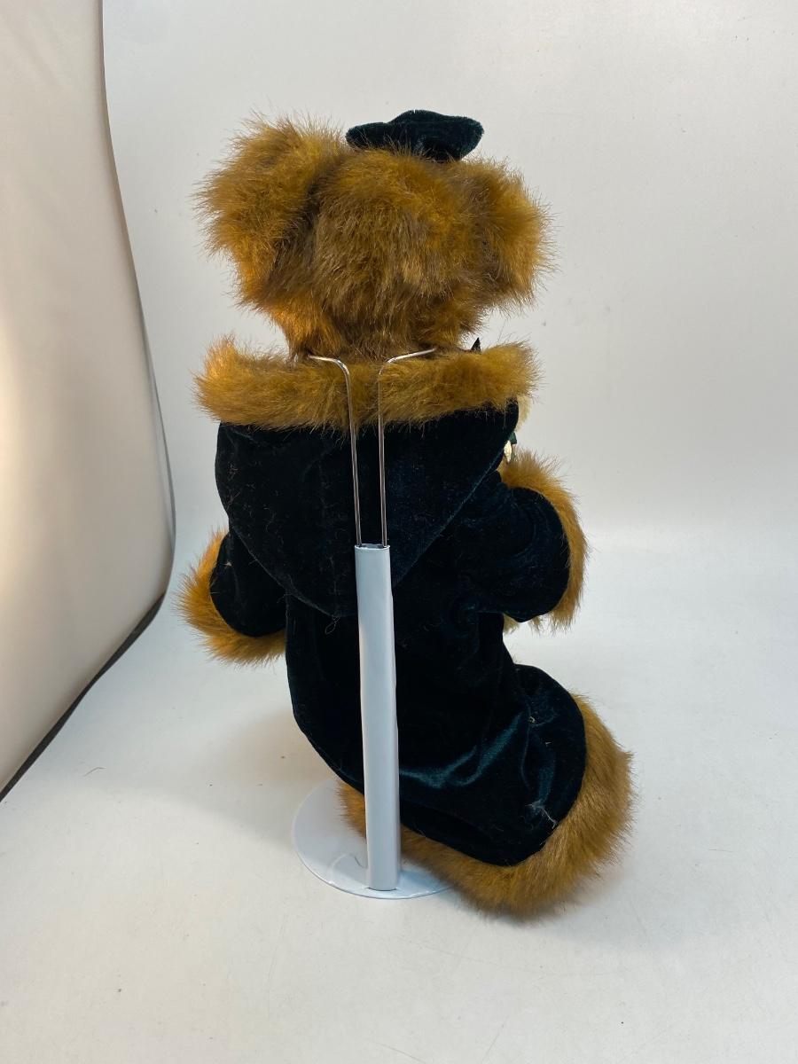 The Bearington Collection Brown Teddy Bear with Stuffed Bear Stand Included. Good condition. Bear is wearing a dark green velvet coat.