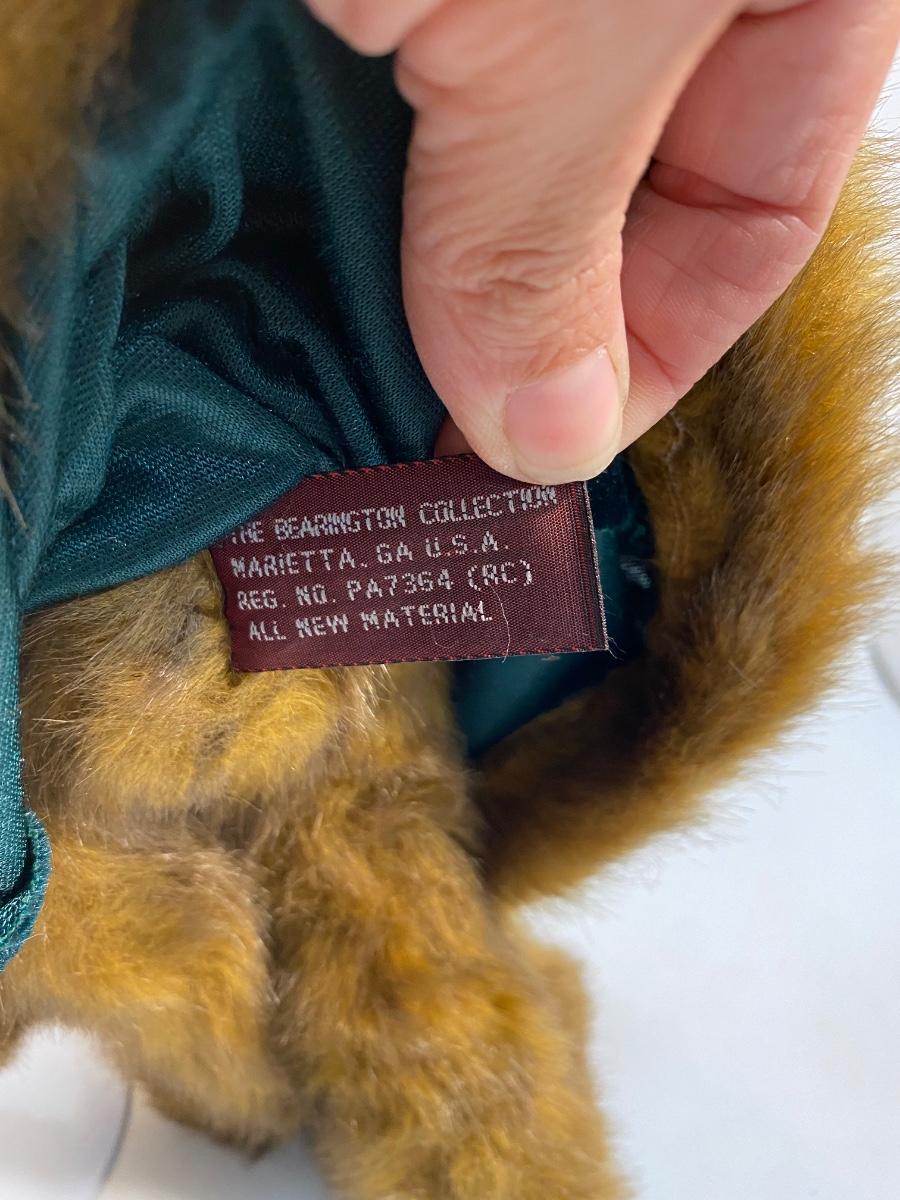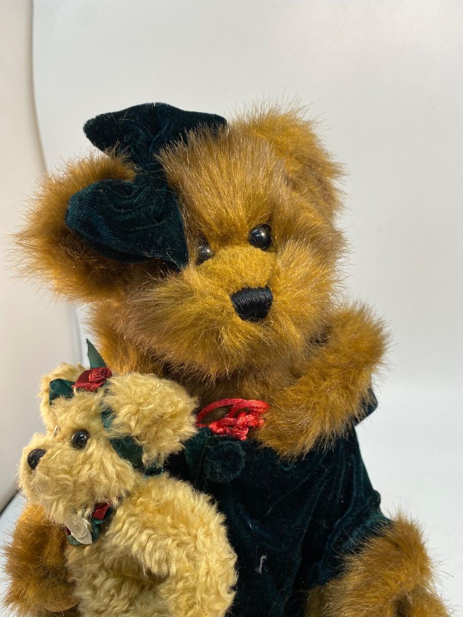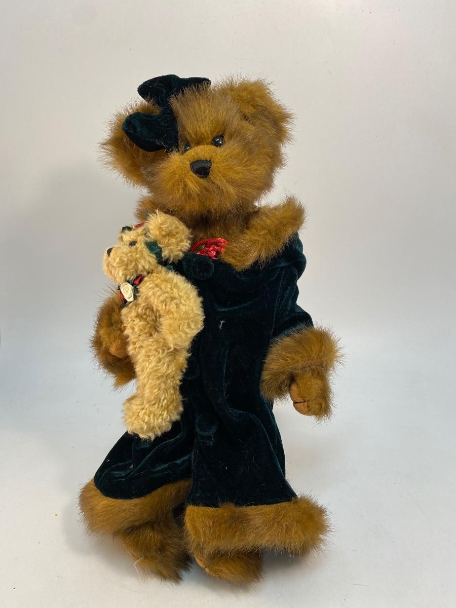 The Bearington Collection Brown Teddy Bear with Stuffed Bear Stand Included. Good condition. Bear is wearing a dark green velvet coat.