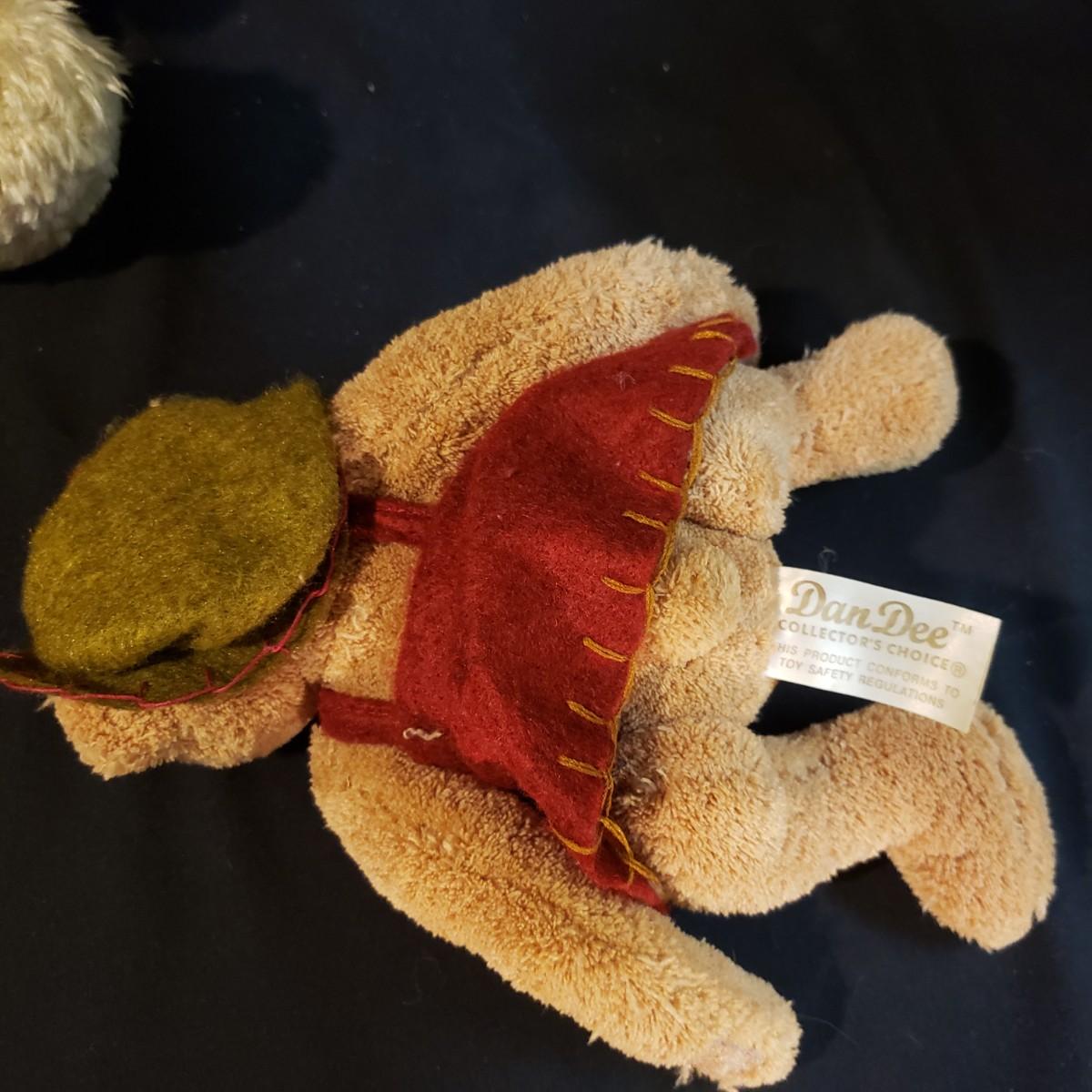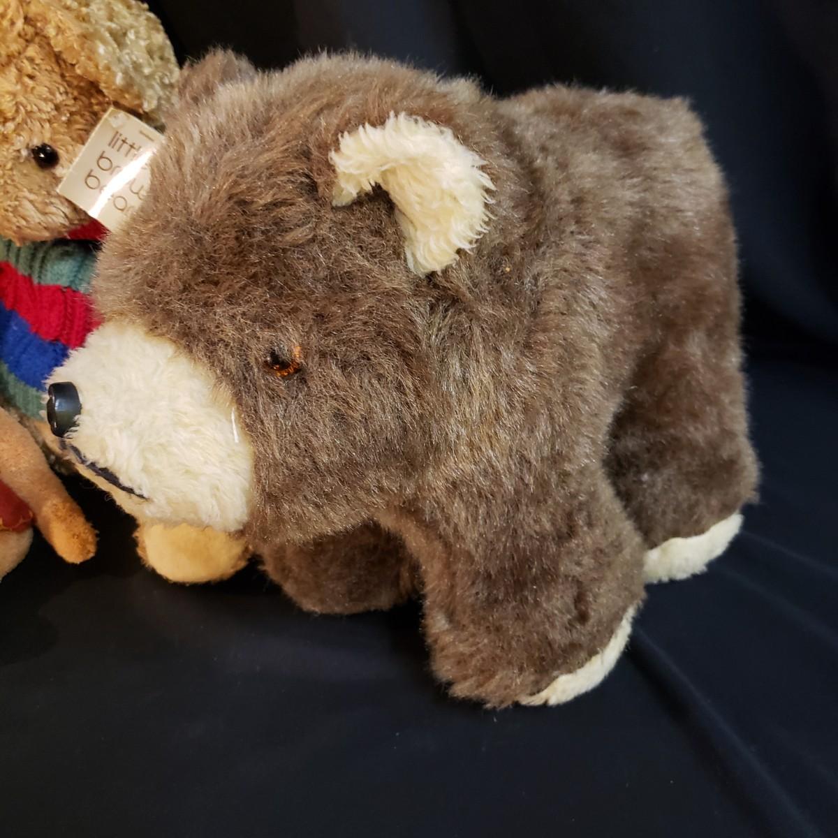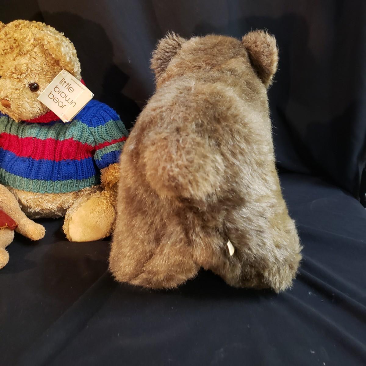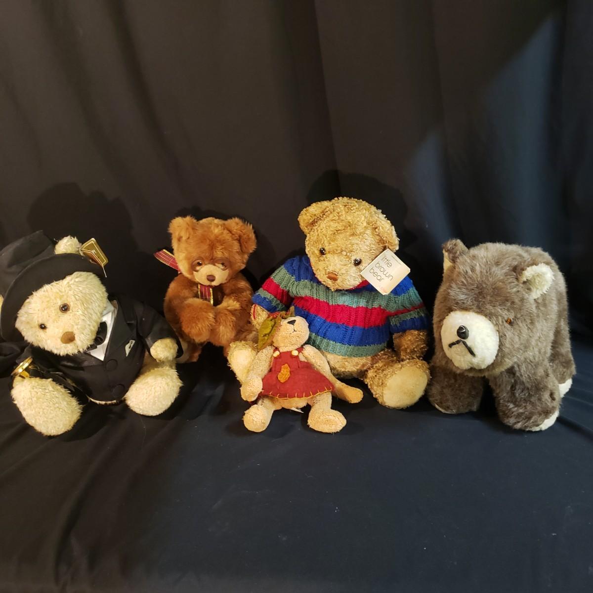 This lot contains 5 stuffed bears. The bear on 4 legs measures 16"x12", There is a Dan Dee bear, a Wellington Bear (12"x9"), a Little Brown Bear and a Gund bear. All bears appear to be in good condition.