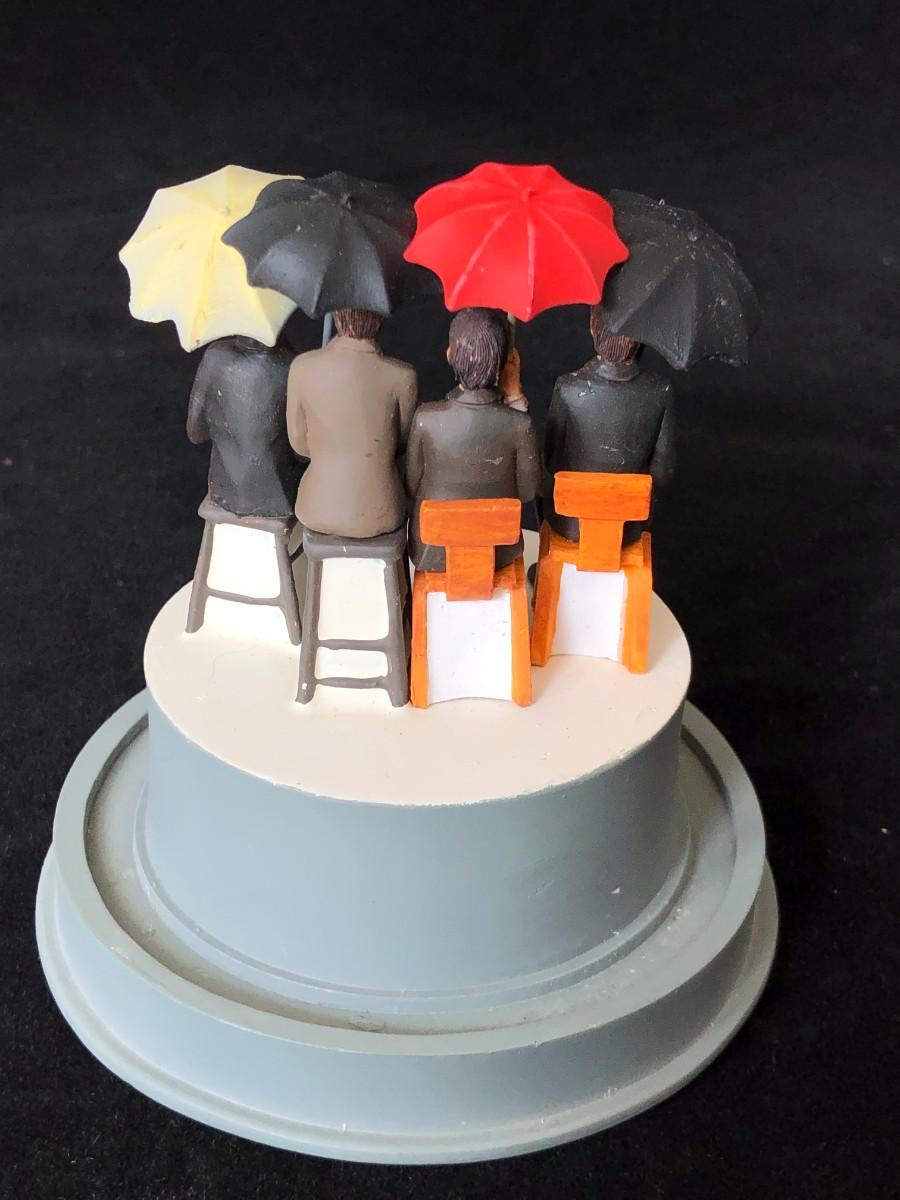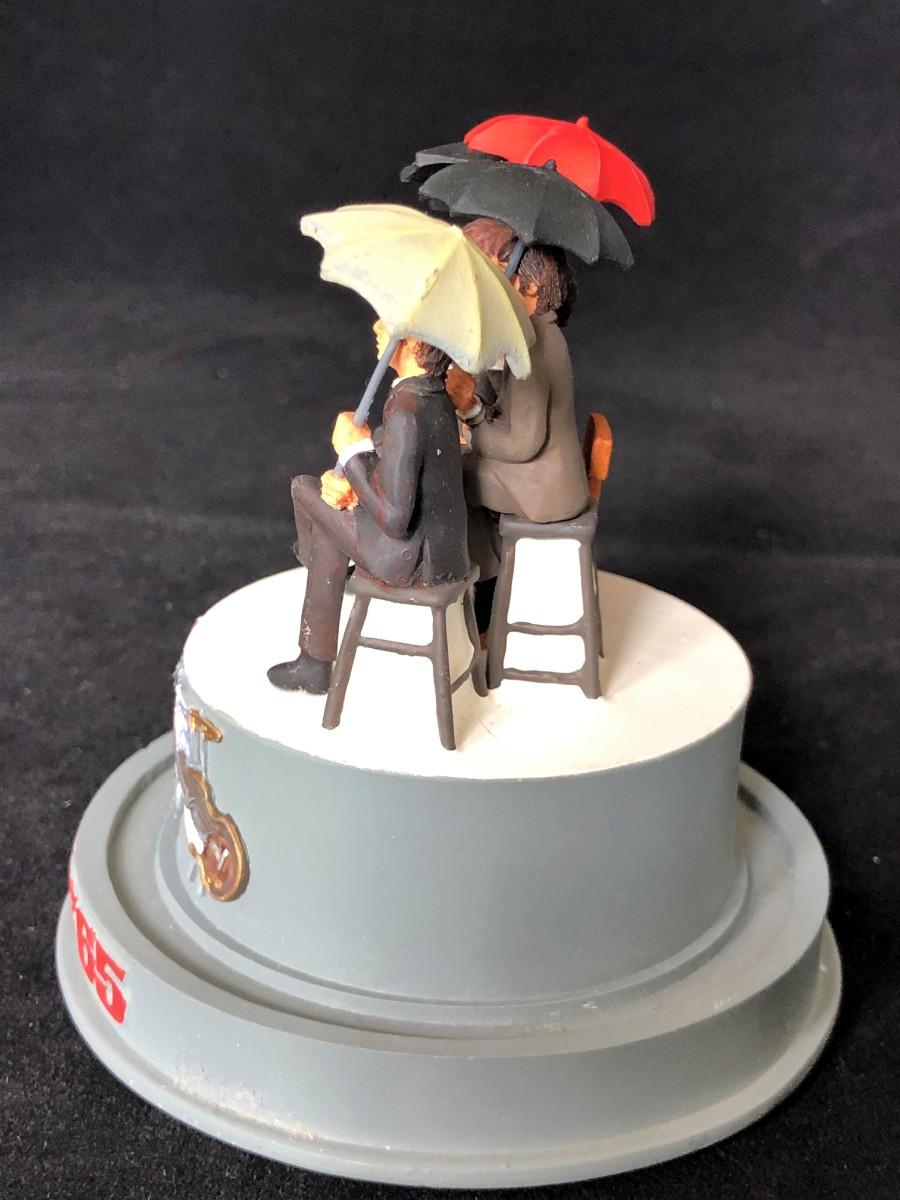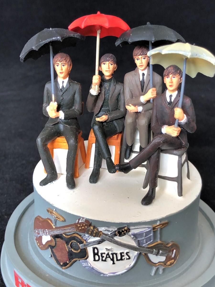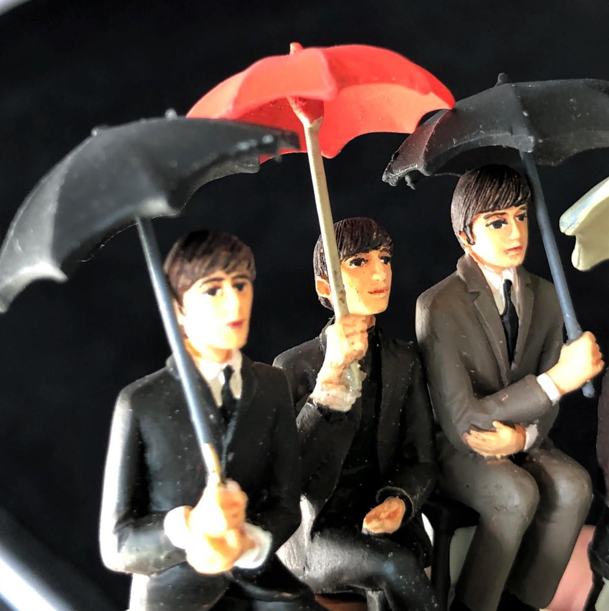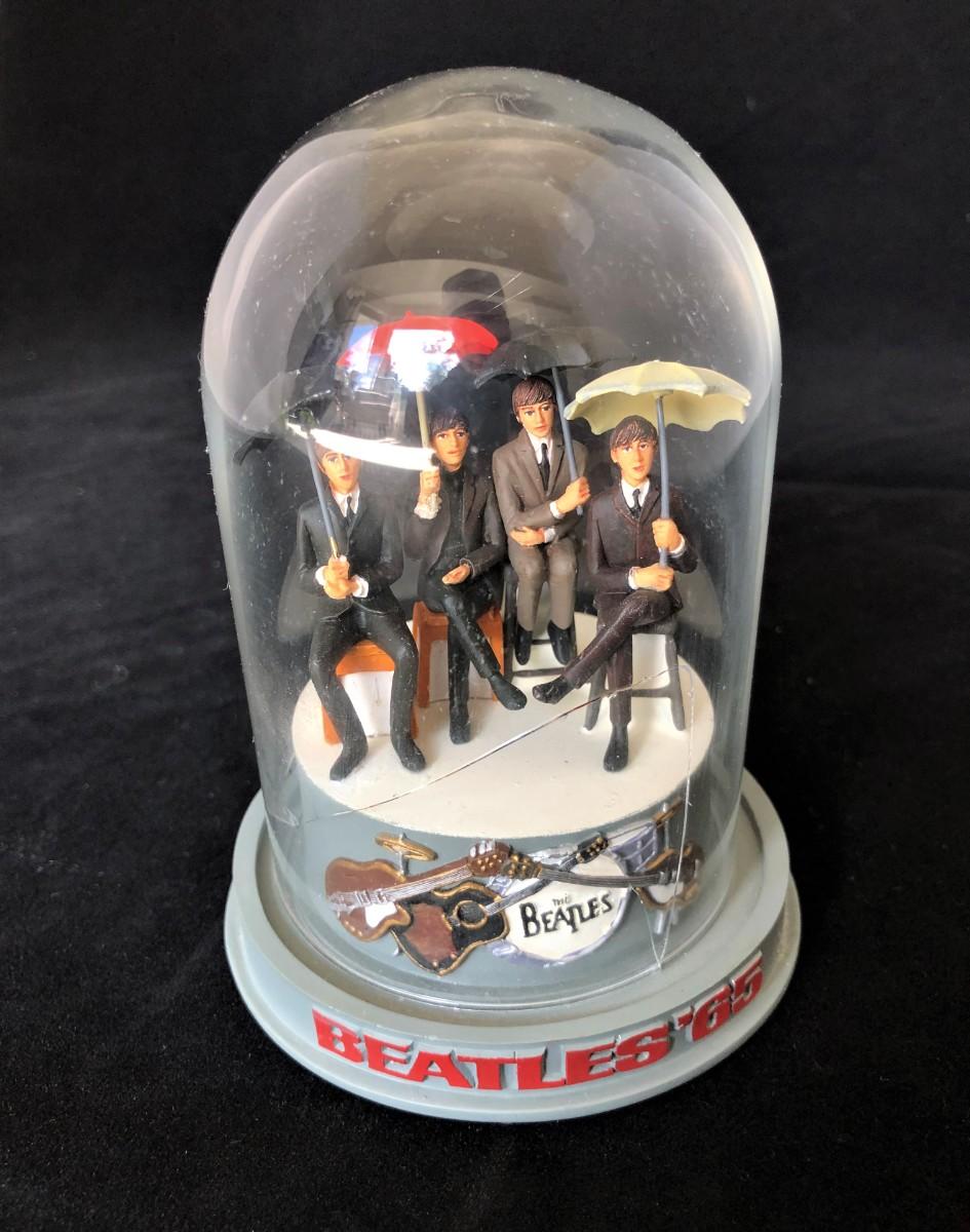 Vintage Beatles 65 music dome. Glass dome has a crack. Shows the four band members with their umbrellas. Music is not currently in working condition. Good condition, with some signs of prior repair to one hand.