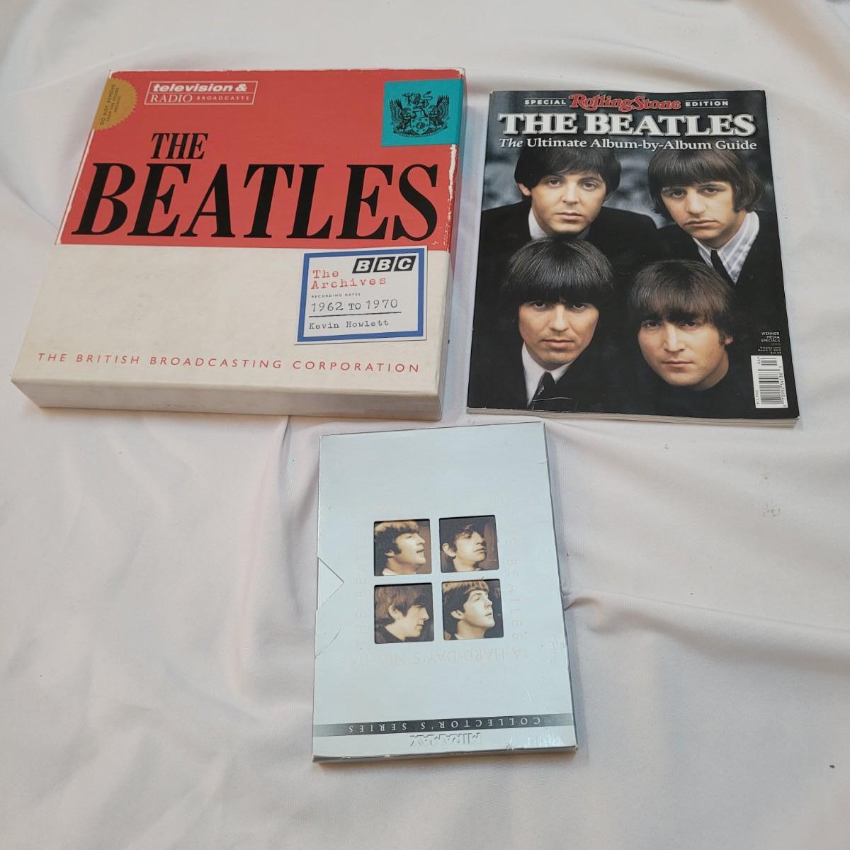This lot includes three different pieces of The Beatles memorabilia. The first item is a boxed The Beatles BBC Archives 1962-1970. The second item is a special edition Rolling Stone magazine album-by-album guide. The third item is a Miramax collectors series box DVD set titled "A Hard Day's Night". It includes an in-depth look into the preparation and songs of a T.V. performance by the Beatles.