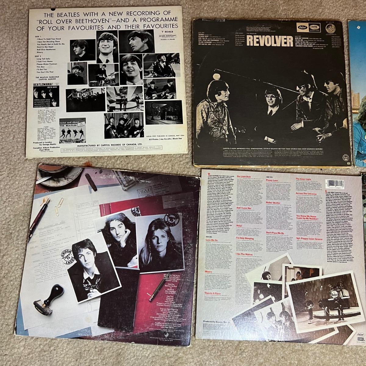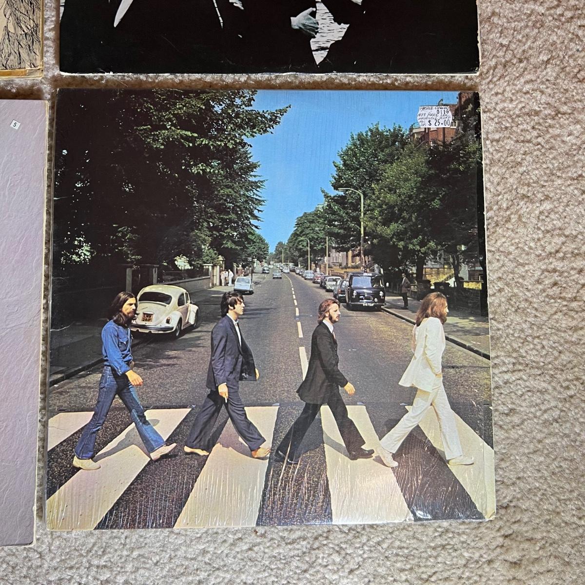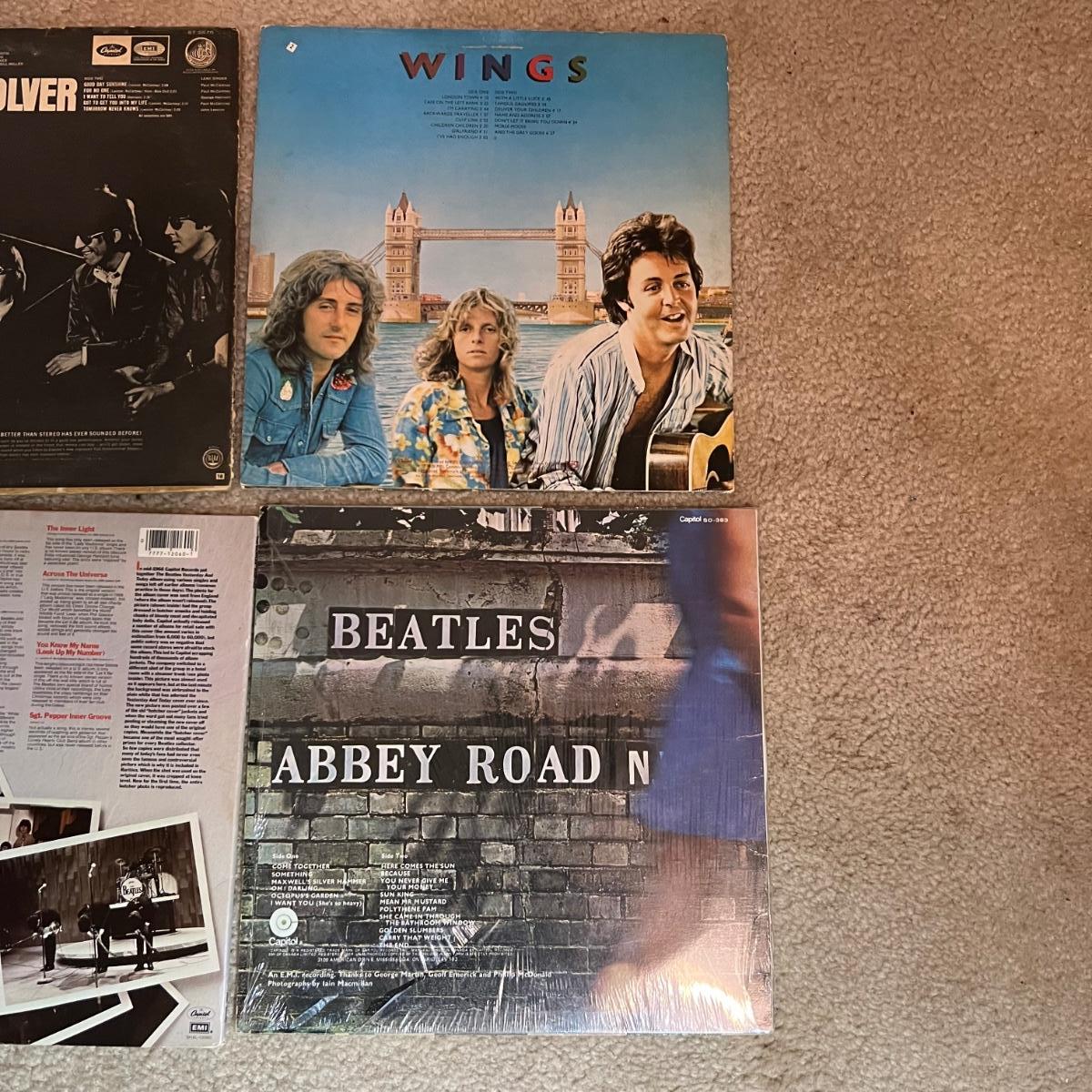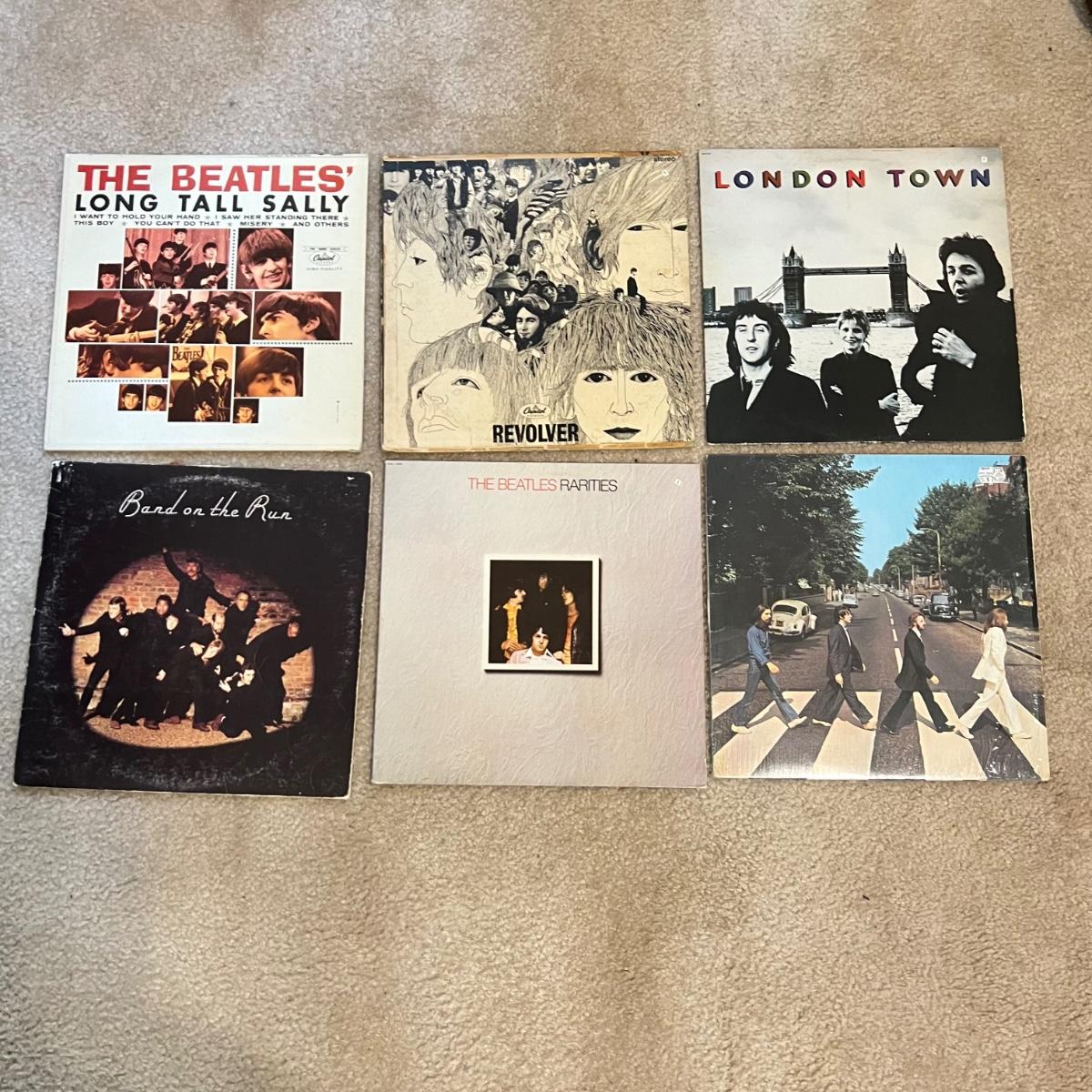 Seven vinyl records includes both The Beatles, John Lennon and Wings. See images for all titles. John Lennon is not shown in the image with the other six as we added it later. Abbey Road has been opened but is still in its plastic sleeve.