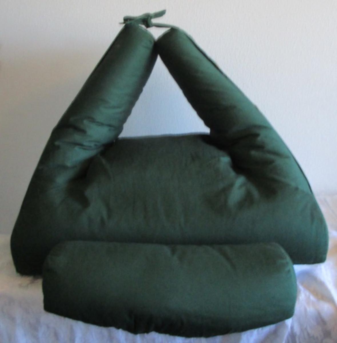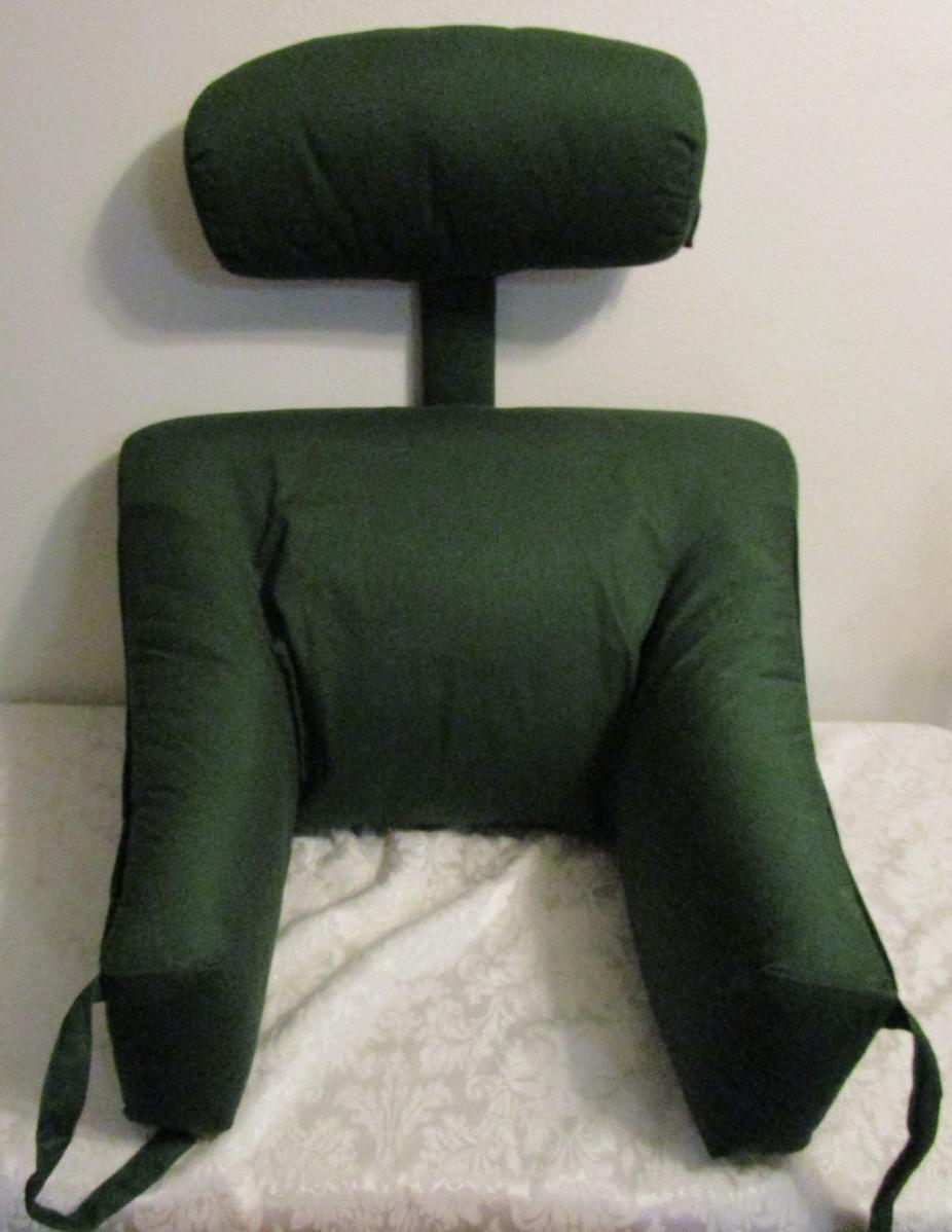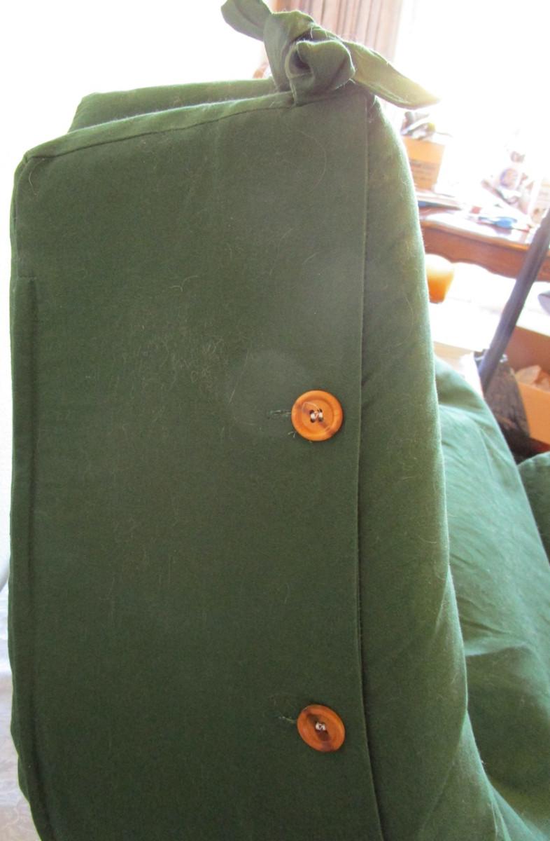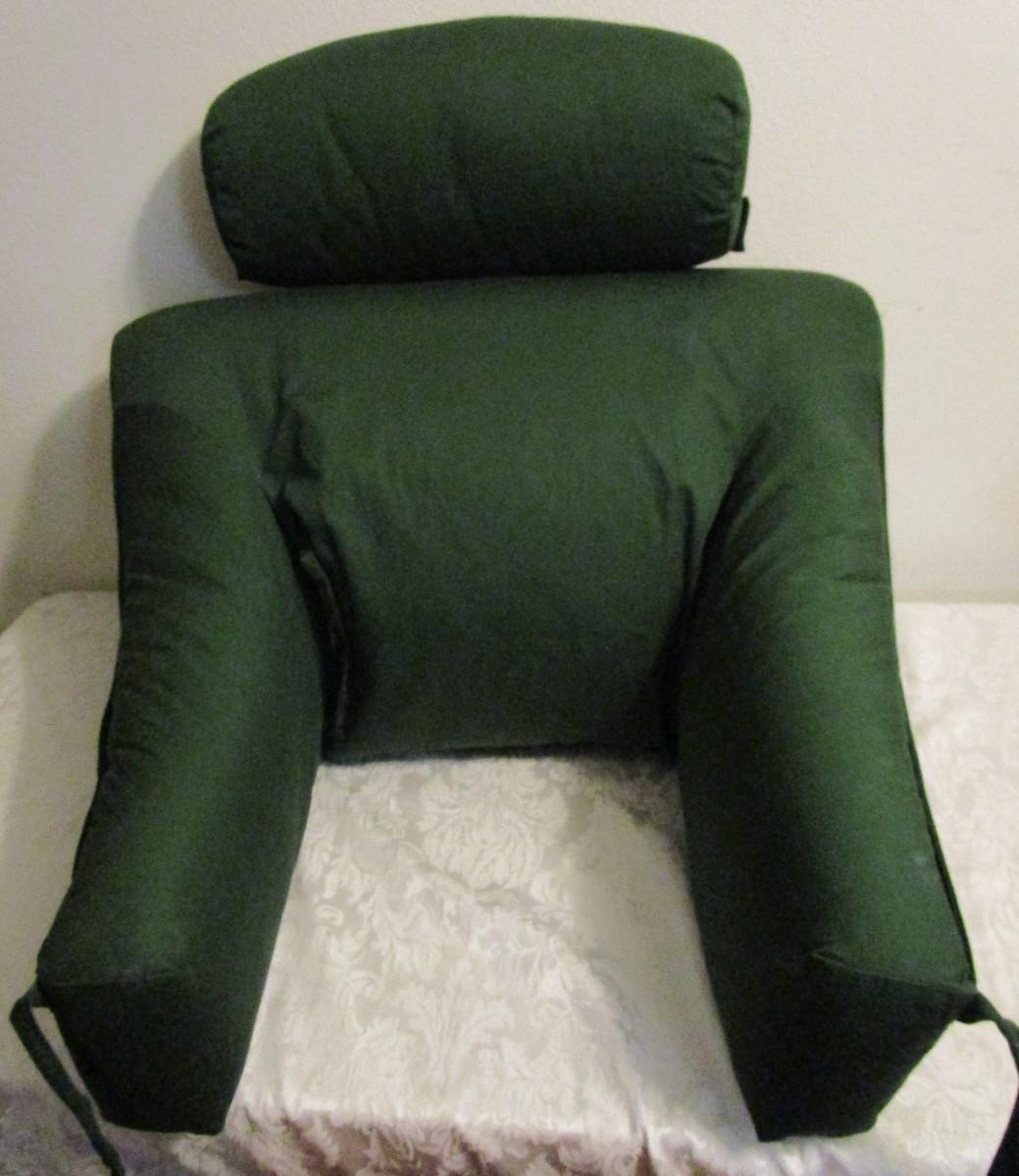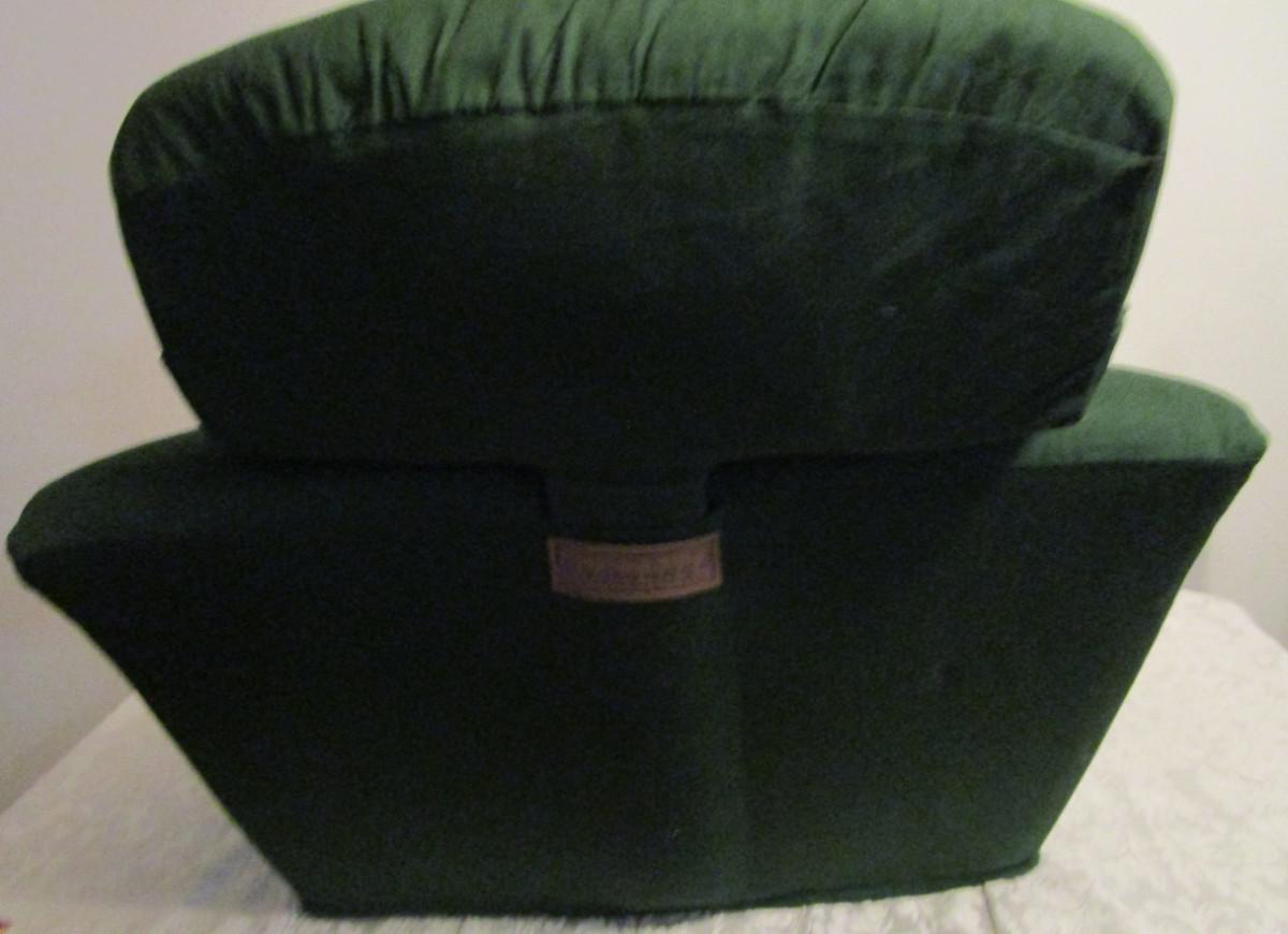 Green, with headrest that extends 12", 100% cotton cover is removable and washable, also has side pockets, arms fold in, see pictures