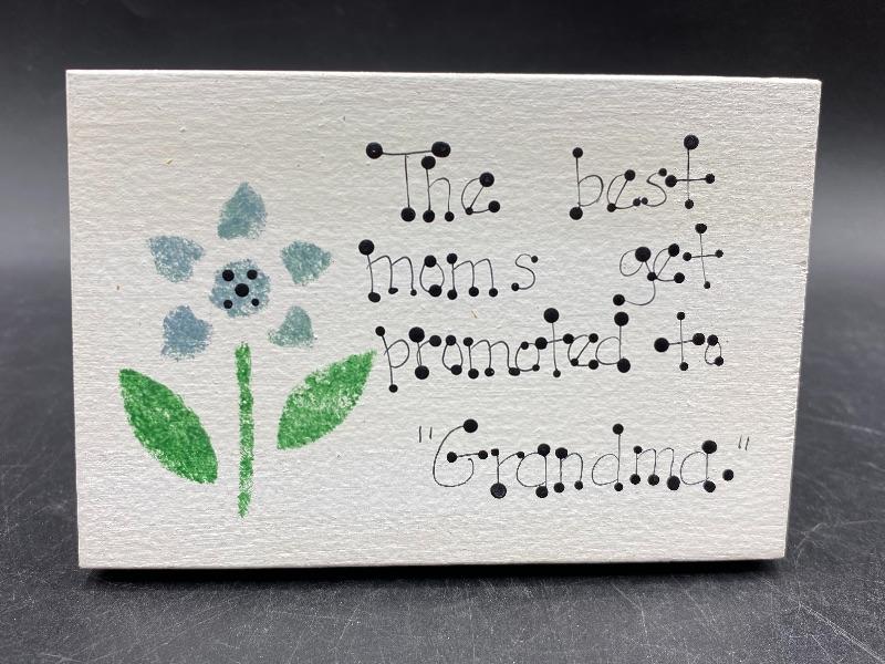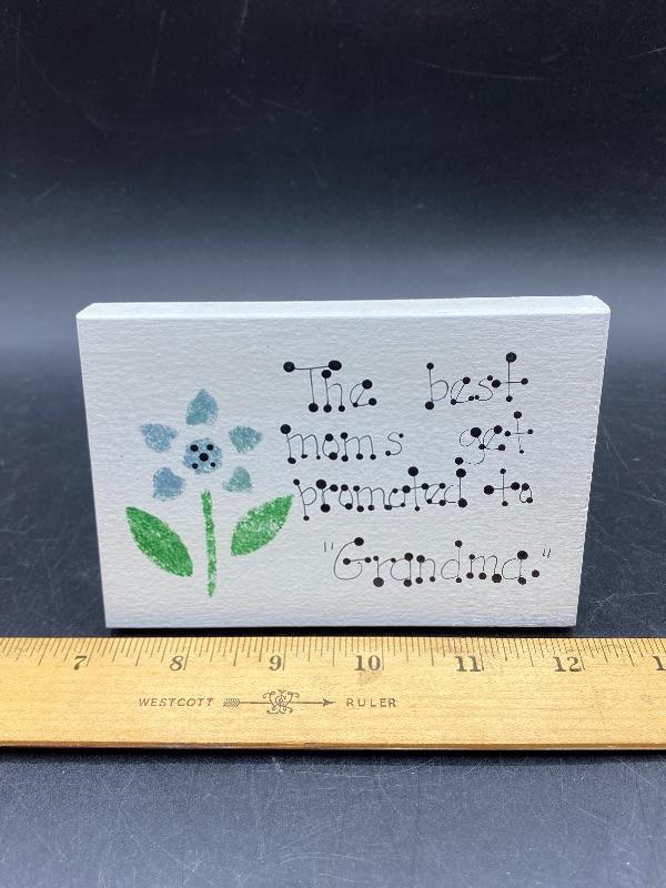 Cute tole art plaque "The best Mom's get promoted to Grandma". Small 5" size. Has a wood peg to help stand.