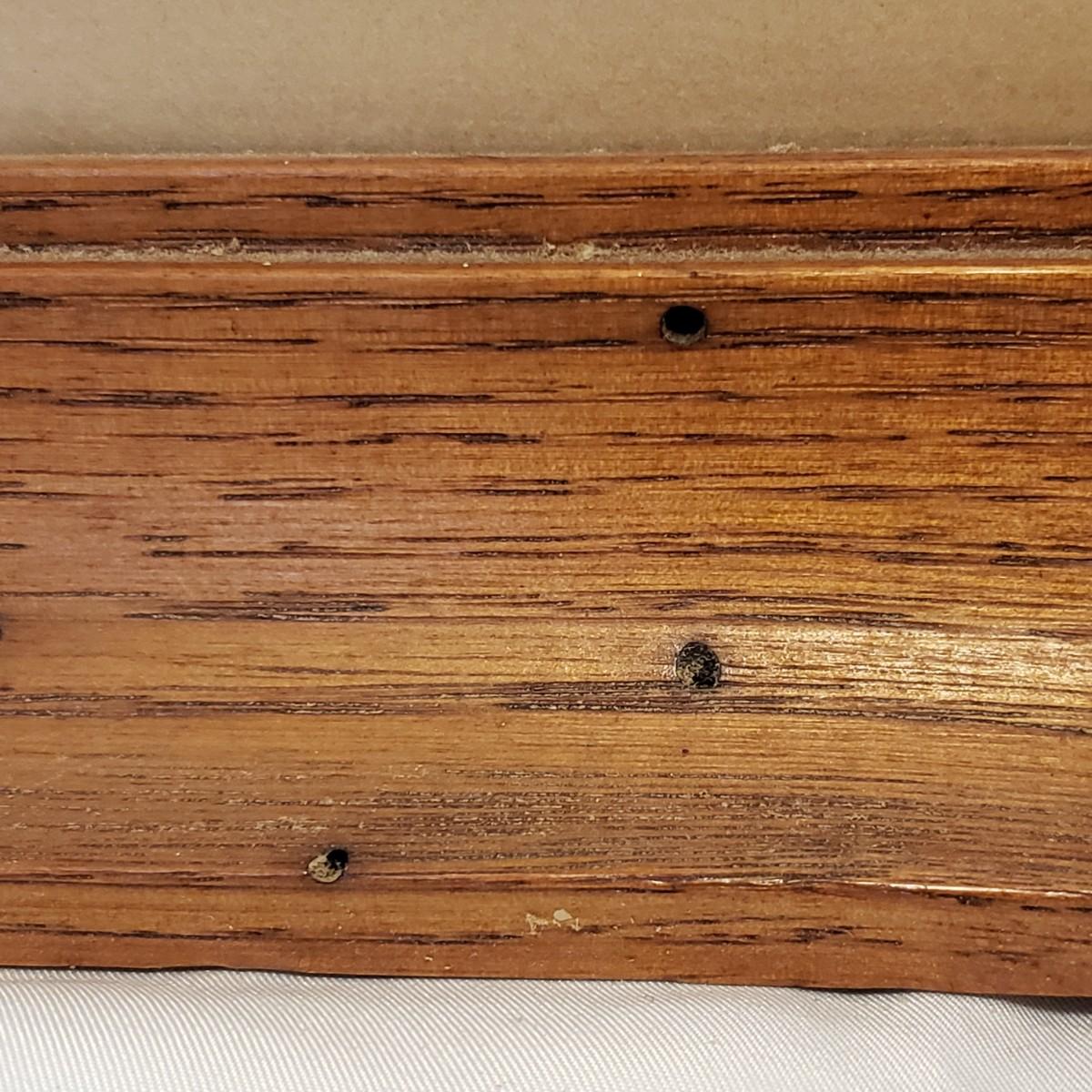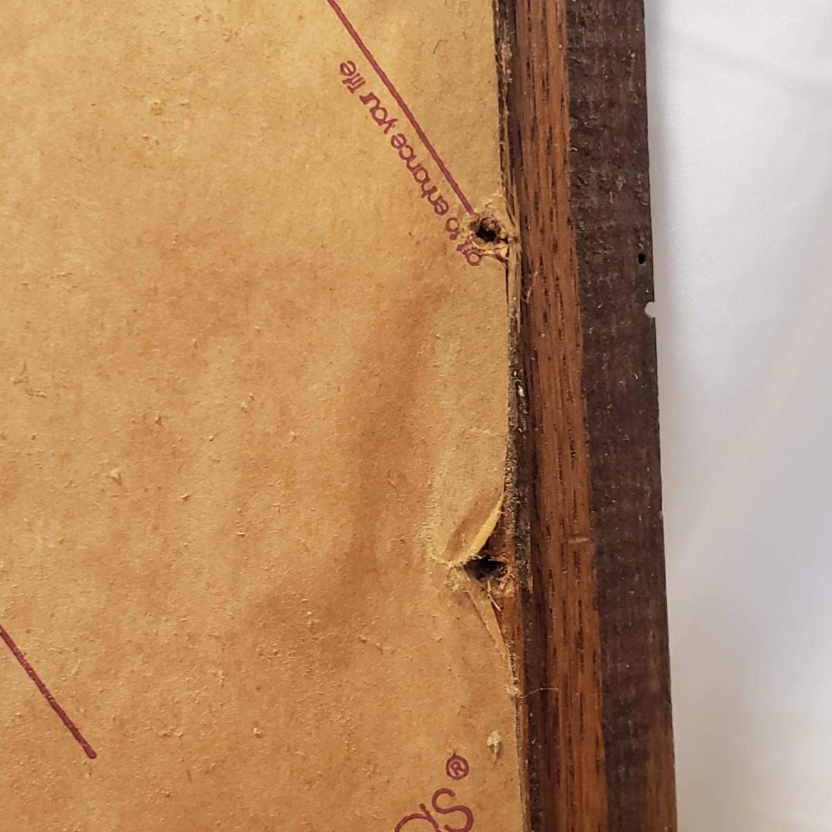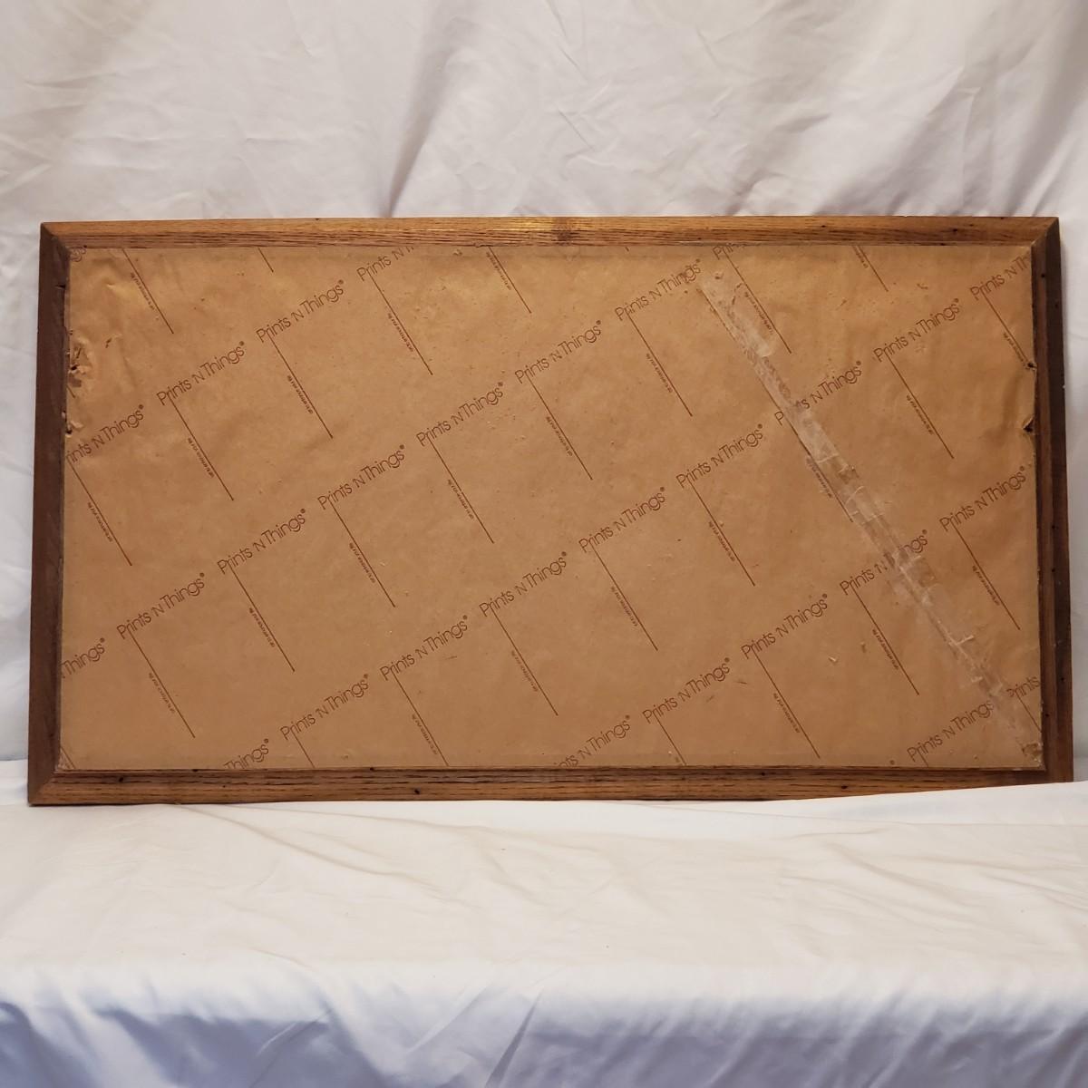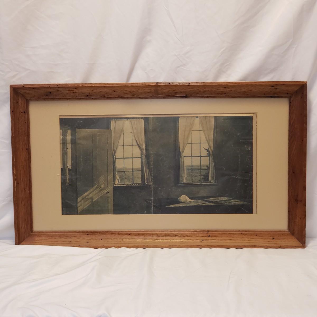 This piece appears to be a print of "The Big Room" by Andrew Wyeth. It appears to be in a wormy Chestnut frame, behind glass. The piece measures approximately 30" x 17" H. The back does not have hanging devices, but there are holes from what appears to be previous hanging materials. The print has a crease in the middle, see picture.