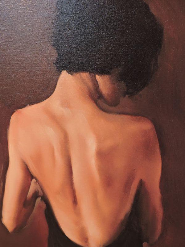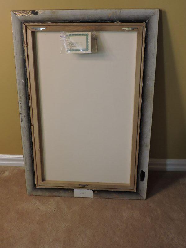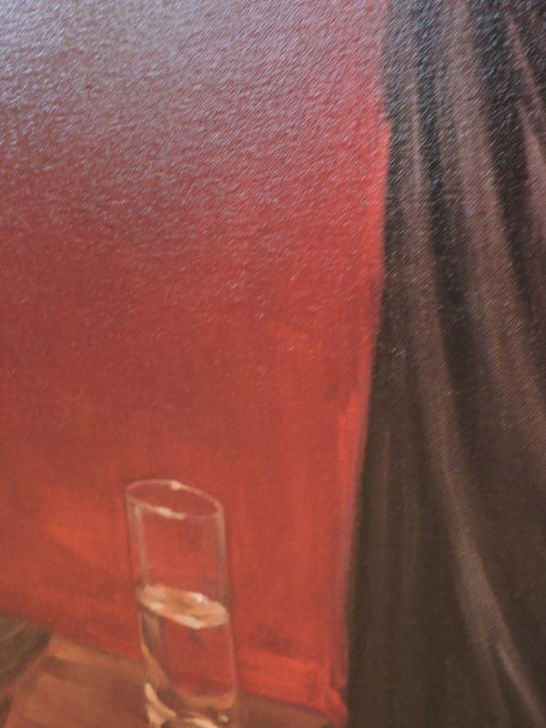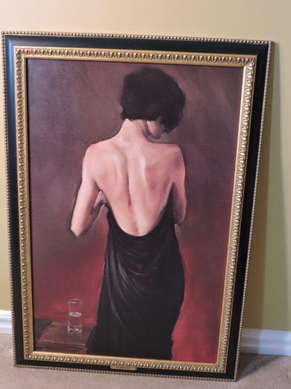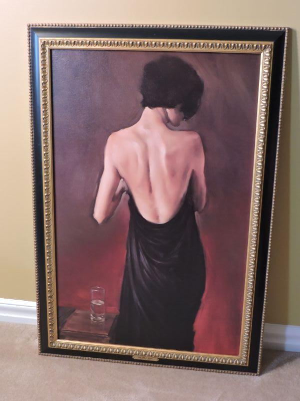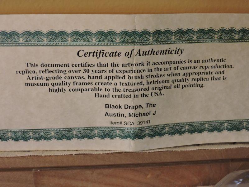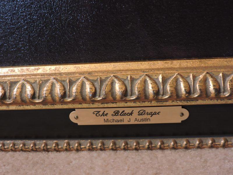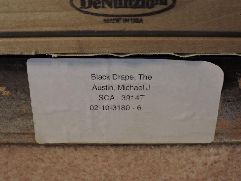 A giclée print on canvas, after artist Michael J. Austin’s original painting, The Black Drape. The print depicts a slender woman, as seen from the back, holding a black drapery panel around herself. The print is presented in an ornate black and gilded wood frame, which has a brass label affixed to the bottom with the title of the work and the artist’s name. Included with the framed print is a certificate of authenticity which is affixed to the back of the frame. Ready to hang. 25.5x37.5 Framed. **Please read Terms and Conditions before placing a bid. Pick up is Wednesday, September 25 from 4pm to 7pm and Saturday, September 28 from 9am to 1pm in Williamstown, NJ. All sales are final. All sales are as is, where is. Please review all photos. Any props included in photos are not included in listing. All measurements are approximate.