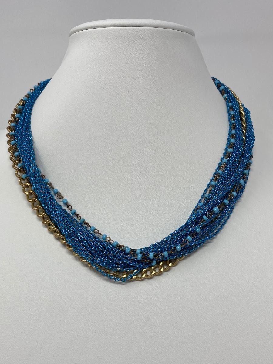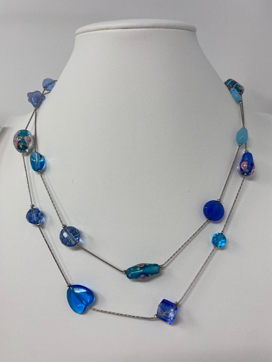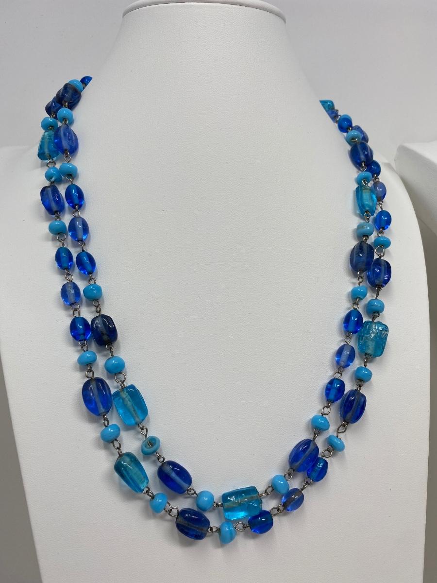 The Blue Necklace Lot Includes a Layered Costume Necklace, a Glass Bead Necklace, and a Cookie Lee Glass Art Necklace