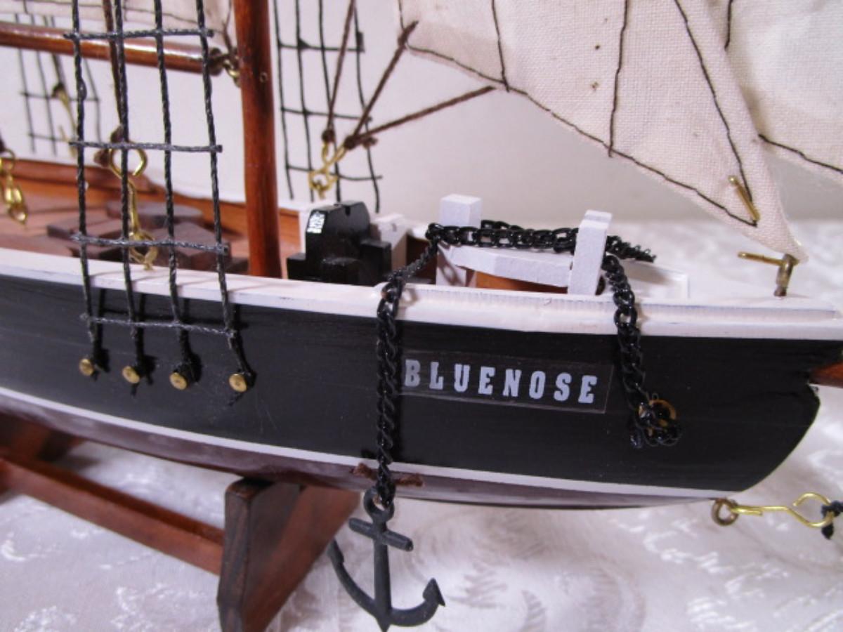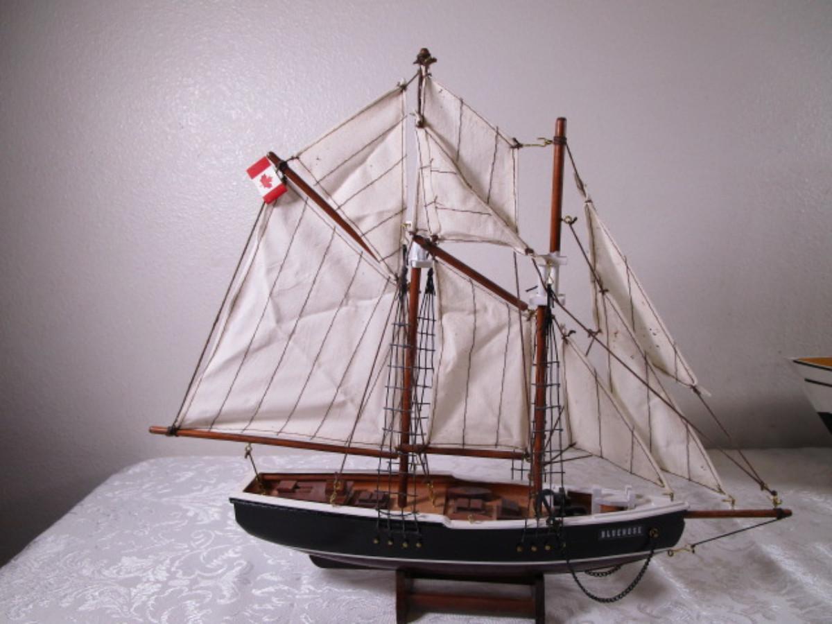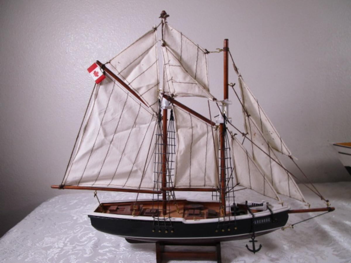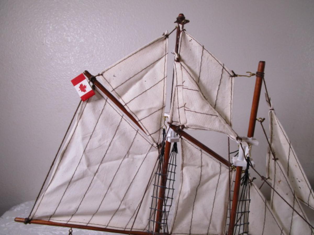 Has Canadian flag & multiple sails & 2 anchors, 14" tall x 14" long