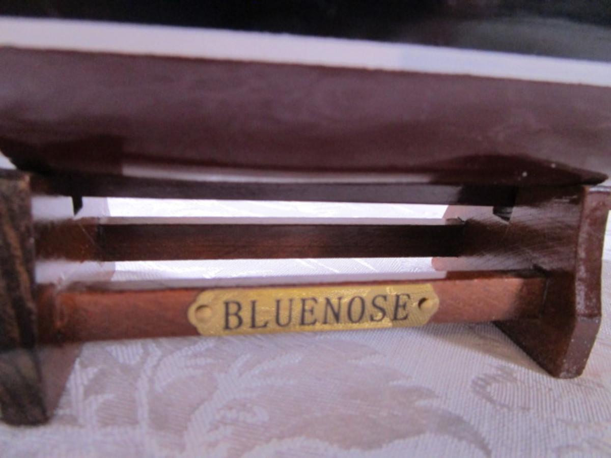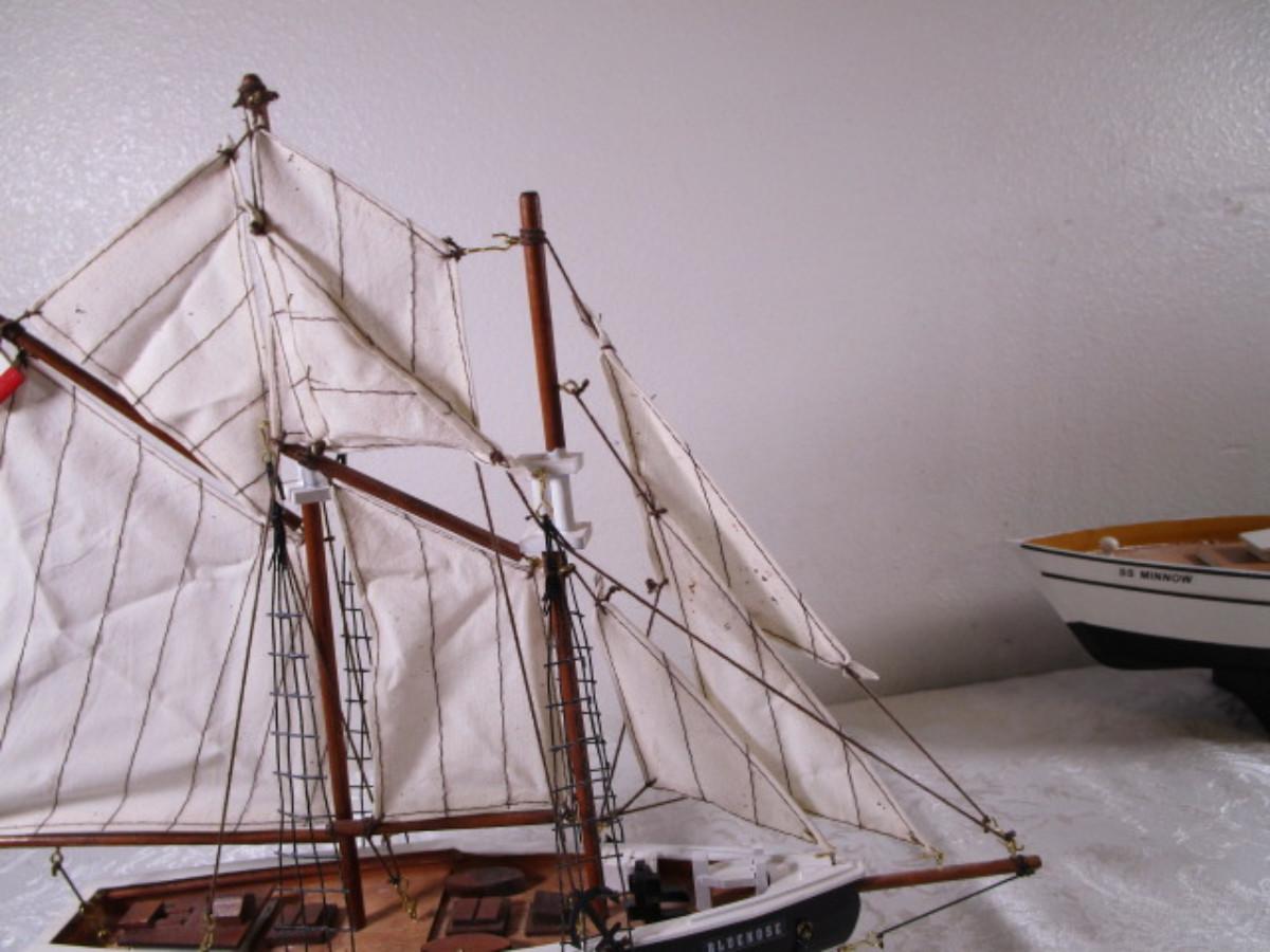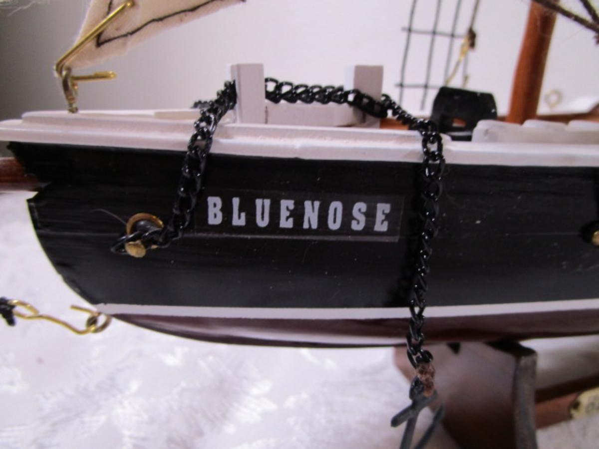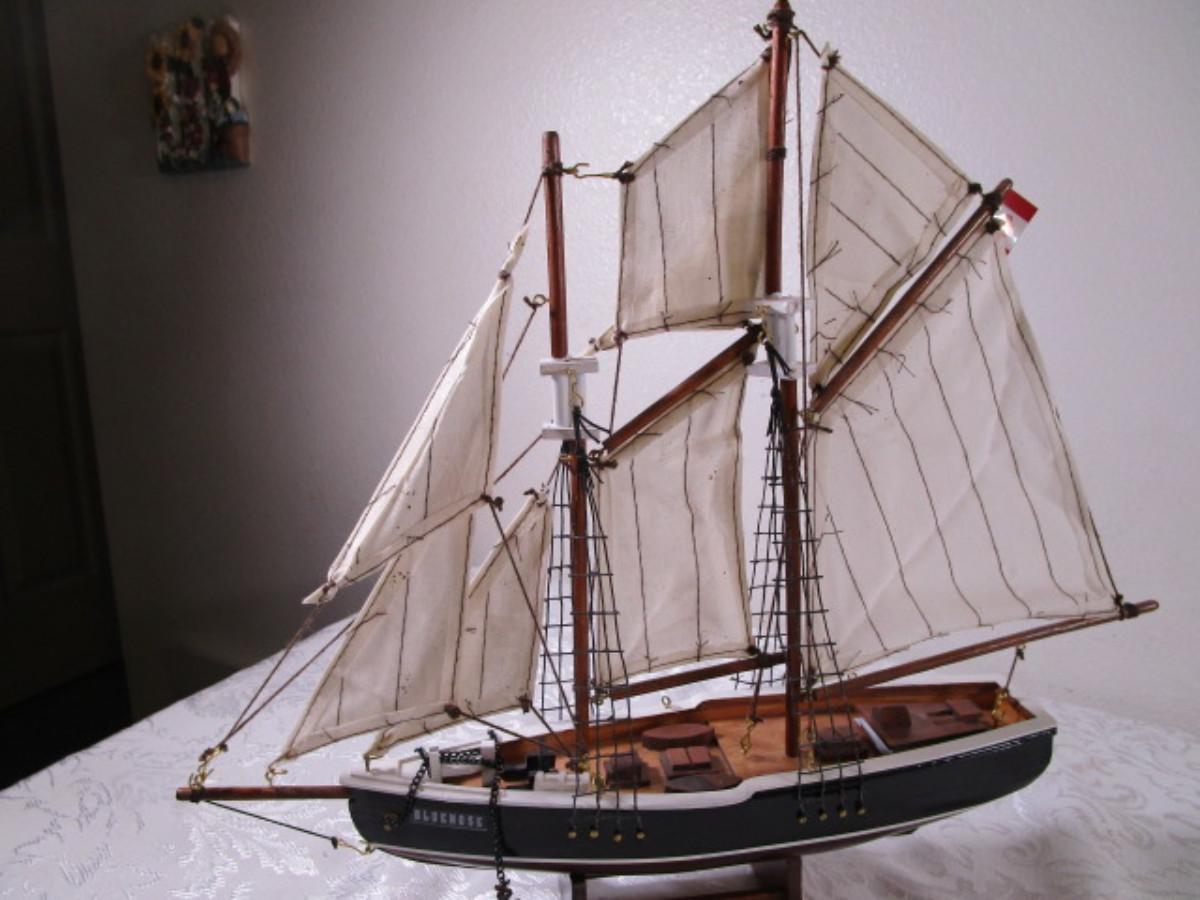 Has Canadian flag & multiple sails & 2 anchors, 14" tall x 14" long