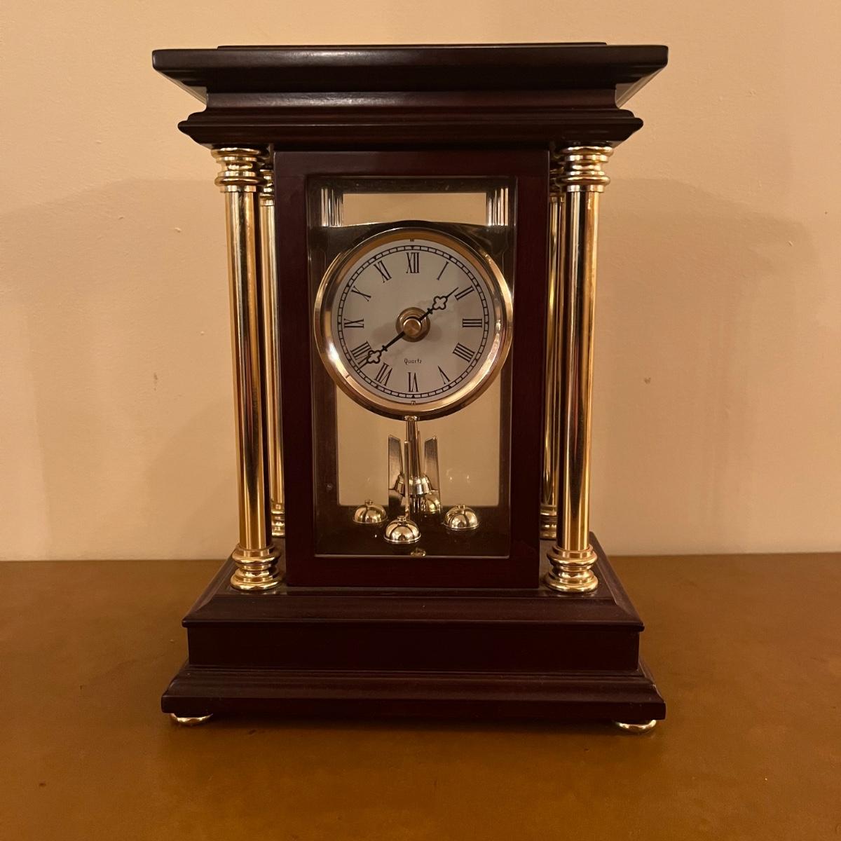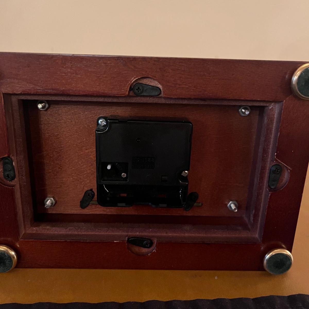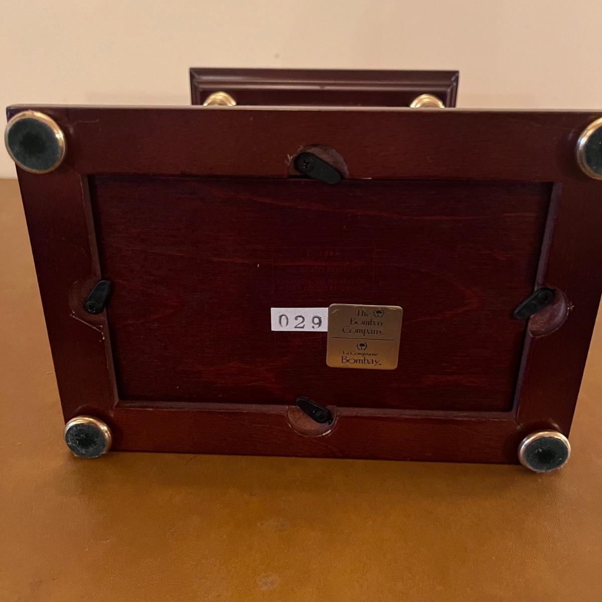 Lot includes a wooden clock by The Bombay Company that measures 5” x 7” x 9.5”. Clock needs battery so was not tested.