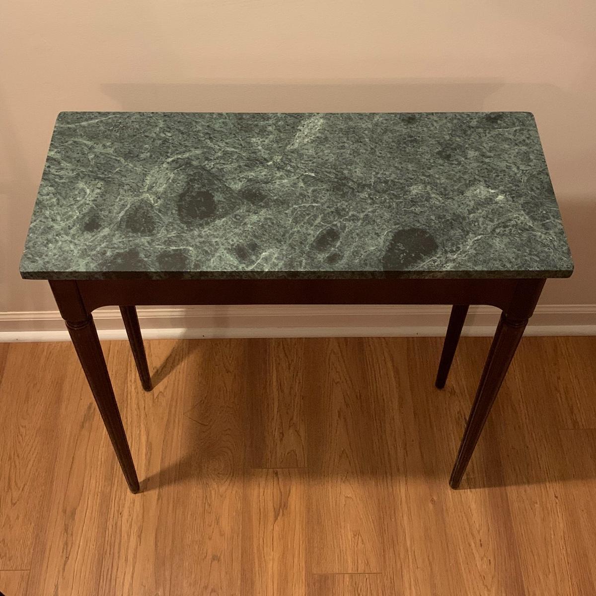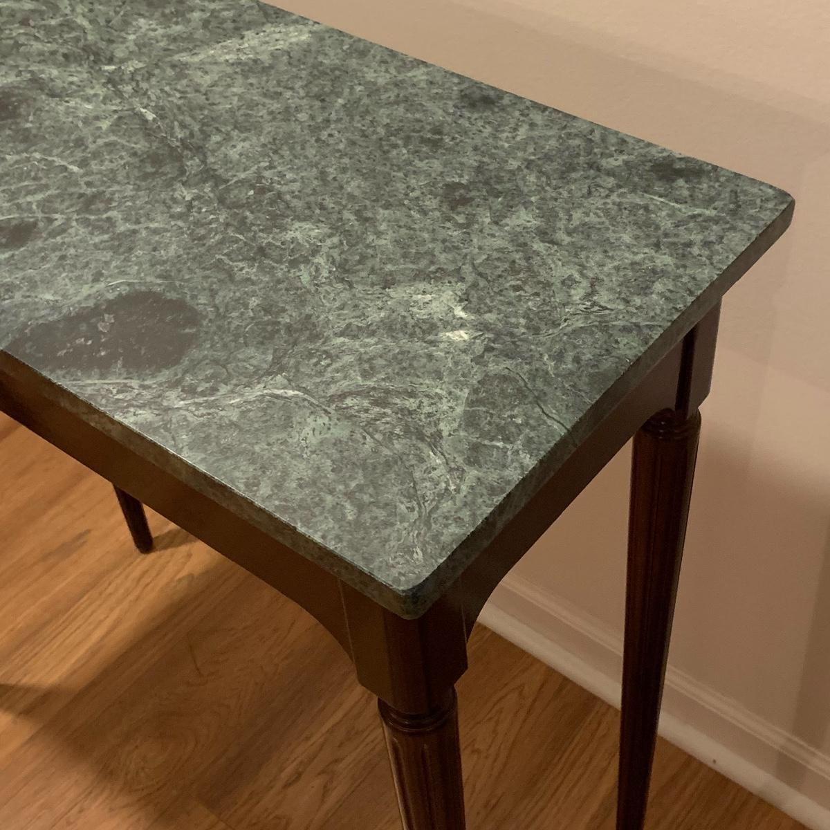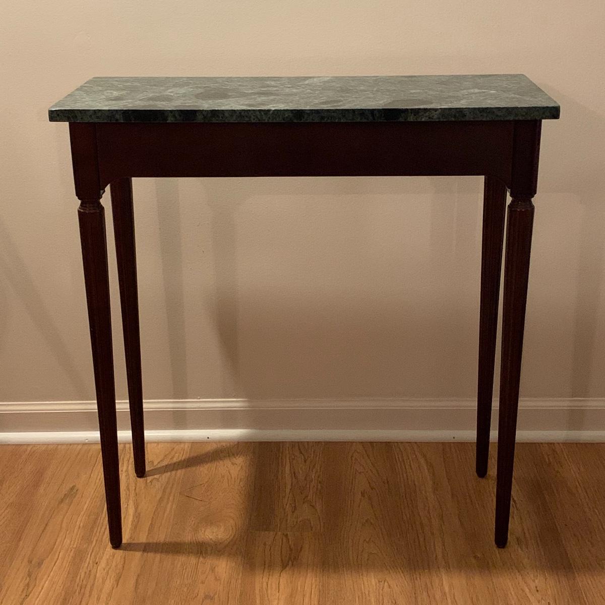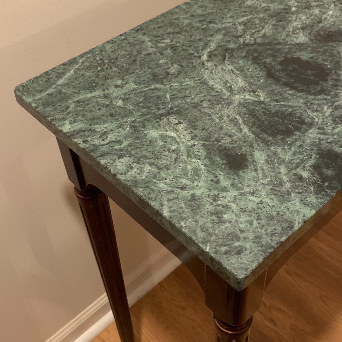 This is a The Bombay Company side table with a wooden base and fluted tapered wooden legs. The tabletop is a beautiful green faux marble. The table appears to be in very good and sturdy condition. It measures 27” x 11.75” x 27.5”. Local Pickup Only