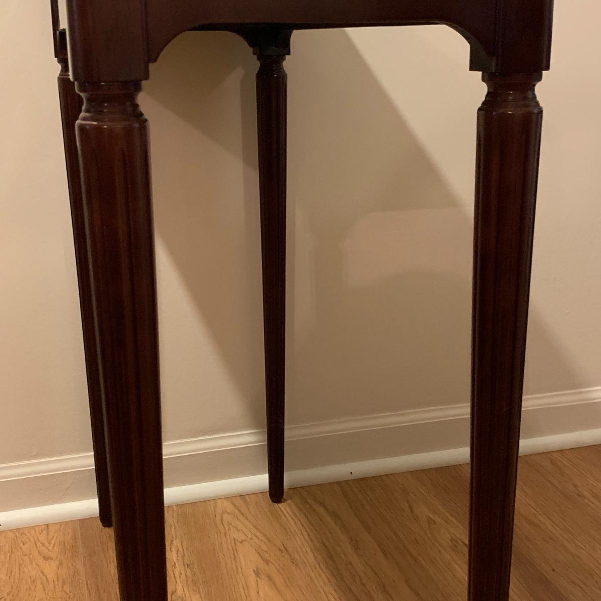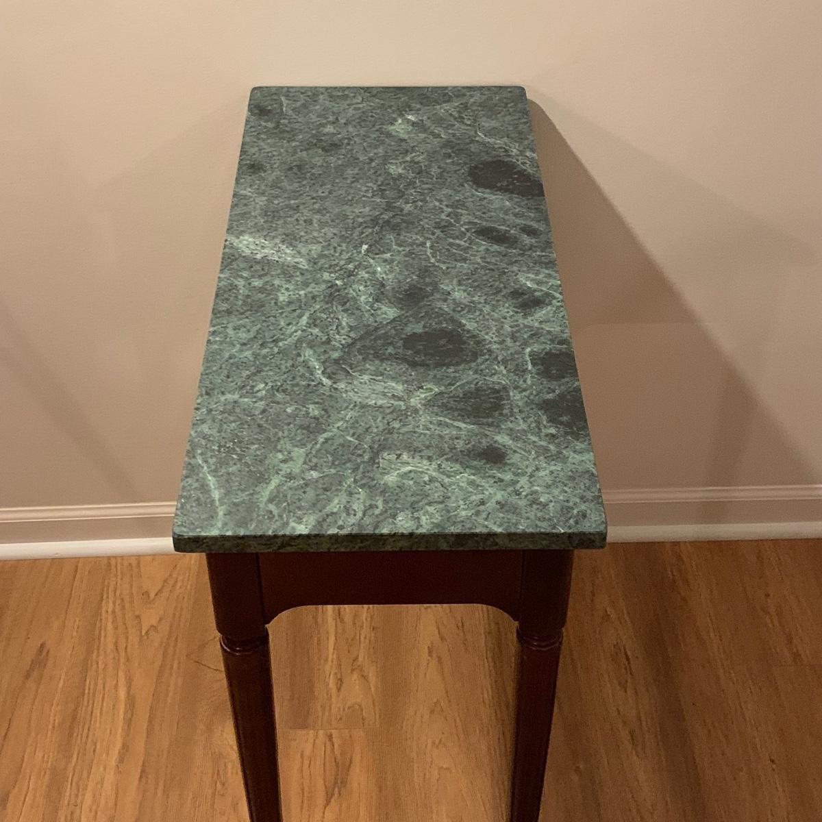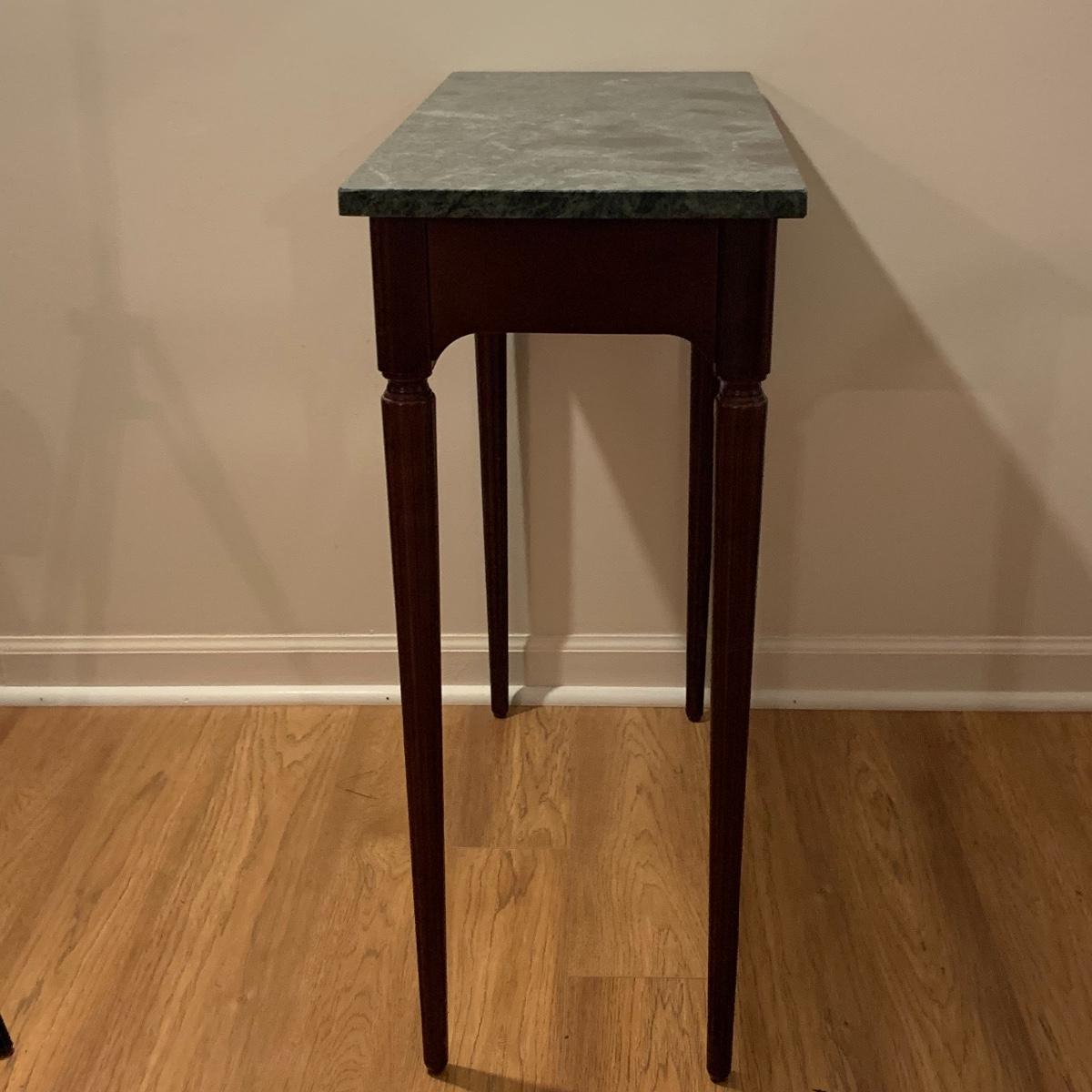 This is a The Bombay Company side table with a wooden base and fluted tapered wooden legs. The tabletop is a beautiful green faux marble. The table appears to be in very good and sturdy condition. It measures 27” x 11.75” x 27.5”. Local Pickup Only