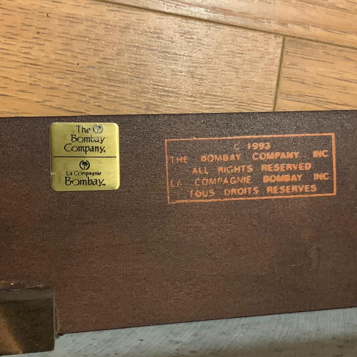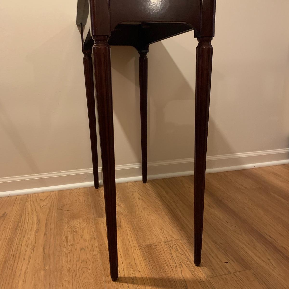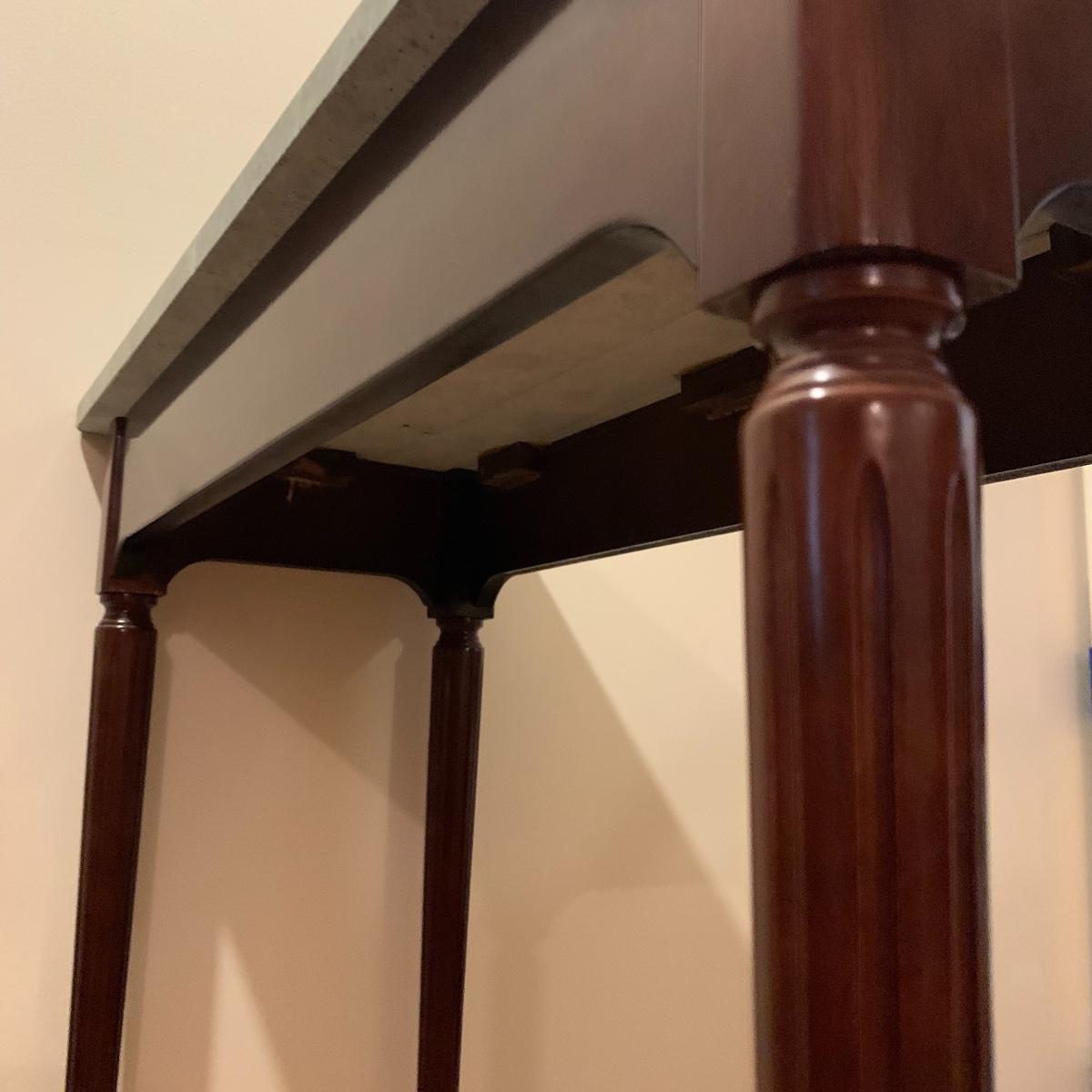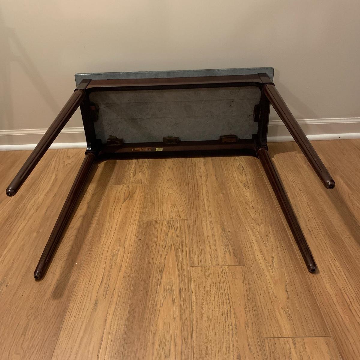 This is a The Bombay Company side table with a wooden base and fluted tapered wooden legs. The tabletop is a beautiful green faux marble. The table appears to be in very good and sturdy condition. It measures 27” x 11.75” x 27.5”. Local Pickup Only