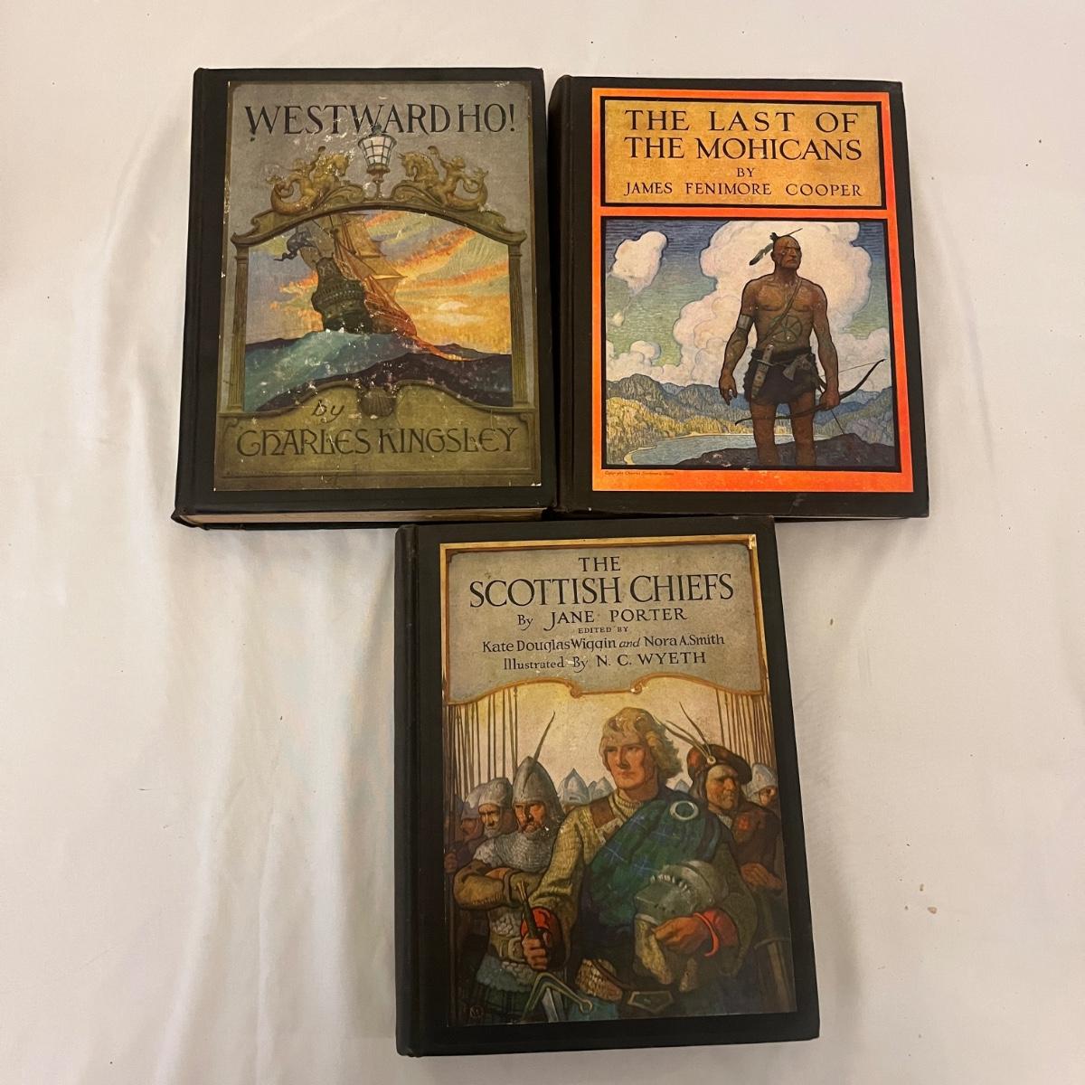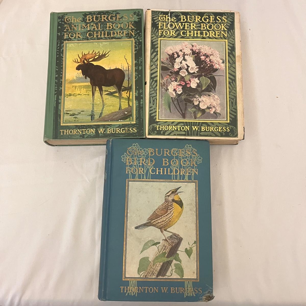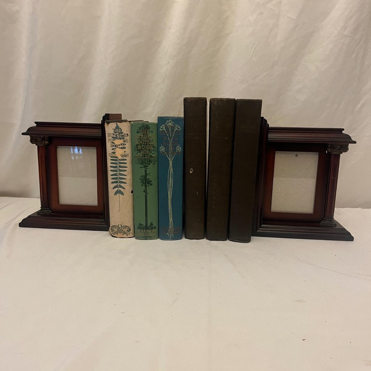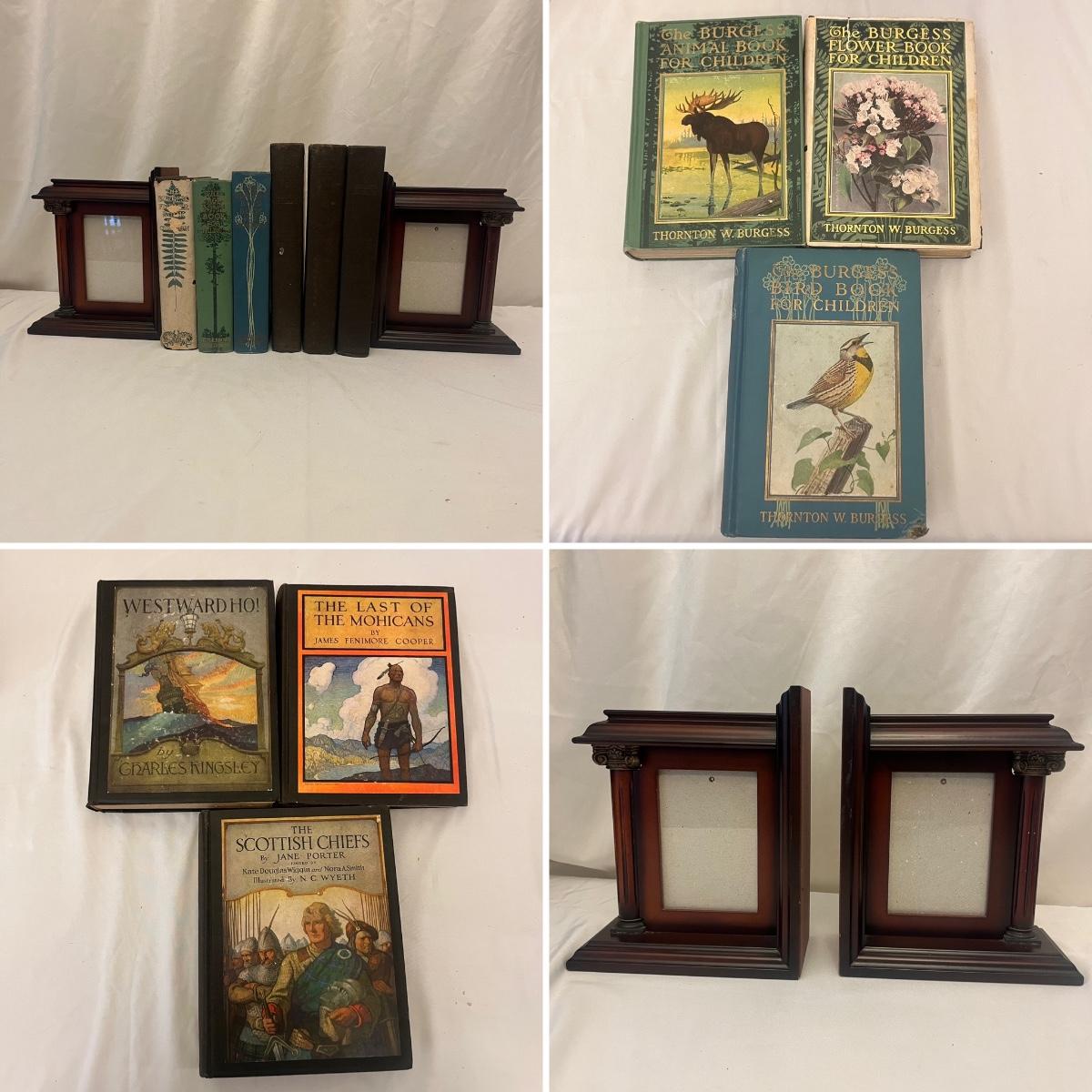 Lot includes The Burgess Flower Book for Children, The Burgess Bird Book for Children, The Burgess Animal Book for Children that all appear to be first editions, two wooden bookends with picture frames built in and Westward Ho, The Scottish Chiefs and The Last of the Mohicans books. Book have some wear and two Burgess books are missing paper cover, see pictures. Bookends measure 7” x 3.25” x 8.5”H.