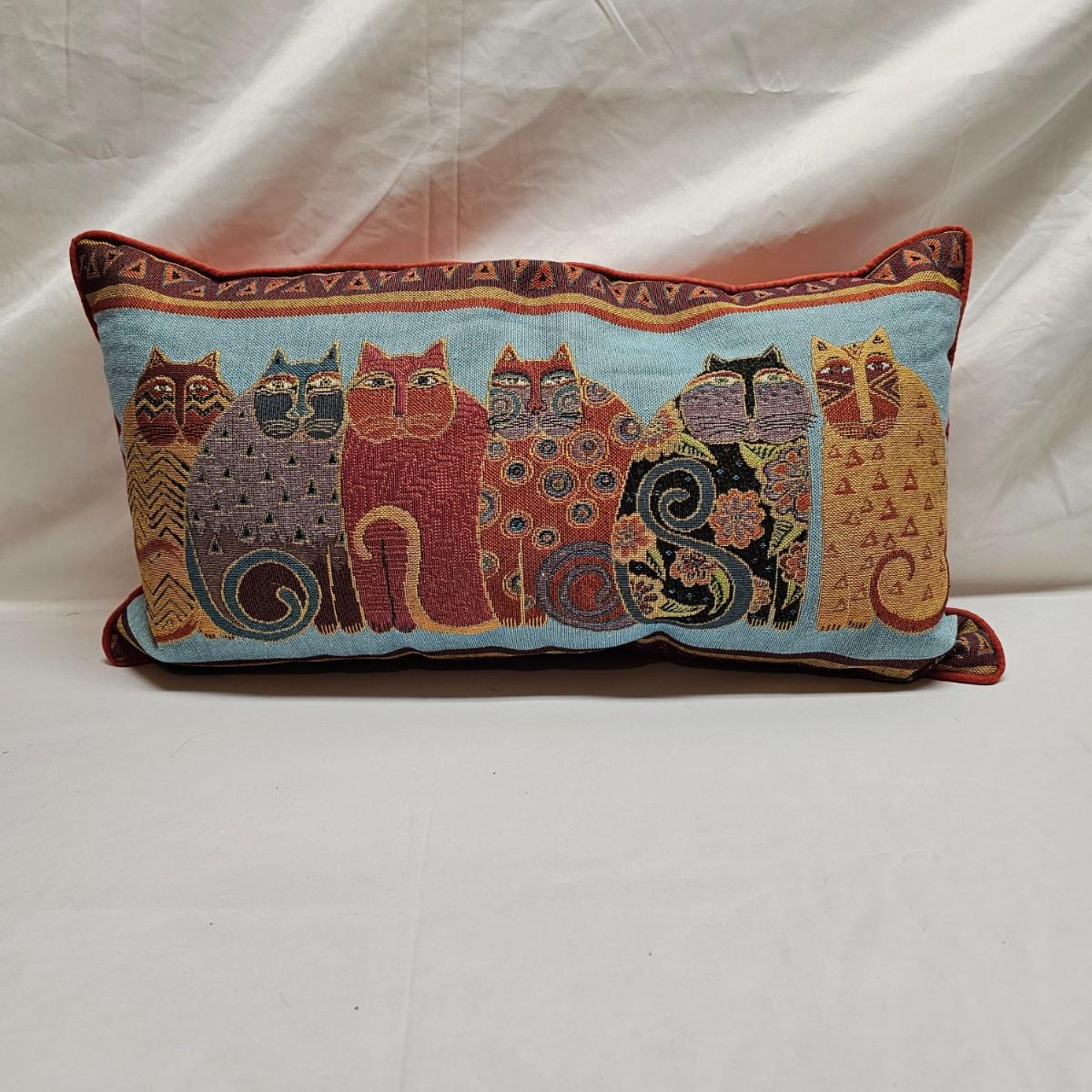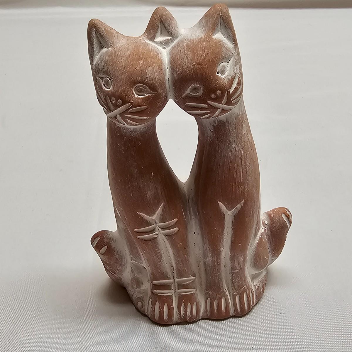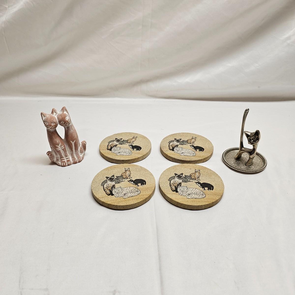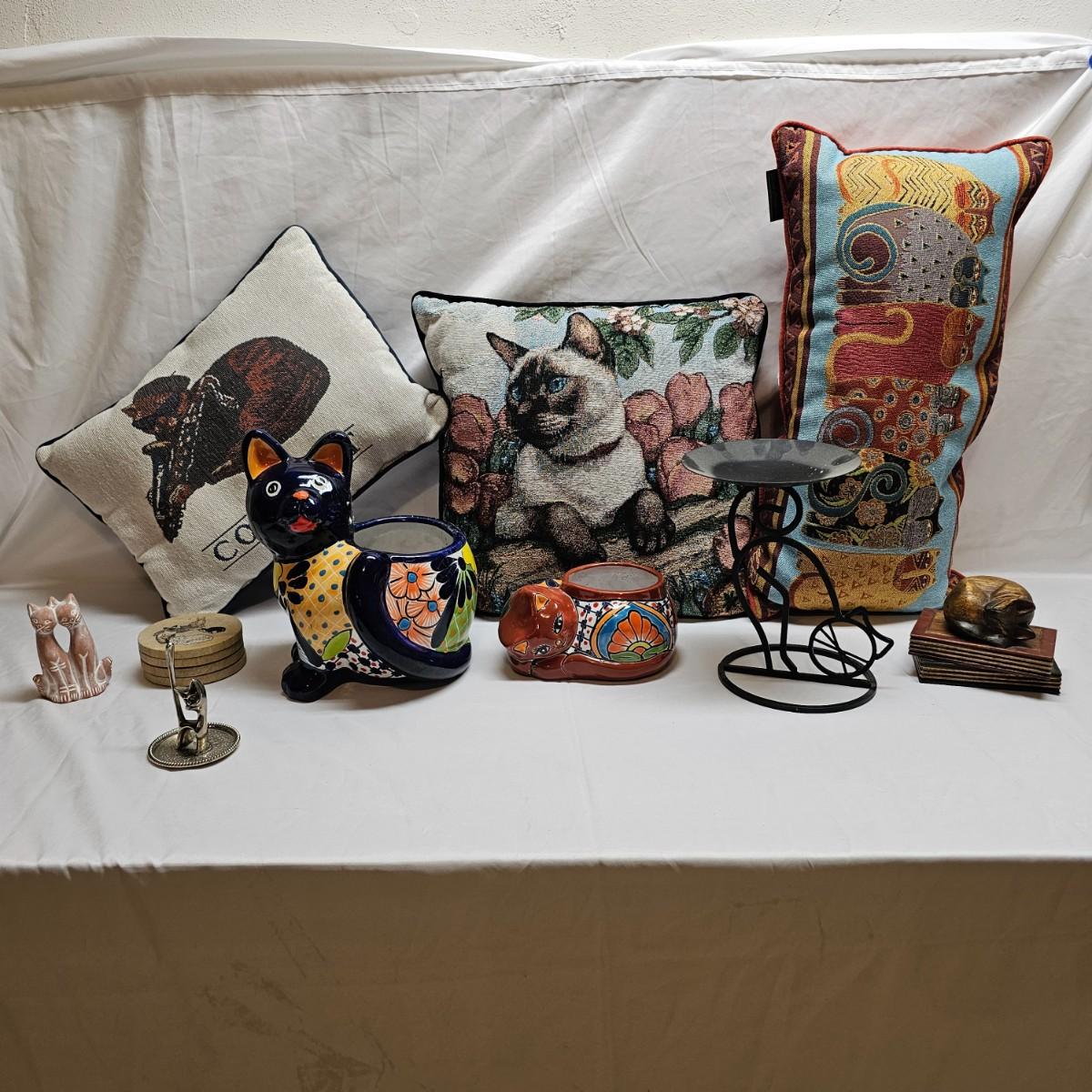 Pottery, pillows, coasters and more. Three different sizes and images of cats on pillows, longest item is 21" x 5" x 10"H. Blue pottery cat planter has crackles on outside glaze, was made in Mexico and measures 8.5" x 8" x 10"H. Four sandstone coasters, a twosome of terra cotta cats and a silver plate cat jewelry holder from England. See photos for details. Shipping available.