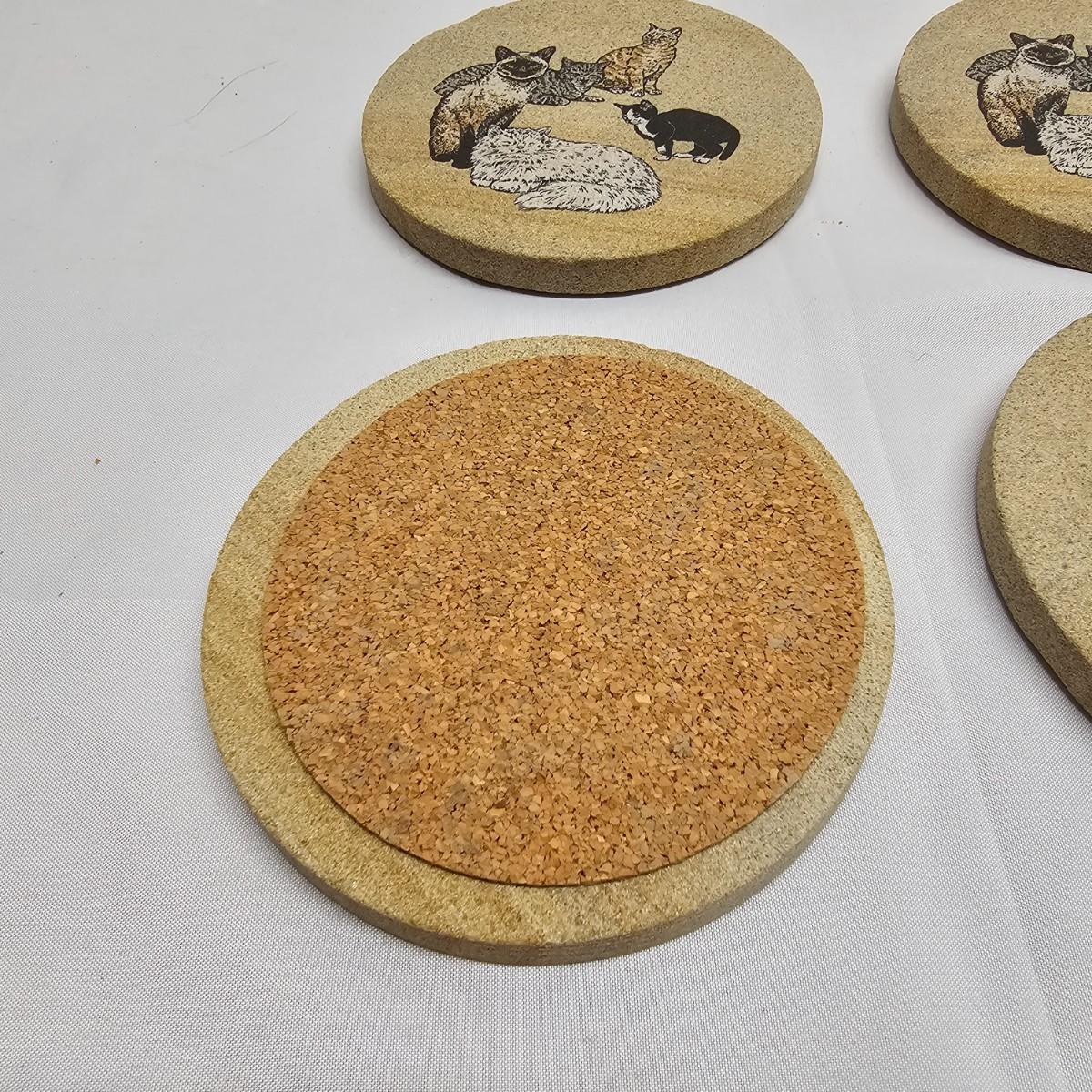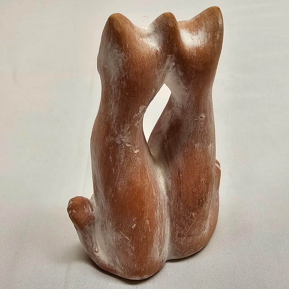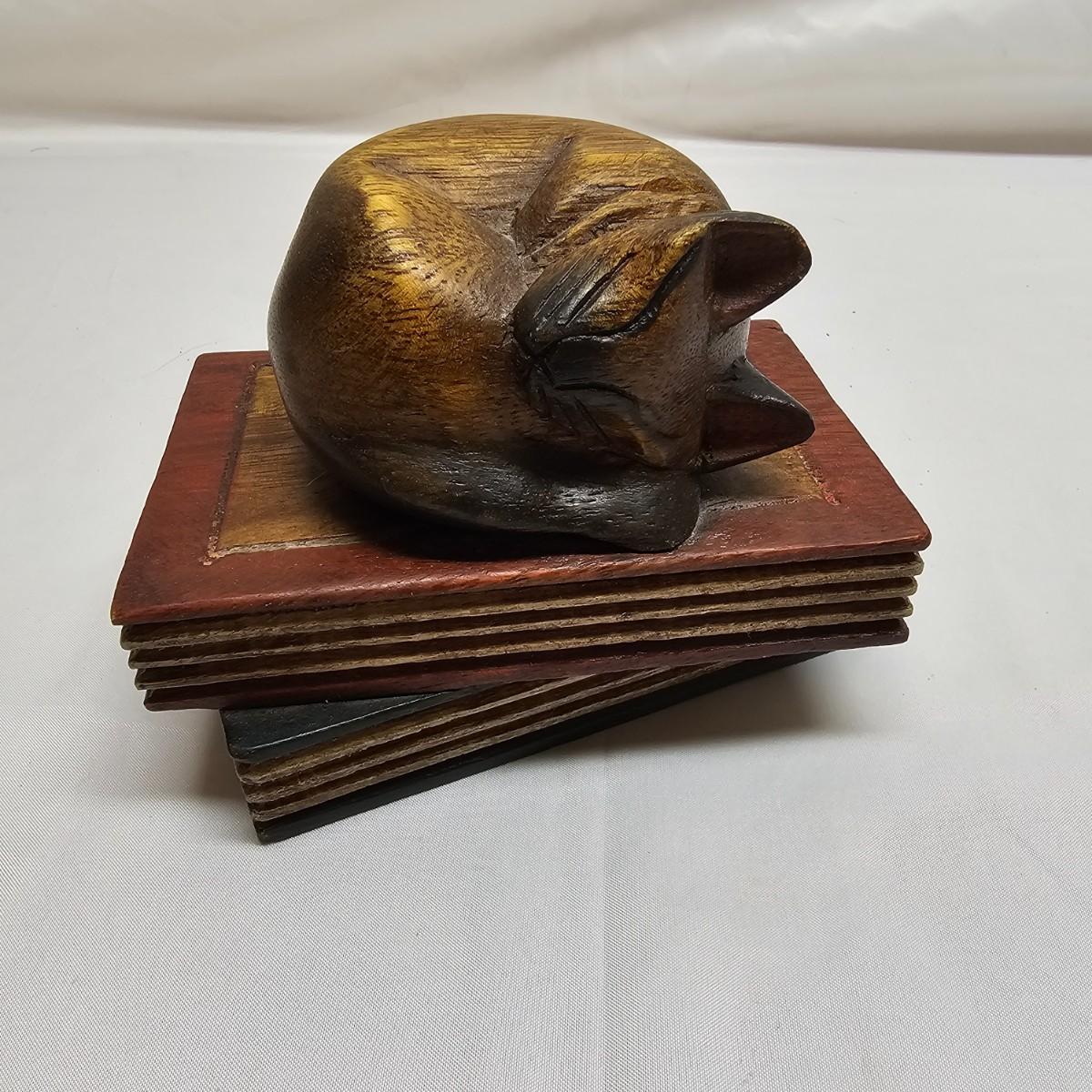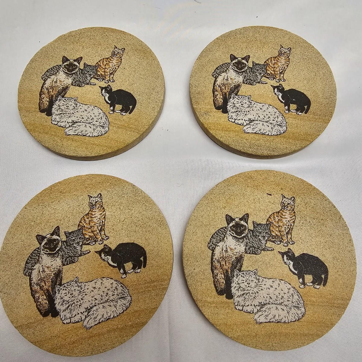 Pottery, pillows, coasters and more. Three different sizes and images of cats on pillows, longest item is 21" x 5" x 10"H. Blue pottery cat planter has crackles on outside glaze, was made in Mexico and measures 8.5" x 8" x 10"H. Four sandstone coasters, a twosome of terra cotta cats and a silver plate cat jewelry holder from England. See photos for details. Shipping available.