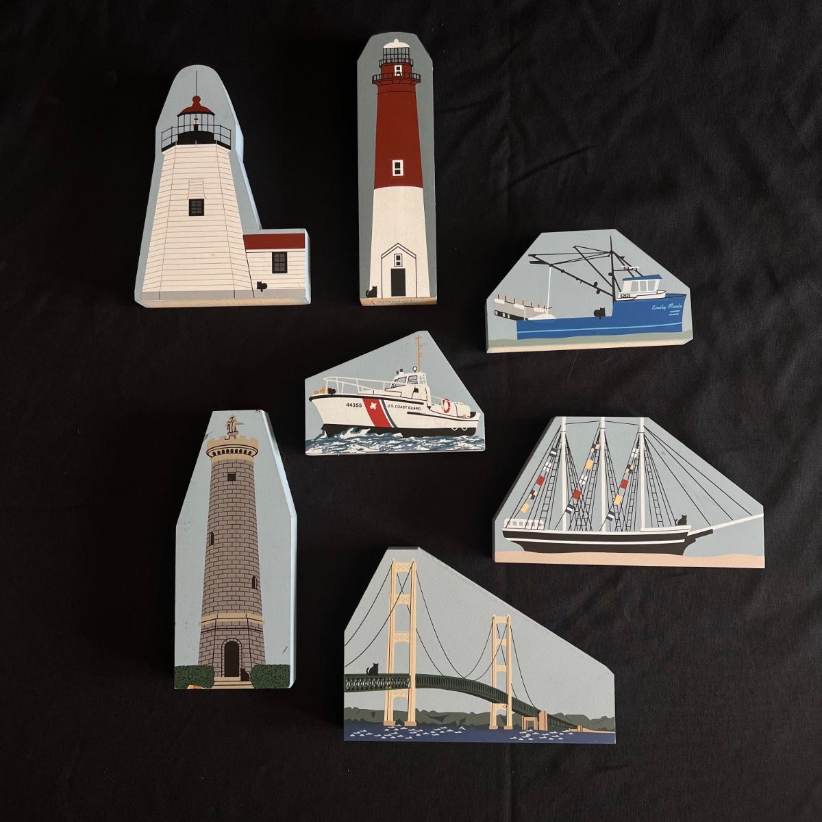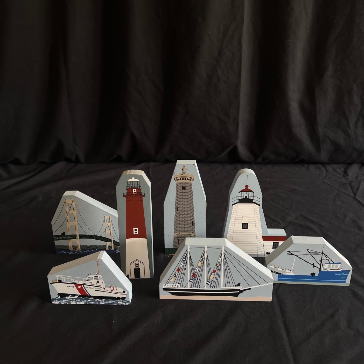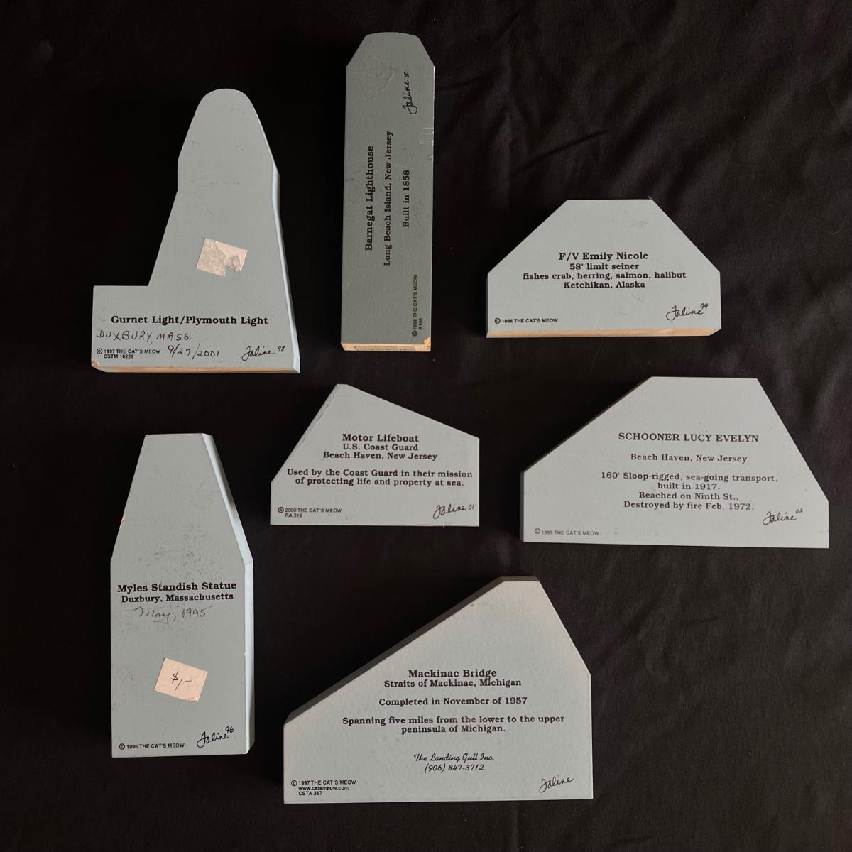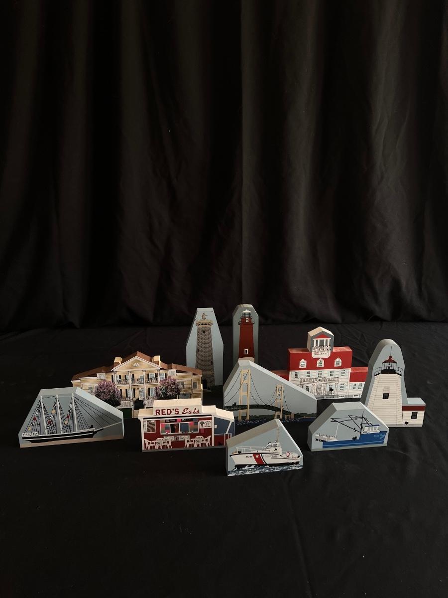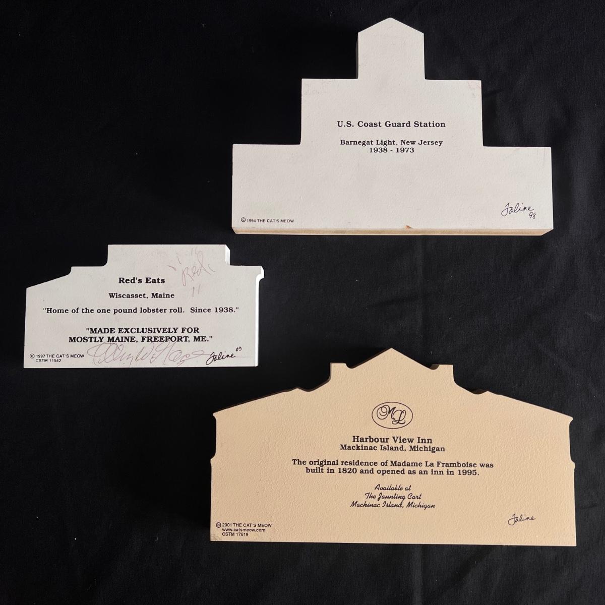 This lot contains 10 pieces, all from “The Cat’s Meow” village and sailing series by Jaline. Note the Red’s Eats appears to be a signed piece by someone. Each piece has a unique painting of buildings, boats, bridges, lighthouses, and more from different states. Largest piece measures 7.25” x 6.25”H (Coast Guard Red building). See other lots for more Jaline village collections. Shipping available.