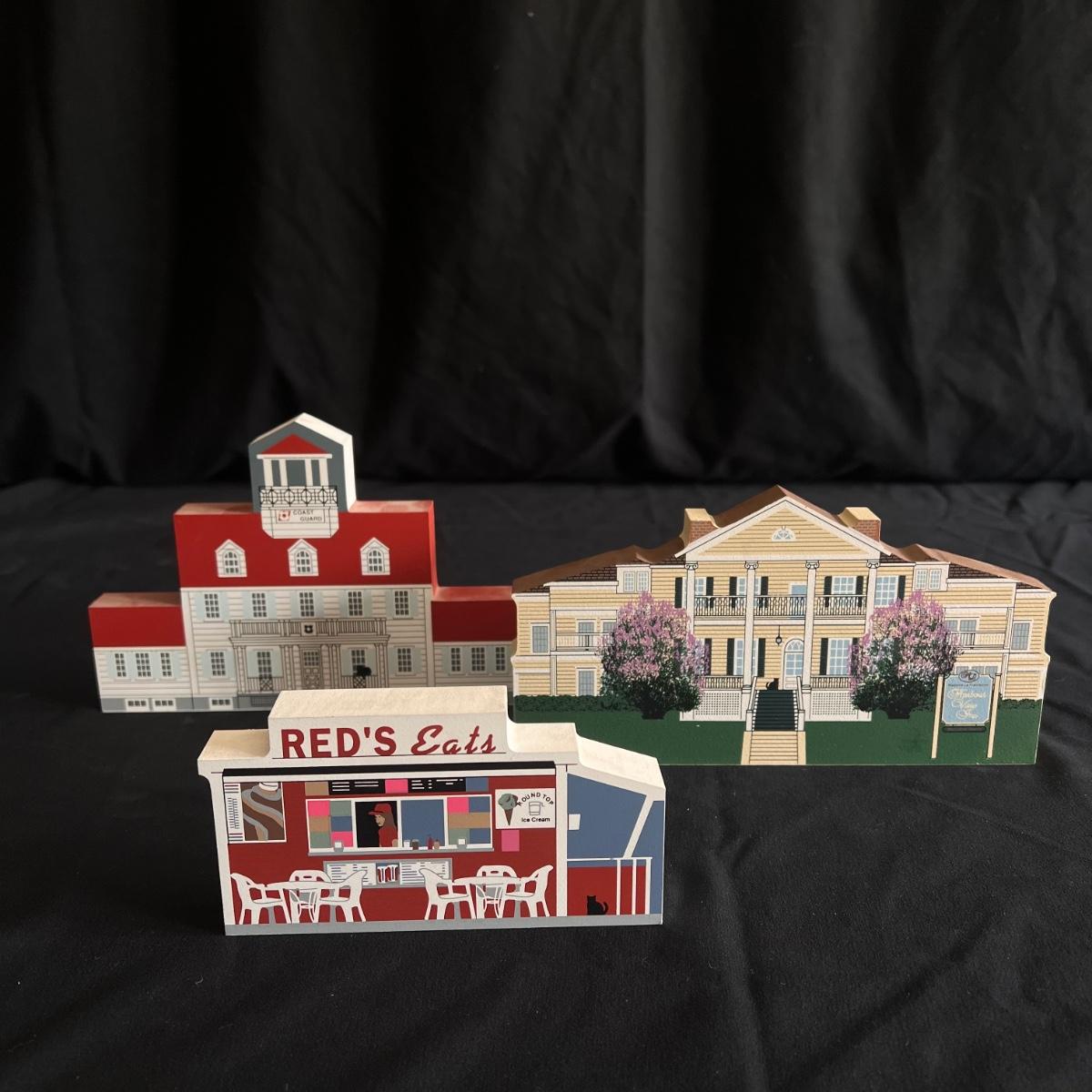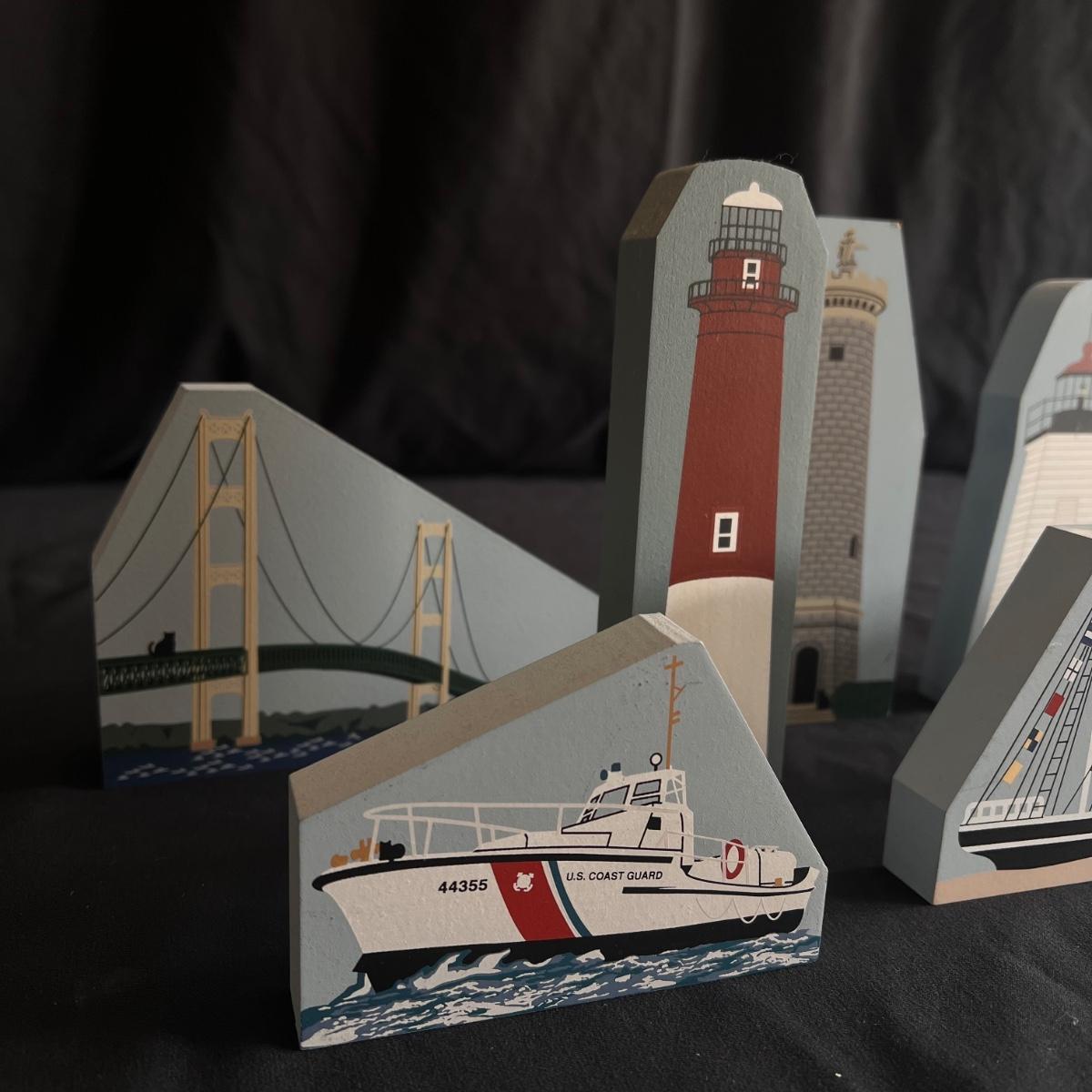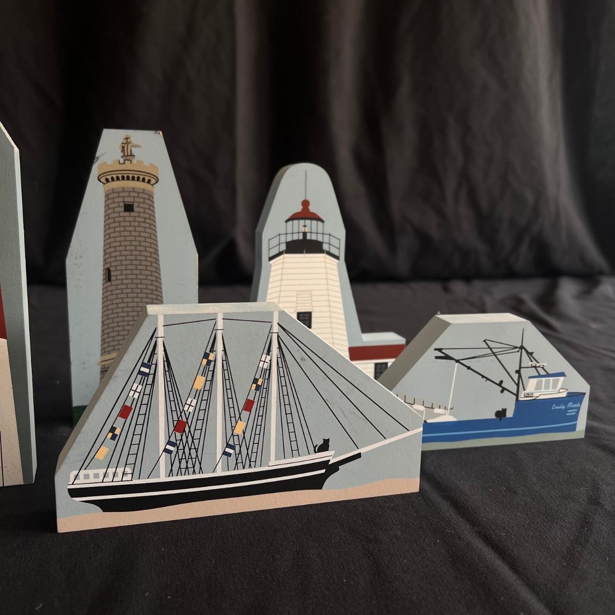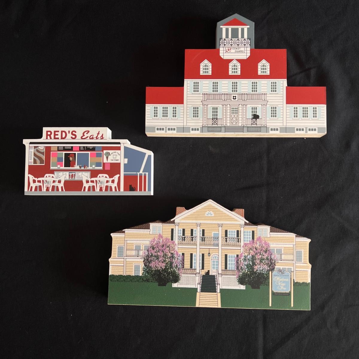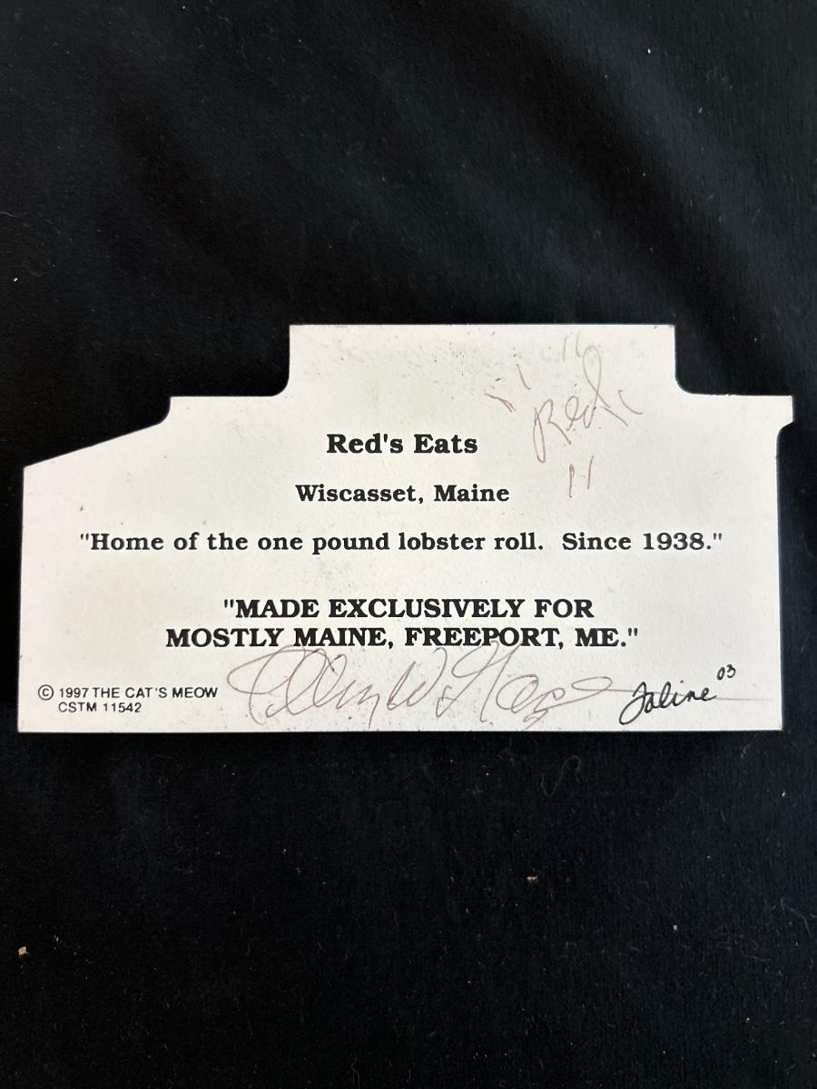 This lot contains 10 pieces, all from “The Cat’s Meow” village and sailing series by Jaline. Note the Red’s Eats appears to be a signed piece by someone. Each piece has a unique painting of buildings, boats, bridges, lighthouses, and more from different states. Largest piece measures 7.25” x 6.25”H (Coast Guard Red building). See other lots for more Jaline village collections. Shipping available.
