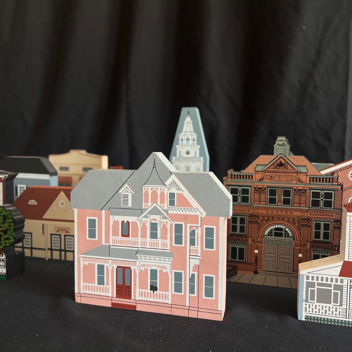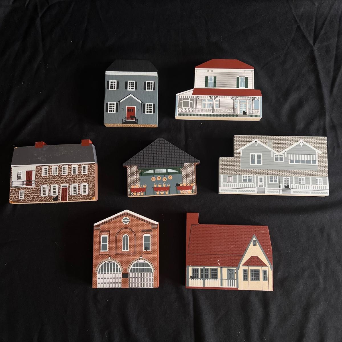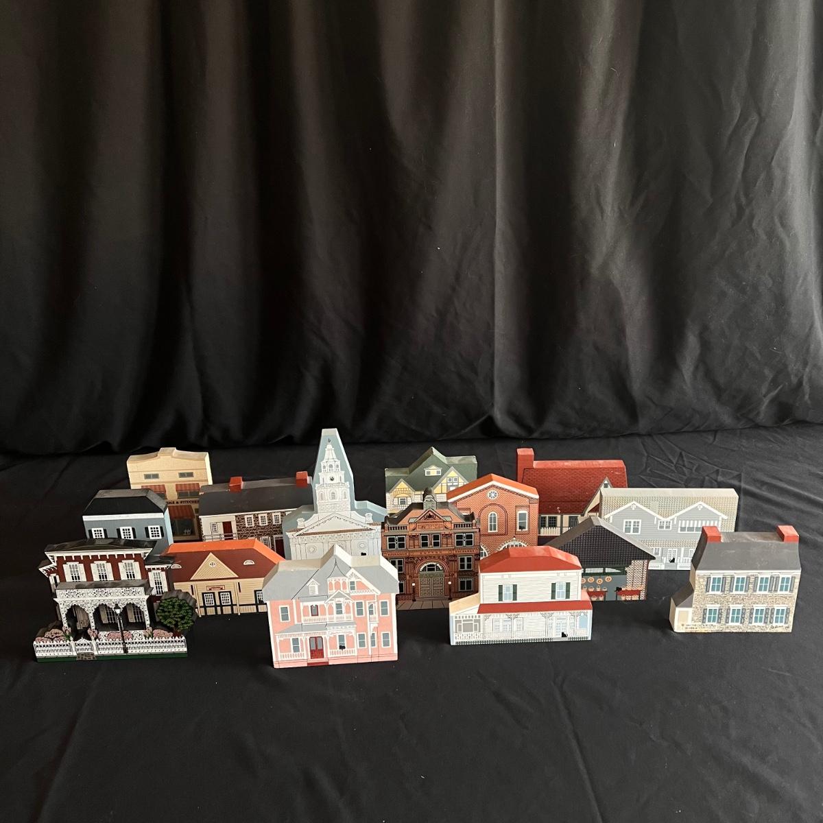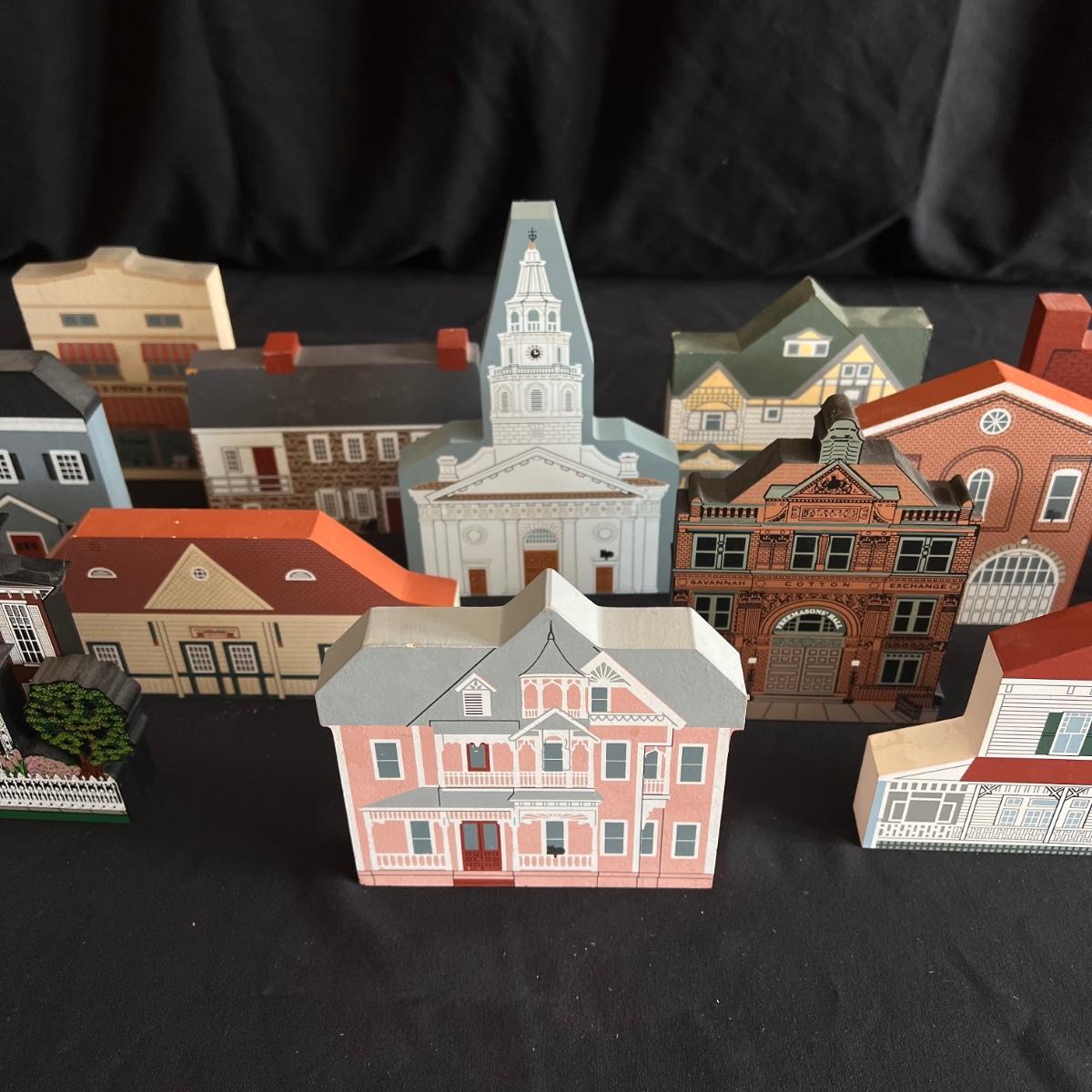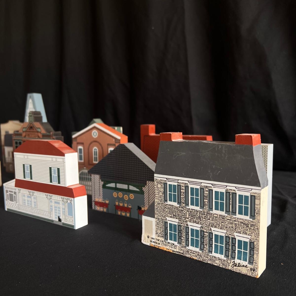 This lot contains 15 pieces with 10 being from “The Cat’s Meow” village series by Jaline. Each piece has a unique painting of buildings from different southern states. Largest piece measures 7.5”x 7”H. A few blemishes on back bottoms where moisture maybe got to them. See other lots for more Jaline village collections. Shipping available.