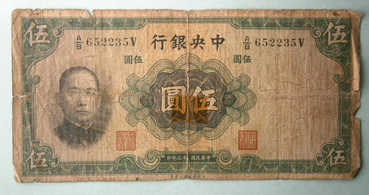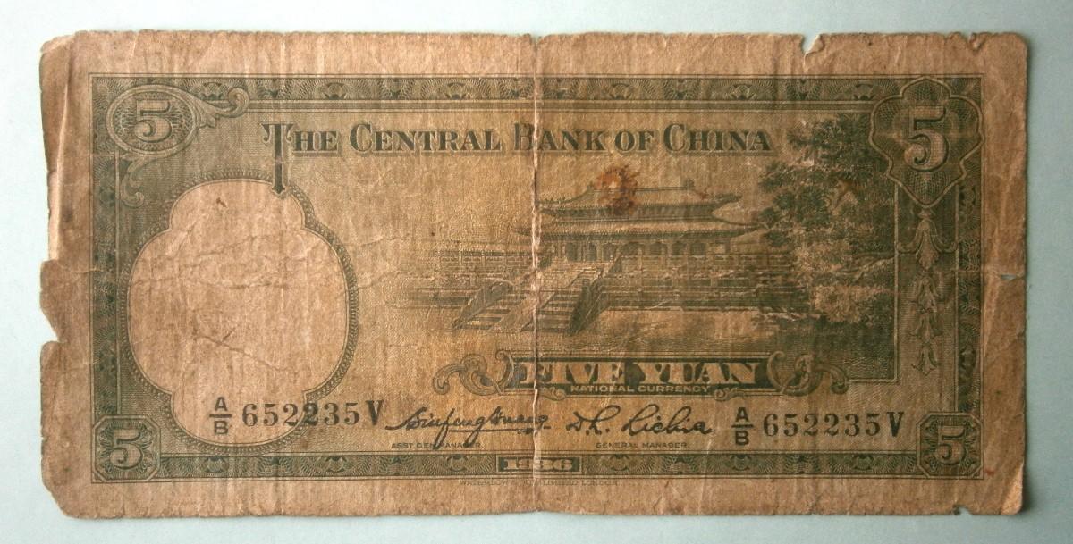 THE CENTRAL BANK OF CHINA 1930'S FIVE YUAN Banknote