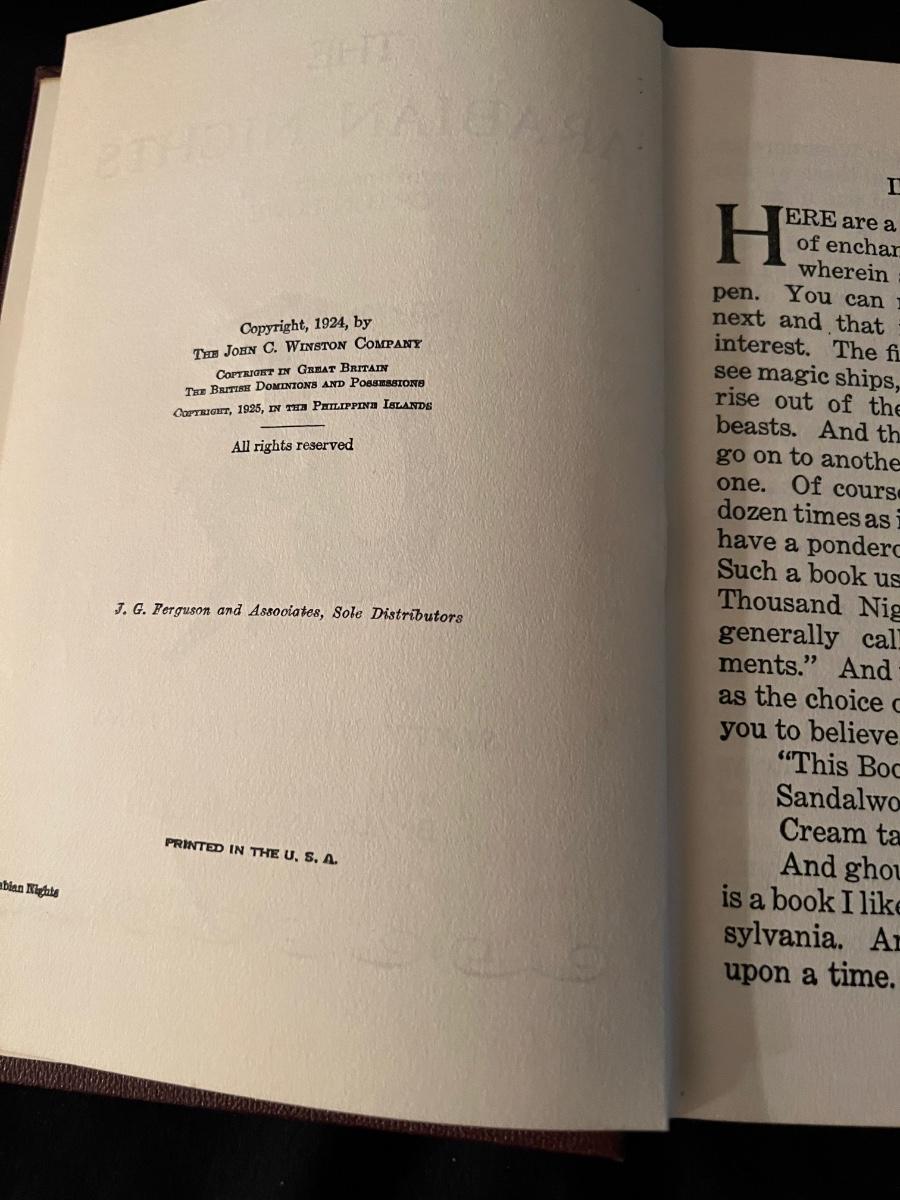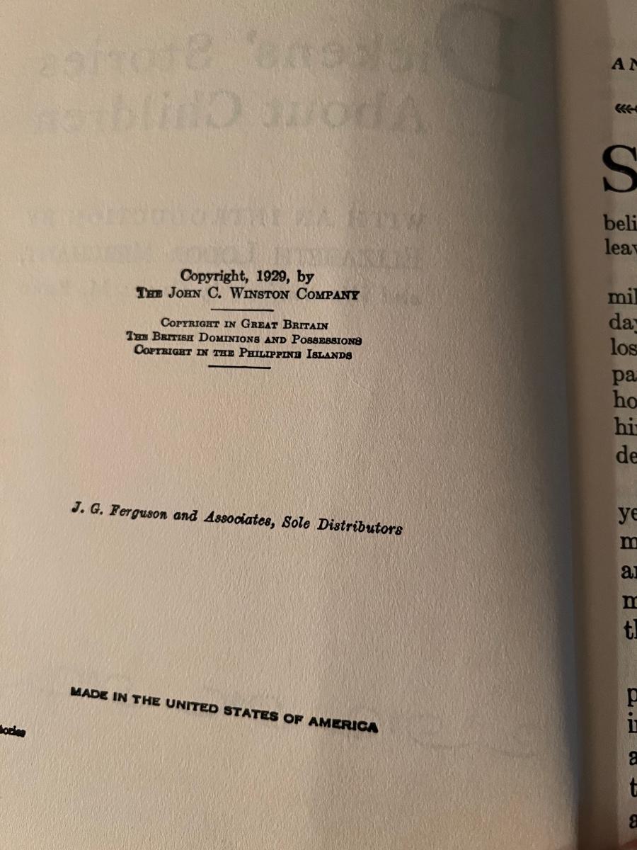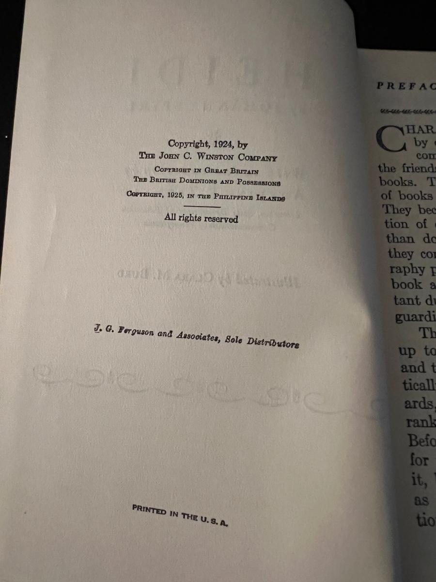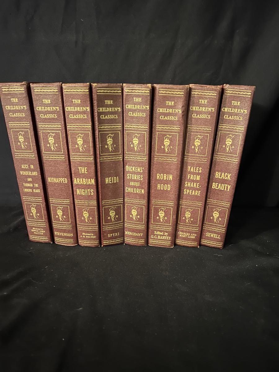 Children’s Classics Hardcovers published by The John C. Winston Company. All books have extra large type, are illustrated and include colored plates (full-page artwork.) 1. The Arabian Nights, 1924, with intro by Orton Lowe; 257 pgs. 2. Black Beauty, 1927 by Anna Sewell; 297 pgs. 3. Dickens' Stories About Children, 1929, with intro by Elizabeth Lodor Merchant; 274 pgs. 4. Heidi, 1924, by Johanna Spyri; 278 pgs. 5. Kidnapped, 1925, by Robert Louis Stevenson; 340 pgs. 6. Robin Hood, 1923, with intro by George Cockburn Harvey; 344 pgs. 7. Tales from Shakespeare, 1924, by Charles and Mary Lamb; 311 pgs. 8 Alice in Wonderland and Through the Looking Glass, 1923, by Lewis Carroll.