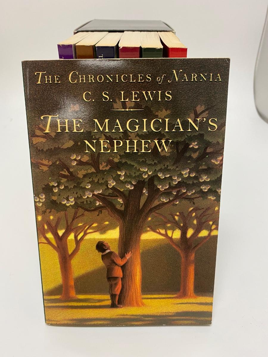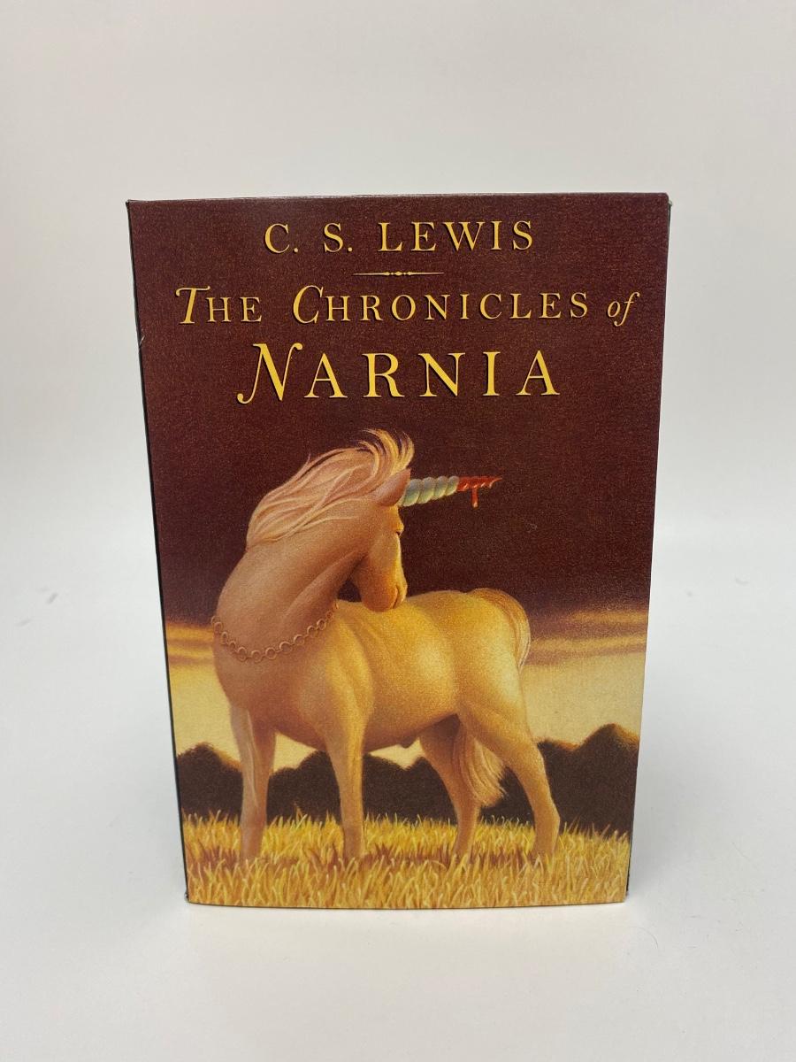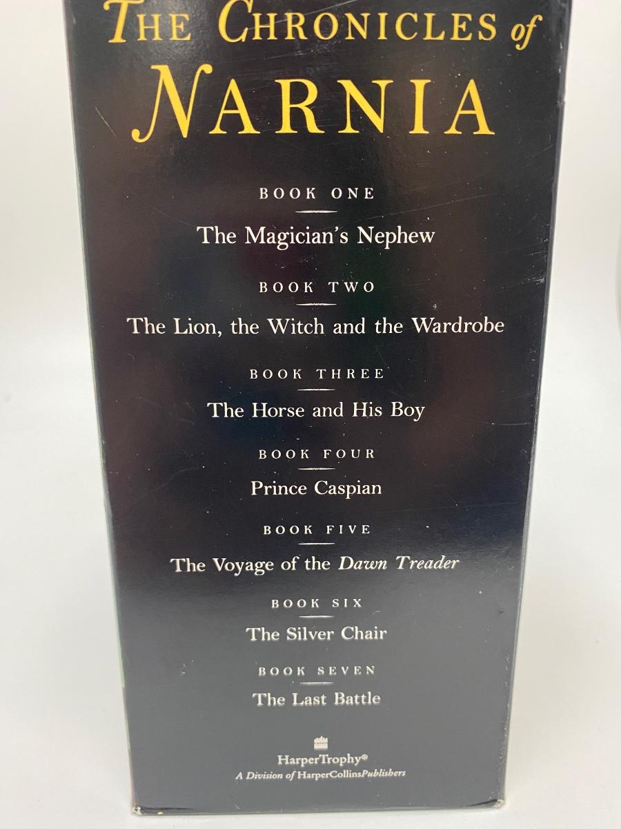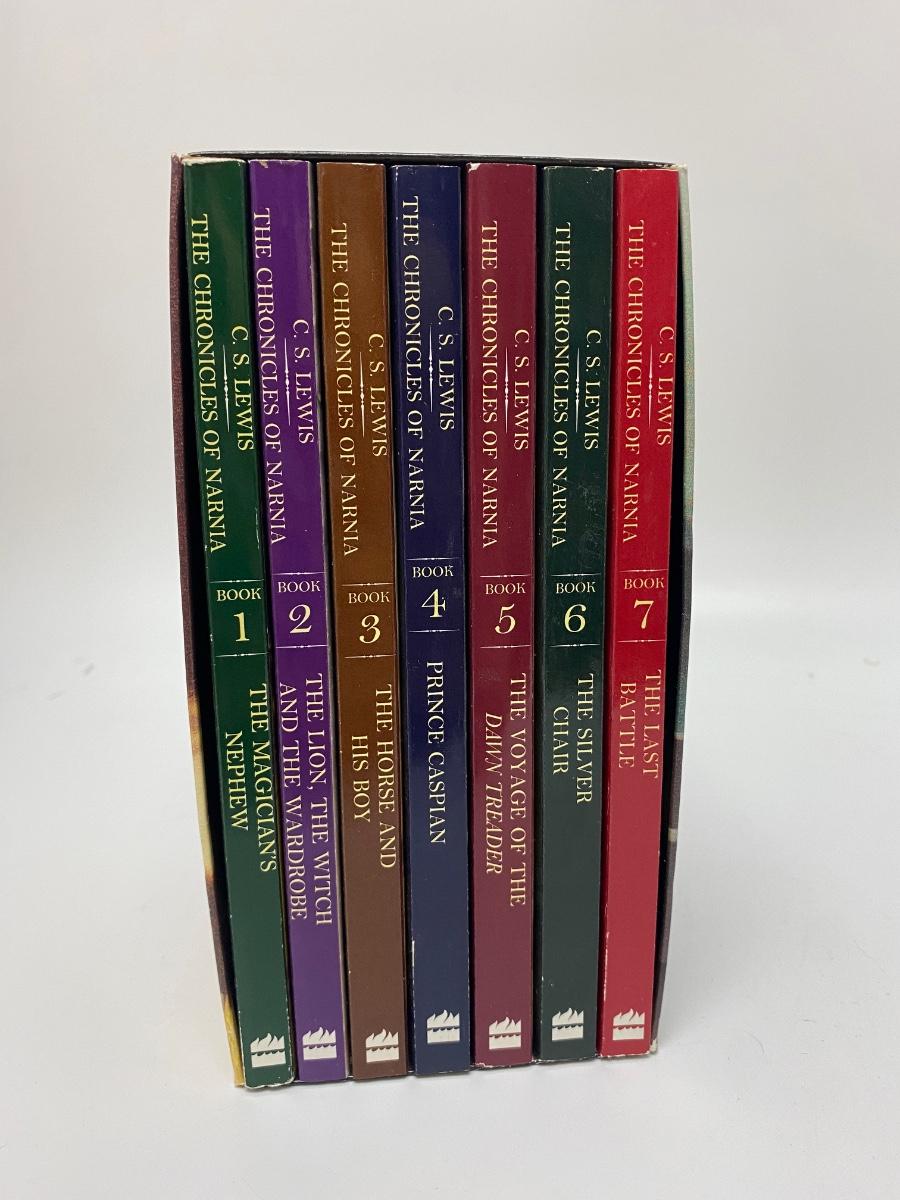 The Chronicles of Narnia by C. S. Lewis. Seven books set in slip case. Good previously read condition. 1994 edition print paperback.