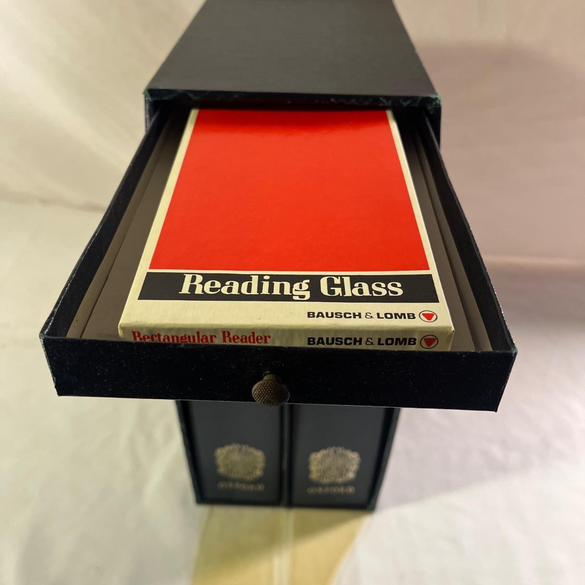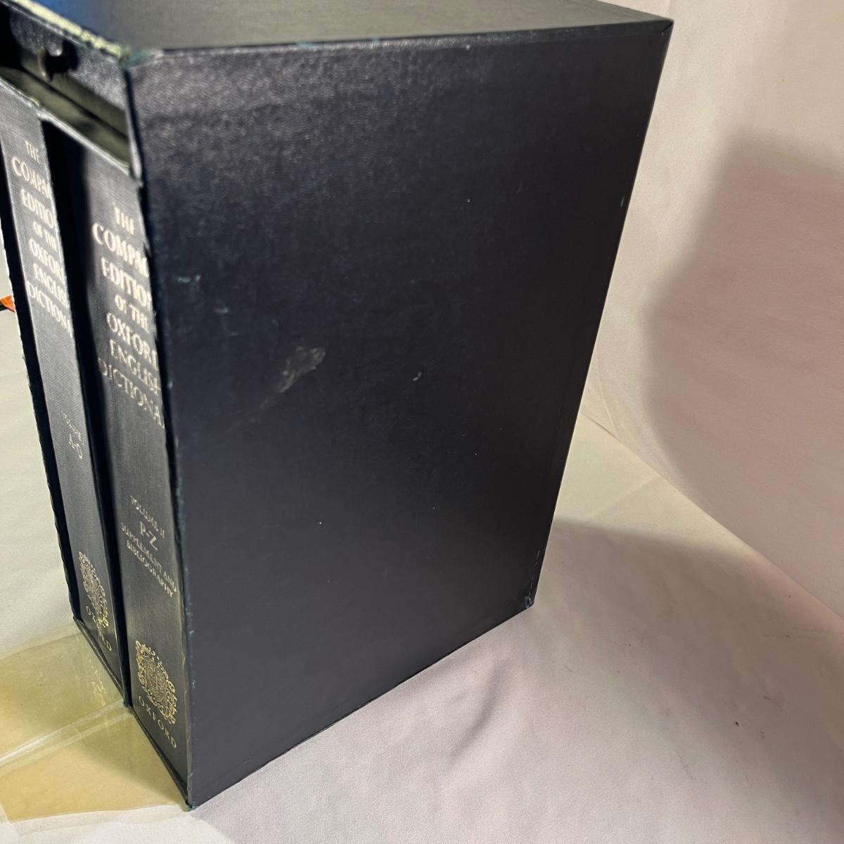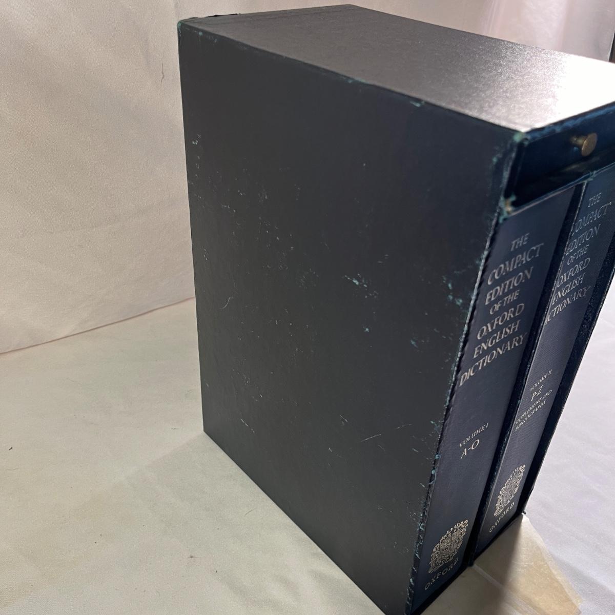 This two volume set of The Compact Edition of the Oxford English Dictionary also includes magnifying glass and storage binder. Binder measures 6” x 9.5” x 14”H.