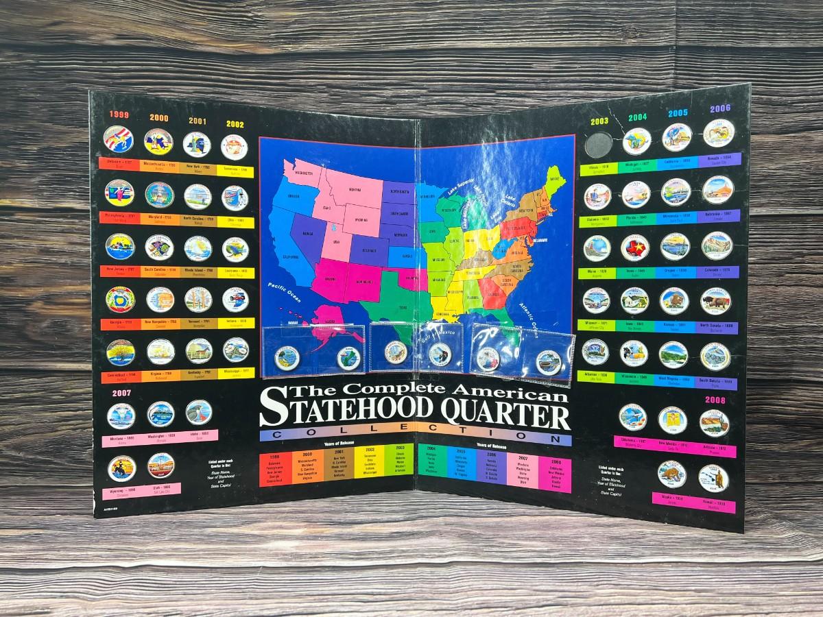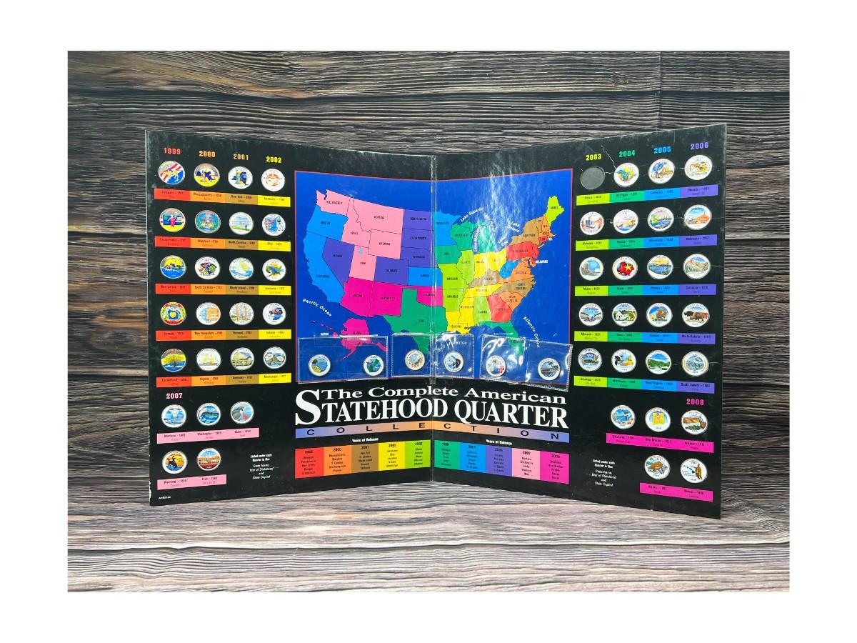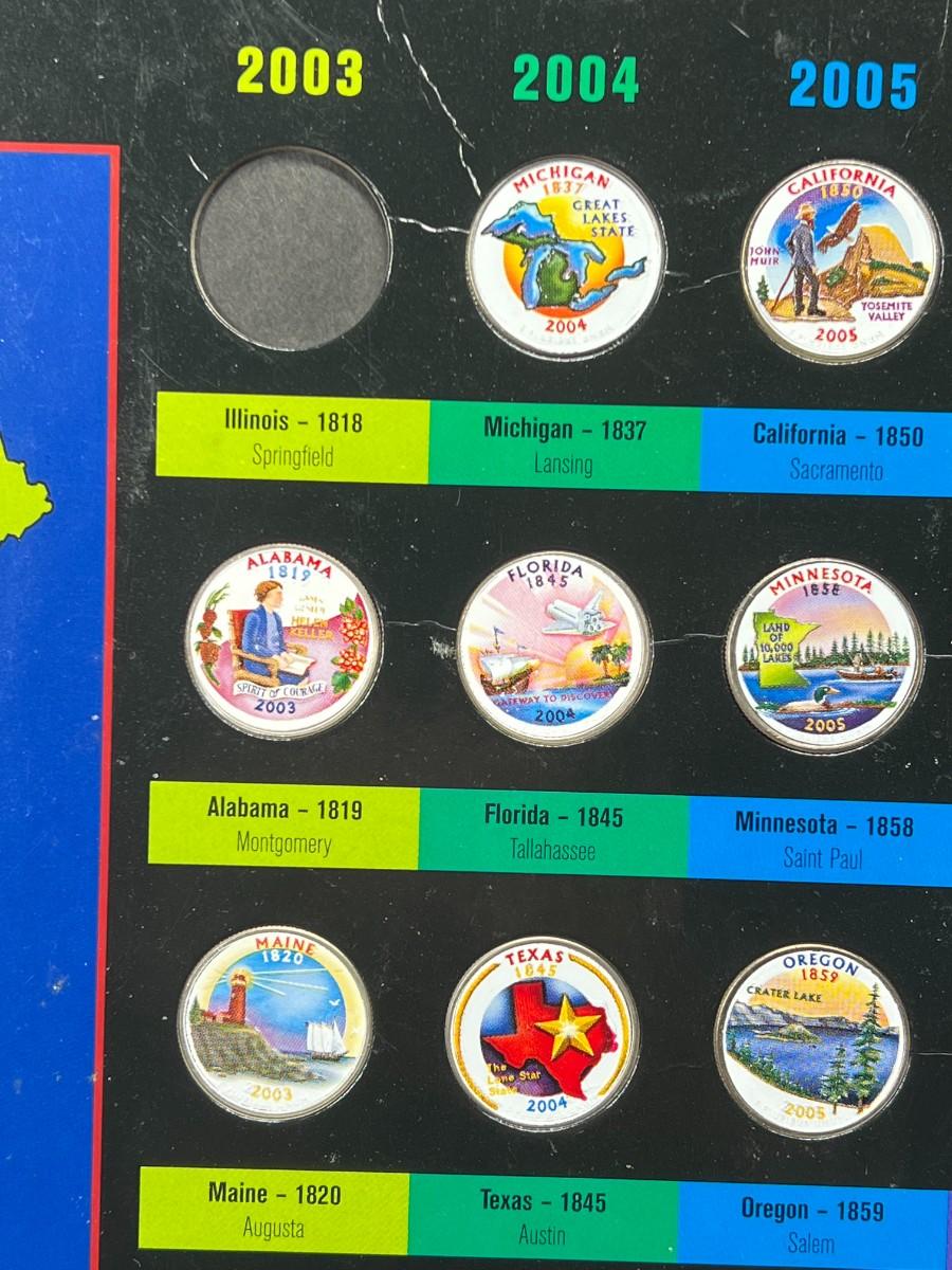The Complete American Statehood Quarter Collection Collectible Colorized Quarters American Currency Coin Set, Illinois is the only state missing, and there are also 4 separate foreign coins not originally included in the set. Check pictures for more details and for sizing.