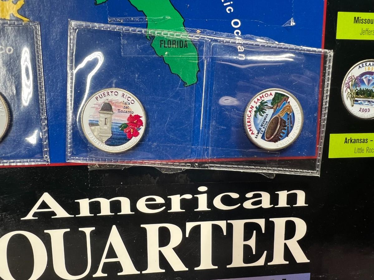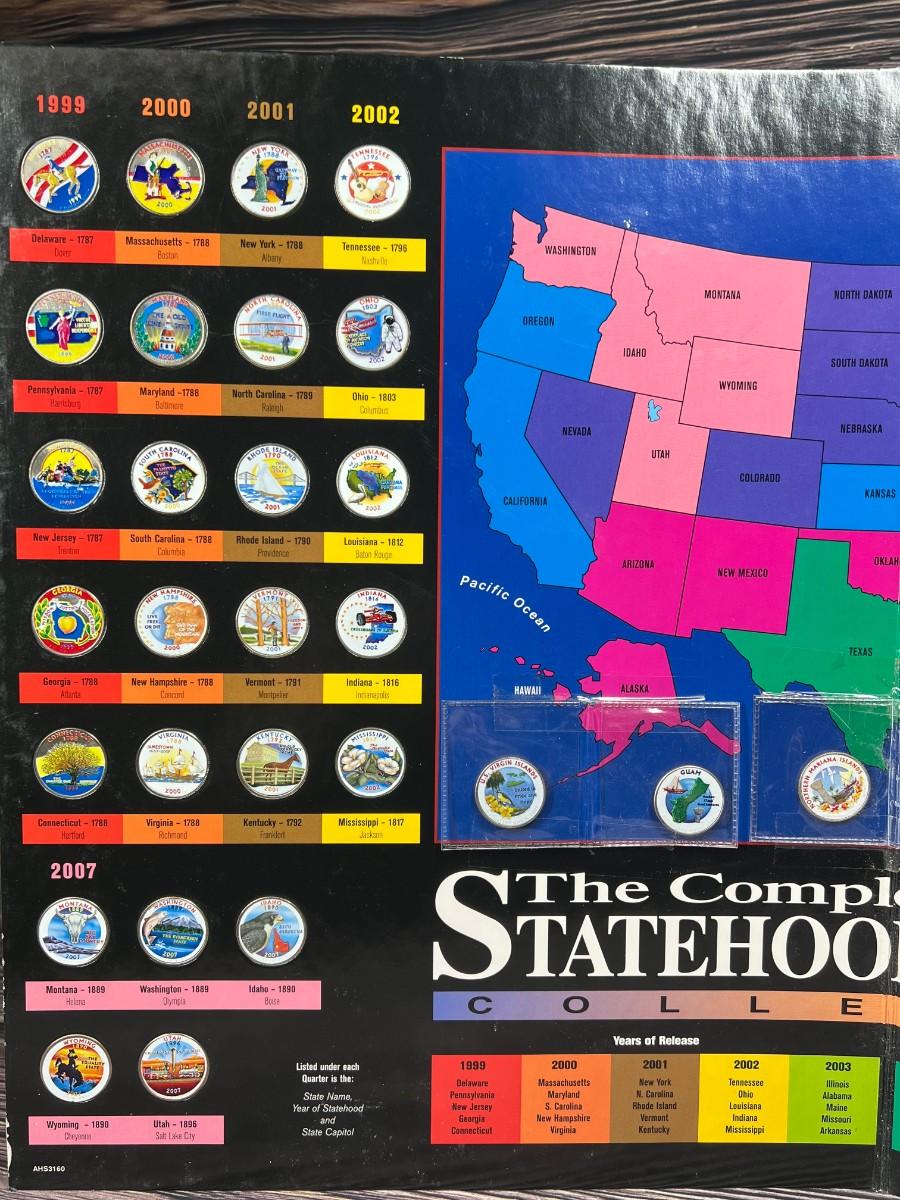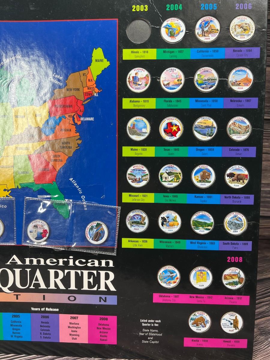 The Complete American Statehood Quarter Collection Collectible Colorized Quarters American Currency Coin Set, Illinois is the only state missing, and there are also 4 separate foreign coins not originally included in the set. Check pictures for more details and for sizing.