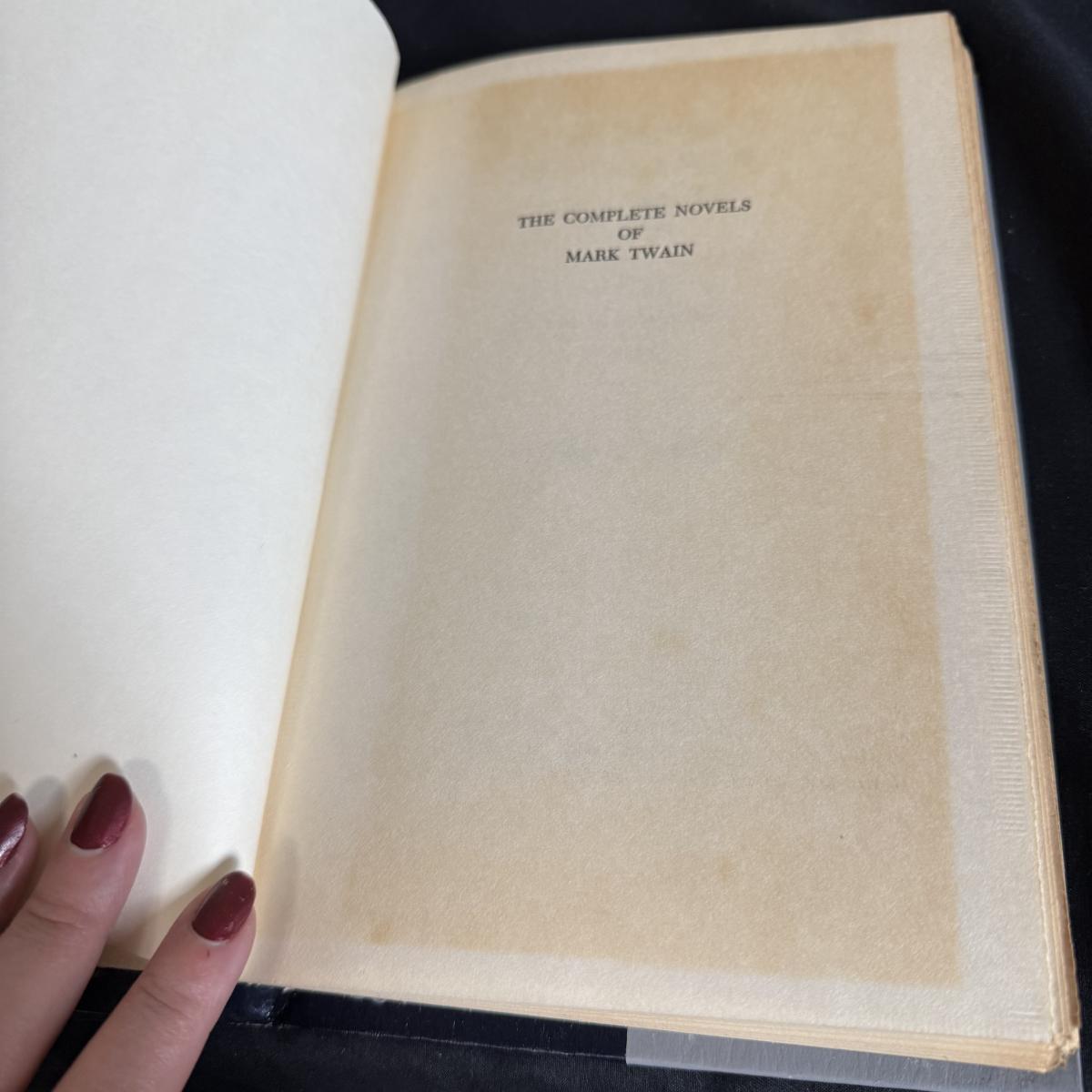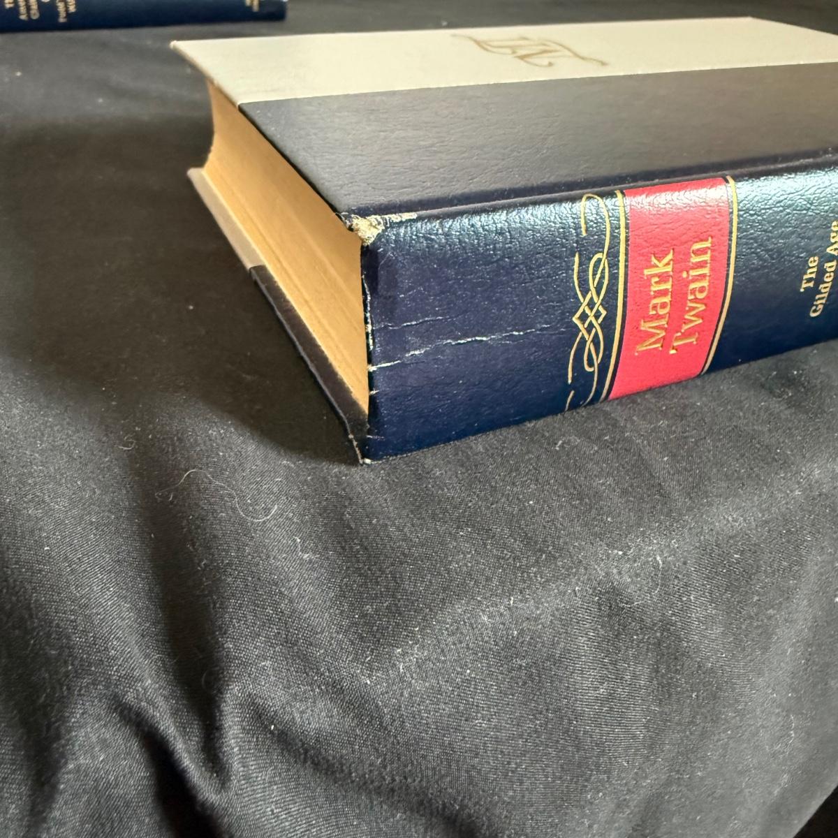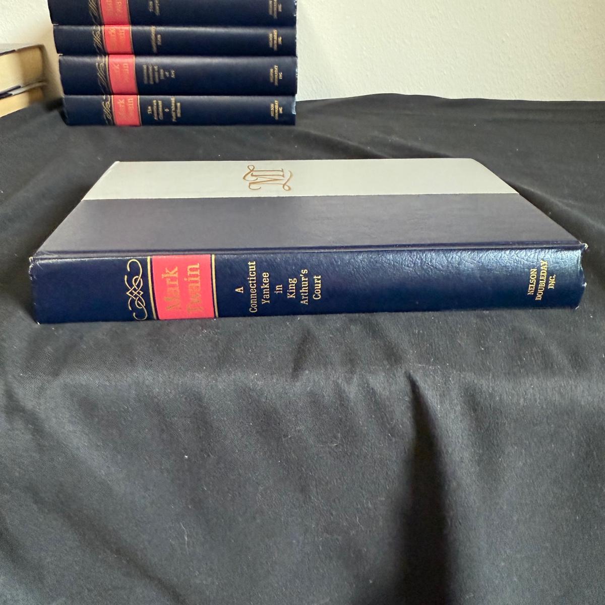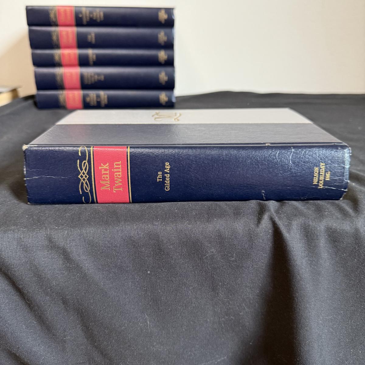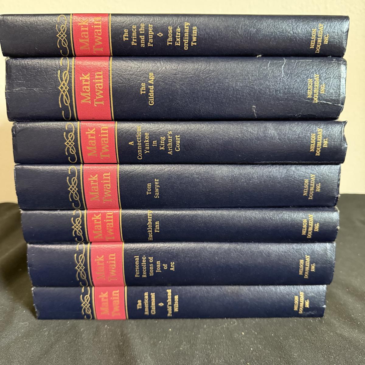 This lot contains ‘The Complete Novels of Mark Twain’ that is a total of seven books. All of the books match with the same covers. In this collection we have The American Claimant/ Pudd’nhead Wilson, The Personal Recollections of Joan of Arc, Huckleberry Finn, Tom Sawyer, A Connecticut Yankee in King Arthur’s Court, The Gilded Age, The Prince and the Pauper/Those Extra-ordinary Twins. There are some corners that are a bit scuffed, and in a strange twist A Connecticut Yankee has been printed backwards and upside down from its binding. Each book measures 5.75” x 8.5”. Shipping available.