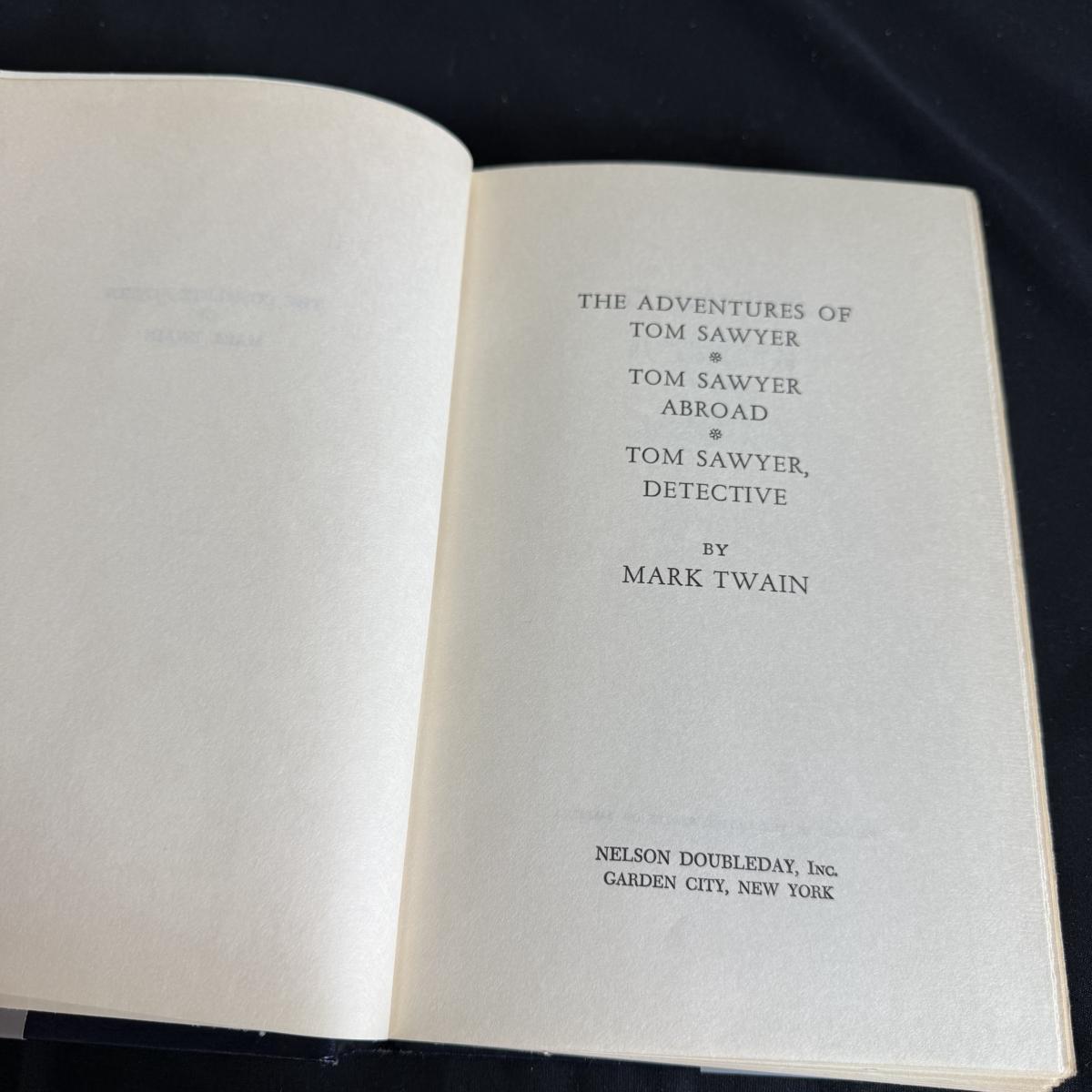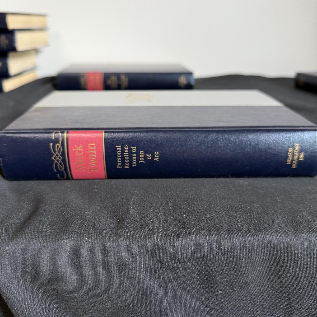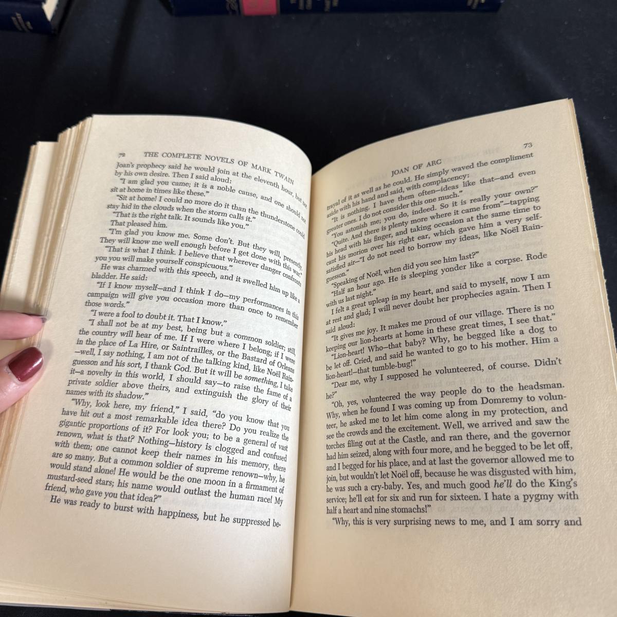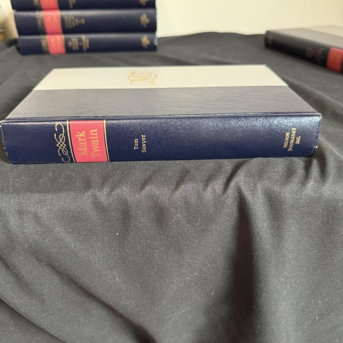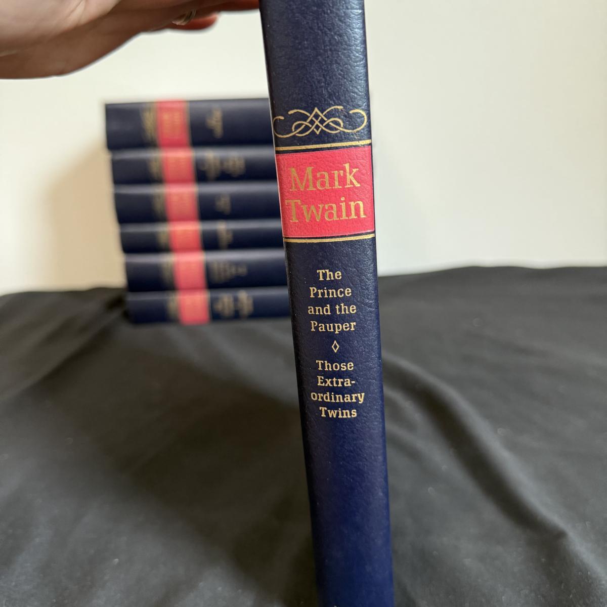 This lot contains ‘The Complete Novels of Mark Twain’ that is a total of seven books. All of the books match with the same covers. In this collection we have The American Claimant/ Pudd’nhead Wilson, The Personal Recollections of Joan of Arc, Huckleberry Finn, Tom Sawyer, A Connecticut Yankee in King Arthur’s Court, The Gilded Age, The Prince and the Pauper/Those Extra-ordinary Twins. There are some corners that are a bit scuffed, and in a strange twist A Connecticut Yankee has been printed backwards and upside down from its binding. Each book measures 5.75” x 8.5”. Shipping available.