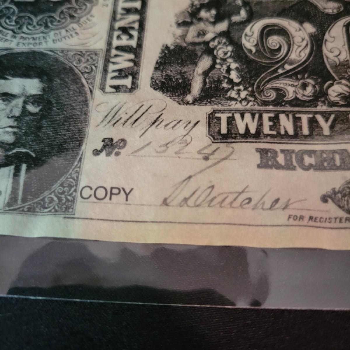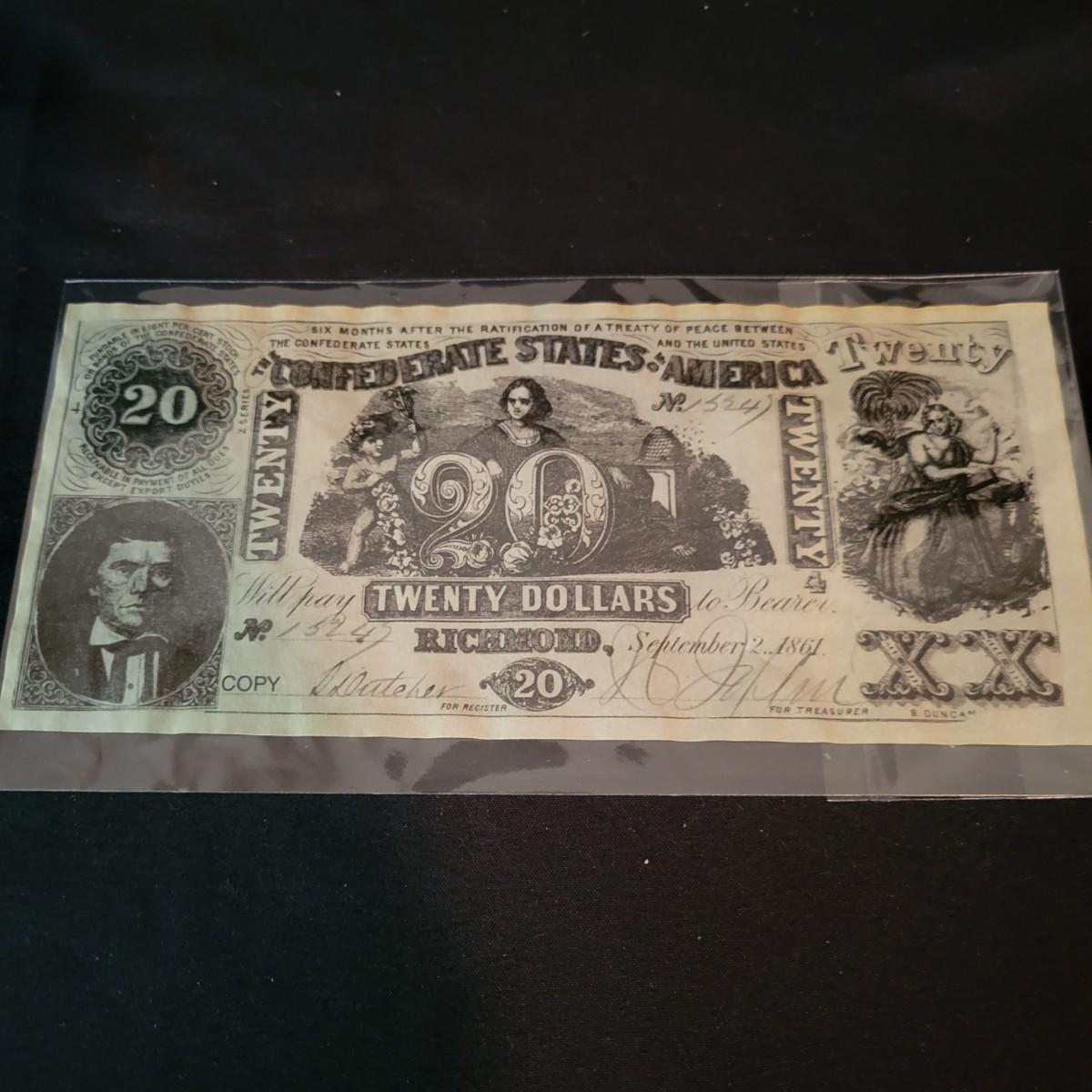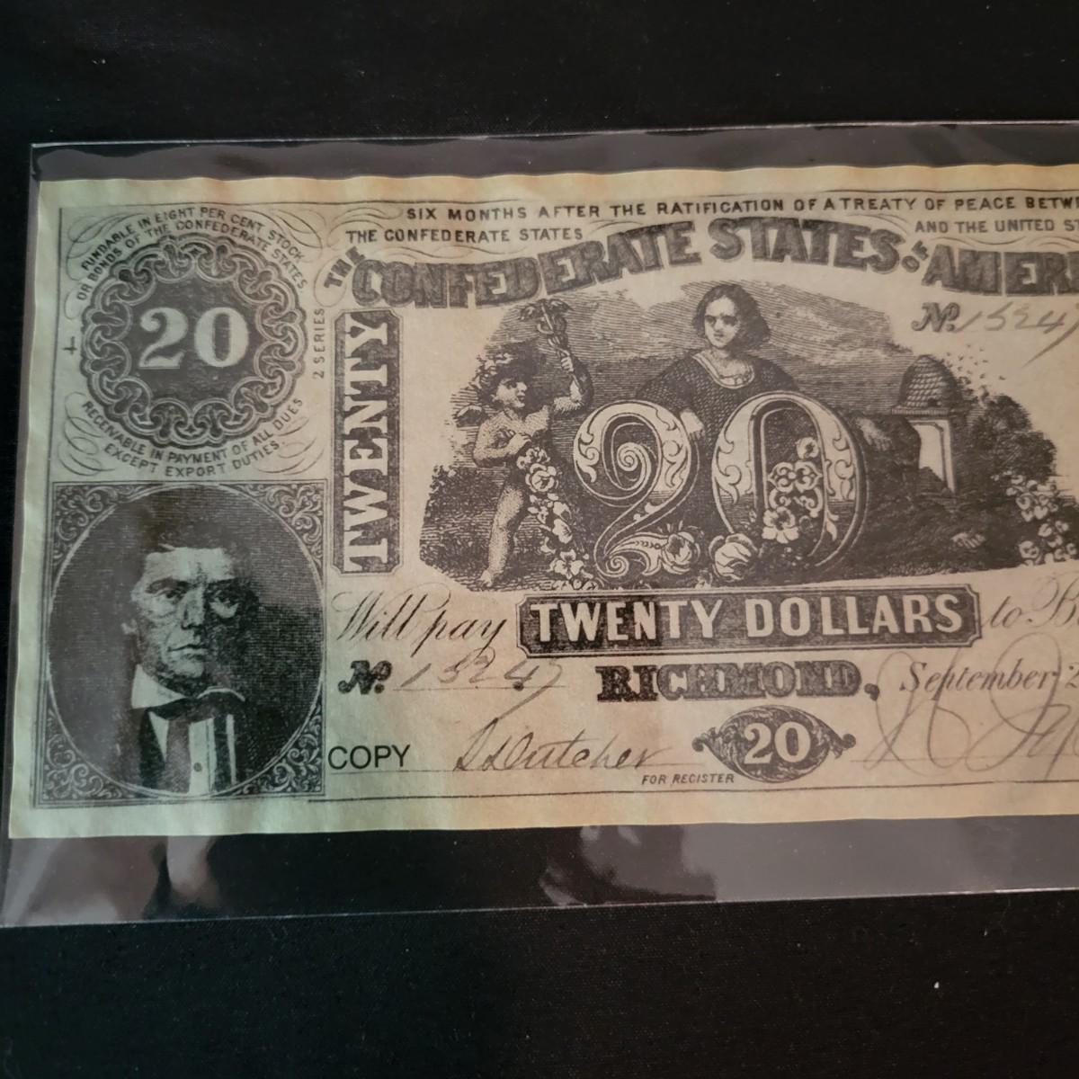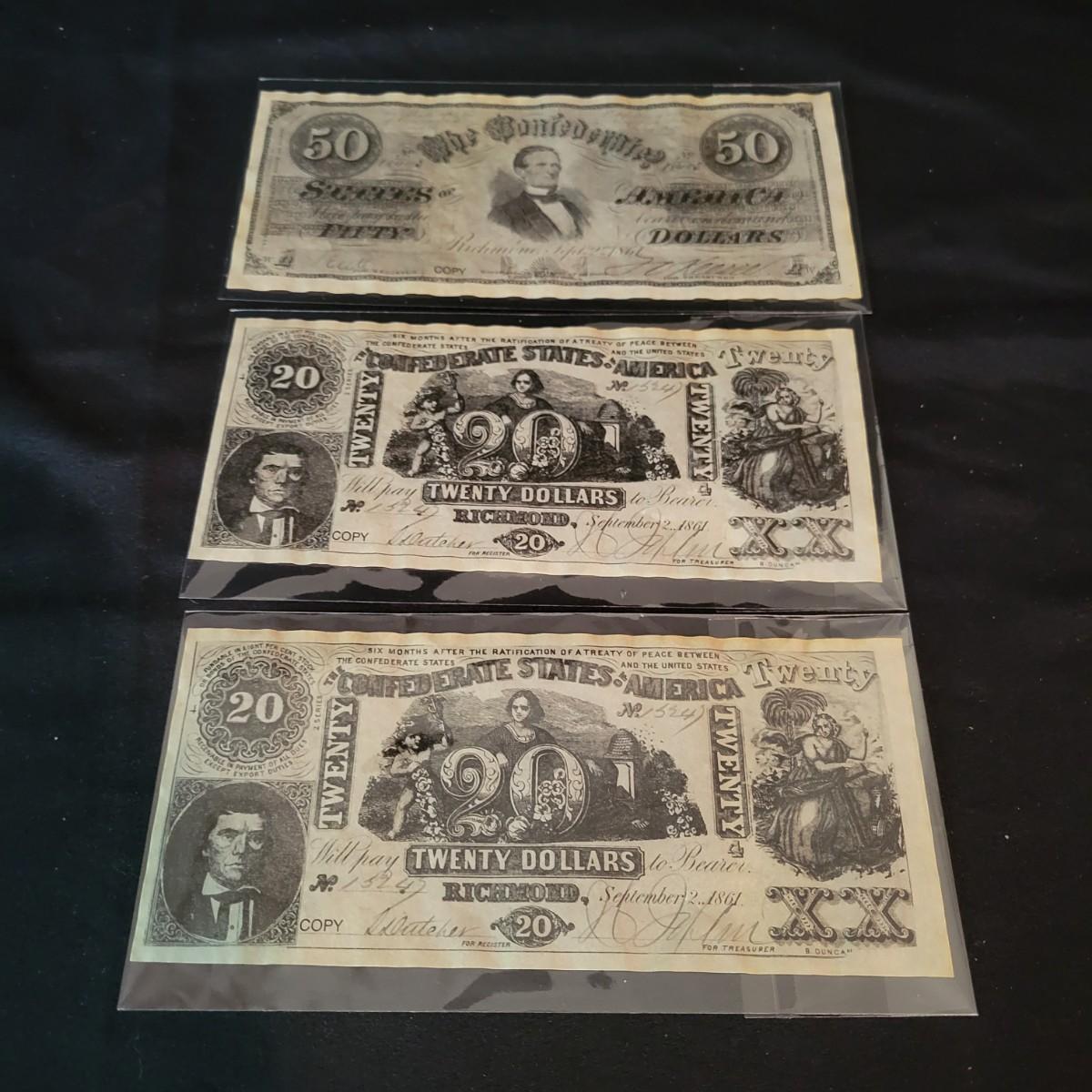 A set of three banknotes for the CSA that could not be authenticated. Included are two $20 dollar bill with the serial number 15427. This lot also includes a $50 dollar banknote with the serial number 18433. All three banknotes are in plastic sleeves and have minor yellowing. Each note measures approximately 7" x 3"H. Shipping available.