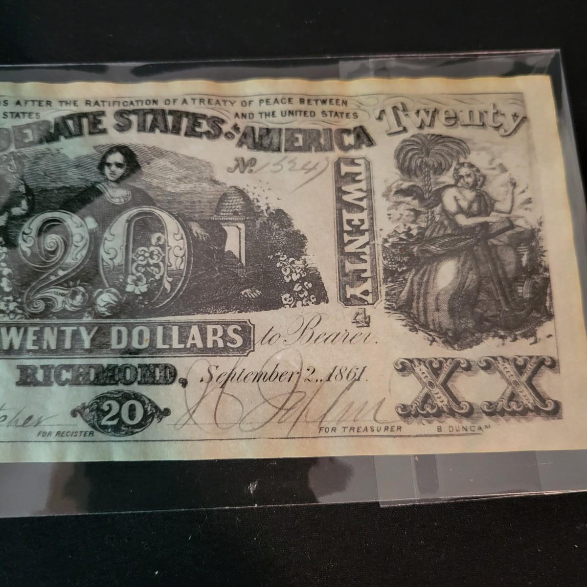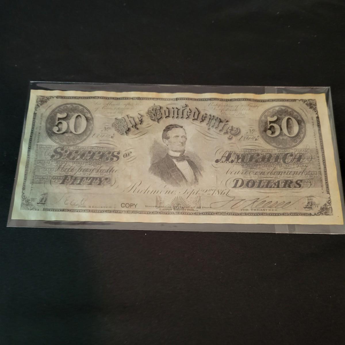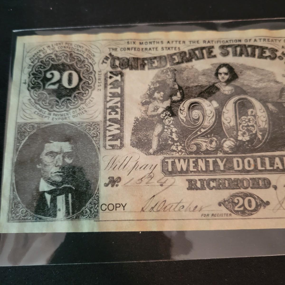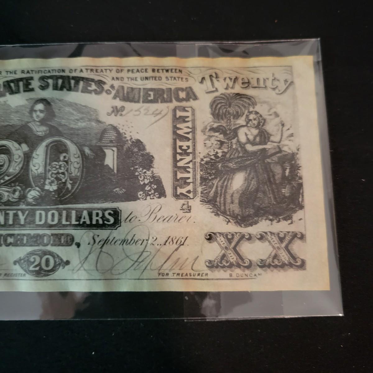 A set of three banknotes for the CSA that could not be authenticated. Included are two $20 dollar bill with the serial number 15427. This lot also includes a $50 dollar banknote with the serial number 18433. All three banknotes are in plastic sleeves and have minor yellowing. Each note measures approximately 7" x 3"H. Shipping available.