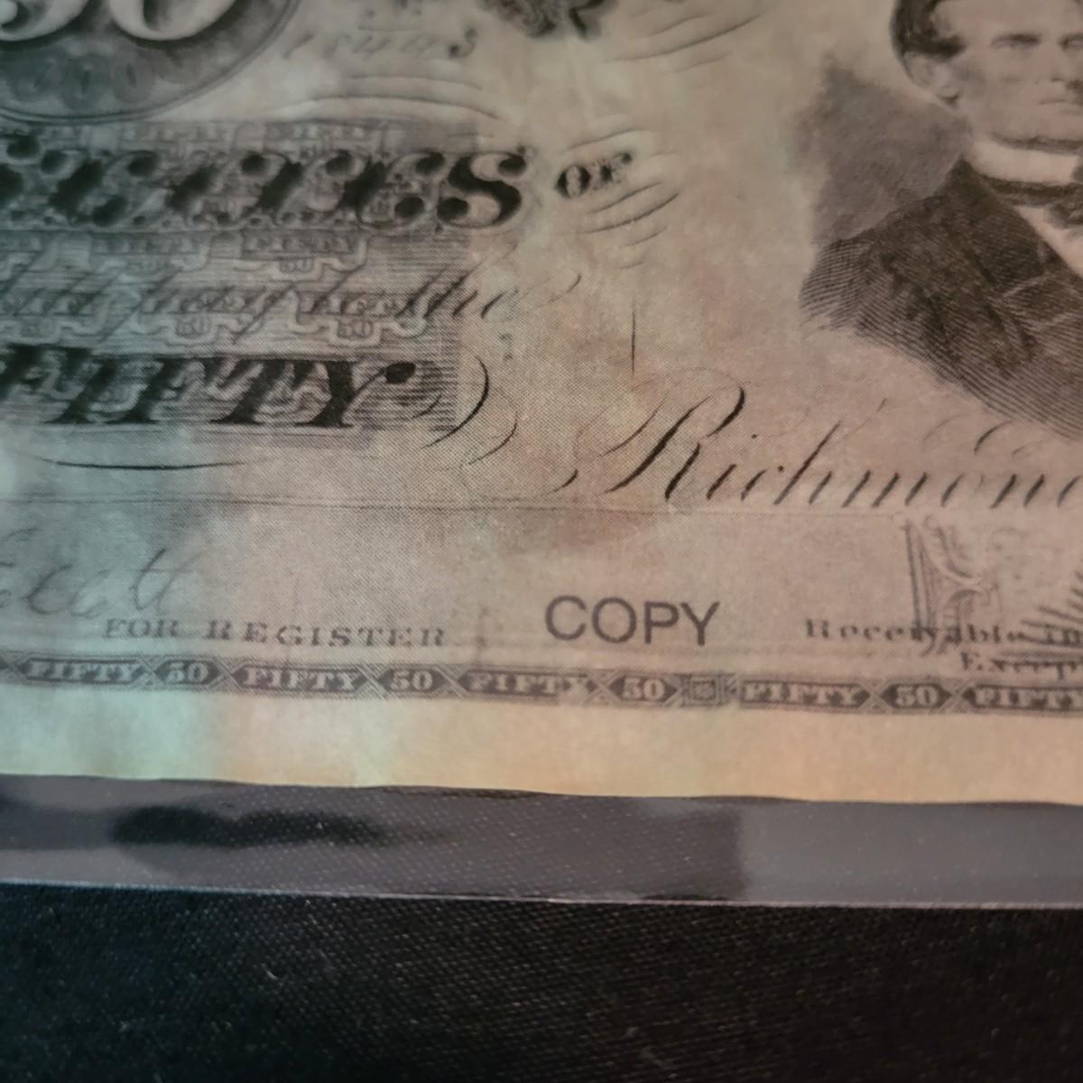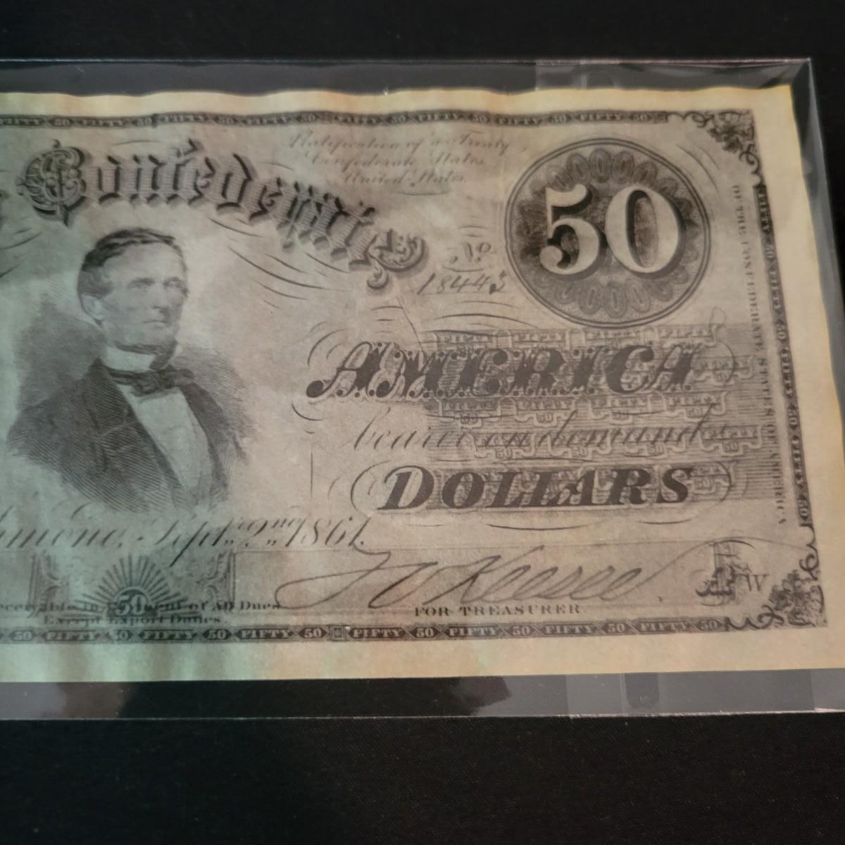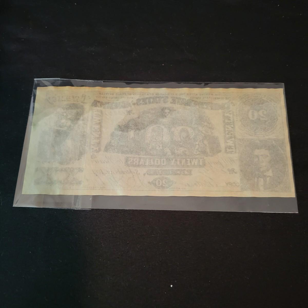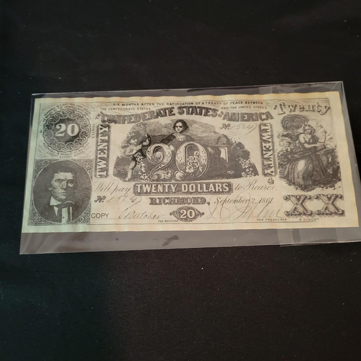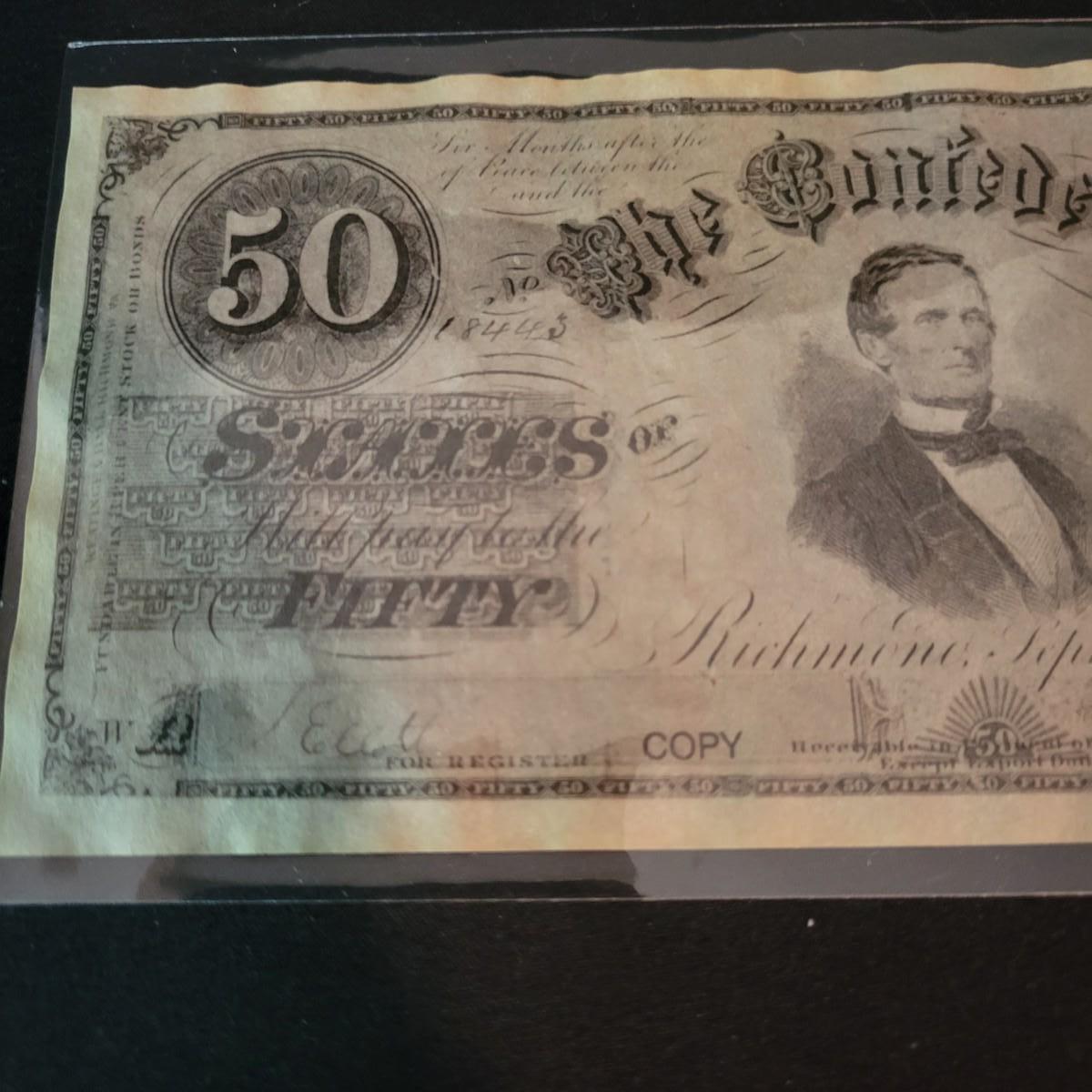 A set of three banknotes for the CSA that could not be authenticated. Included are two $20 dollar bill with the serial number 15427. This lot also includes a $50 dollar banknote with the serial number 18433. All three banknotes are in plastic sleeves and have minor yellowing. Each note measures approximately 7" x 3"H. Shipping available.
