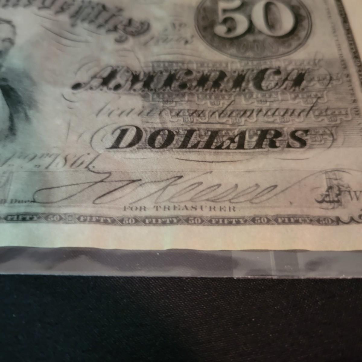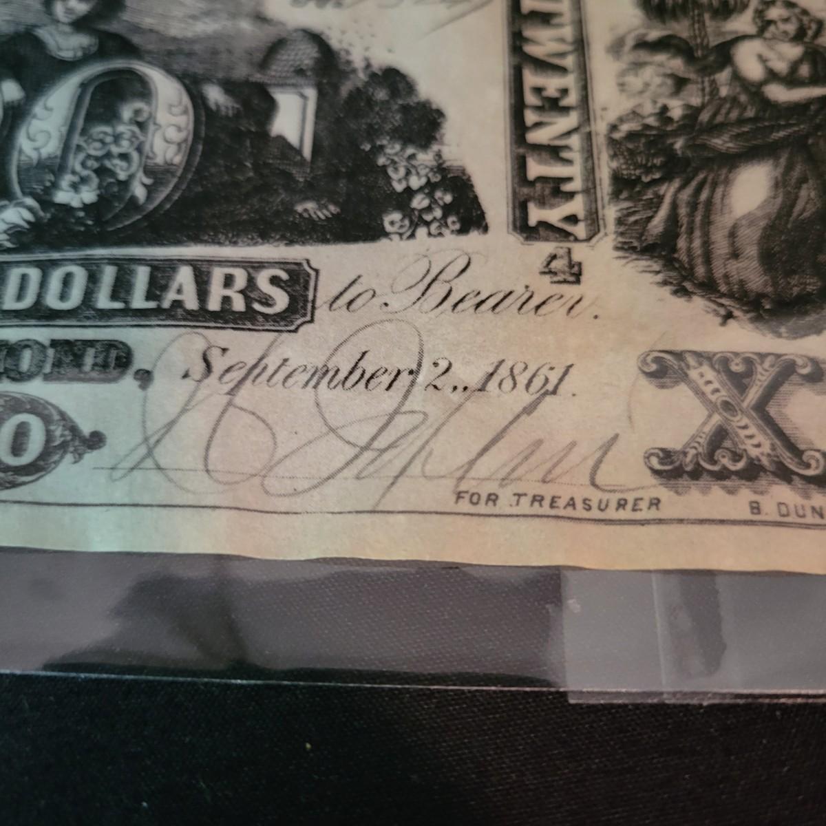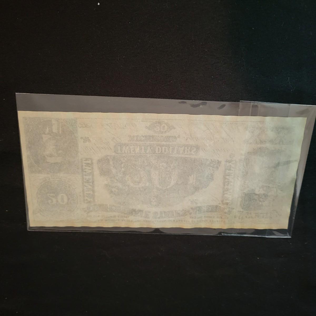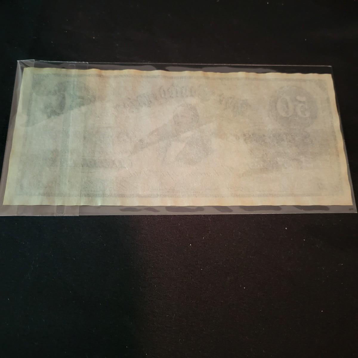A set of three banknotes for the CSA that could not be authenticated. Included are two $20 dollar bill with the serial number 15427. This lot also includes a $50 dollar banknote with the serial number 18433. All three banknotes are in plastic sleeves and have minor yellowing. Each note measures approximately 7" x 3"H. Shipping available.