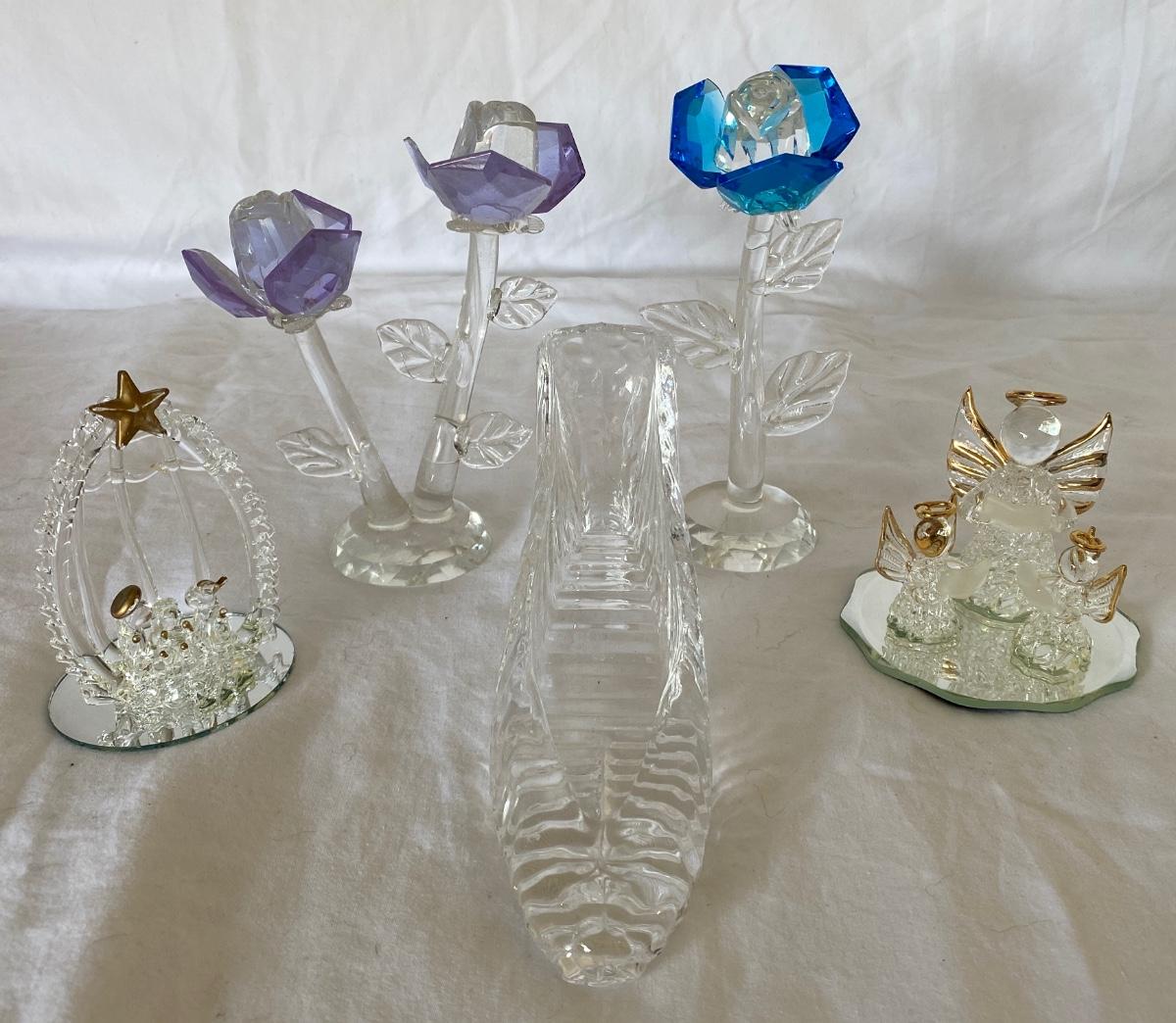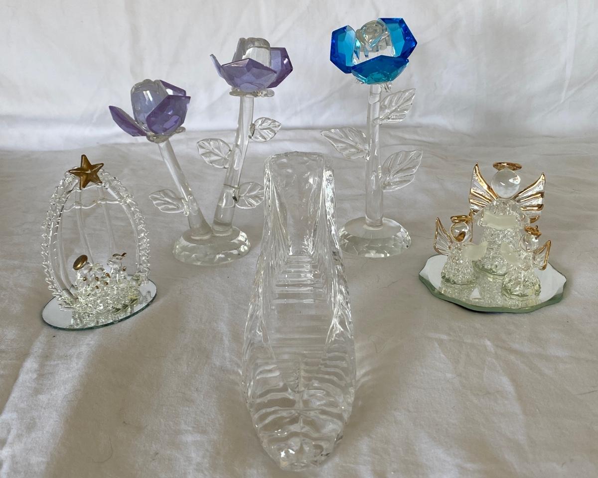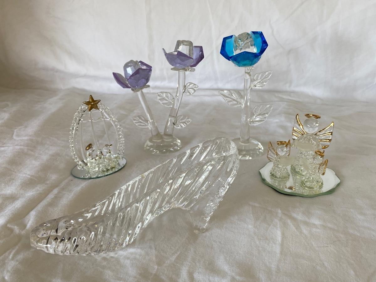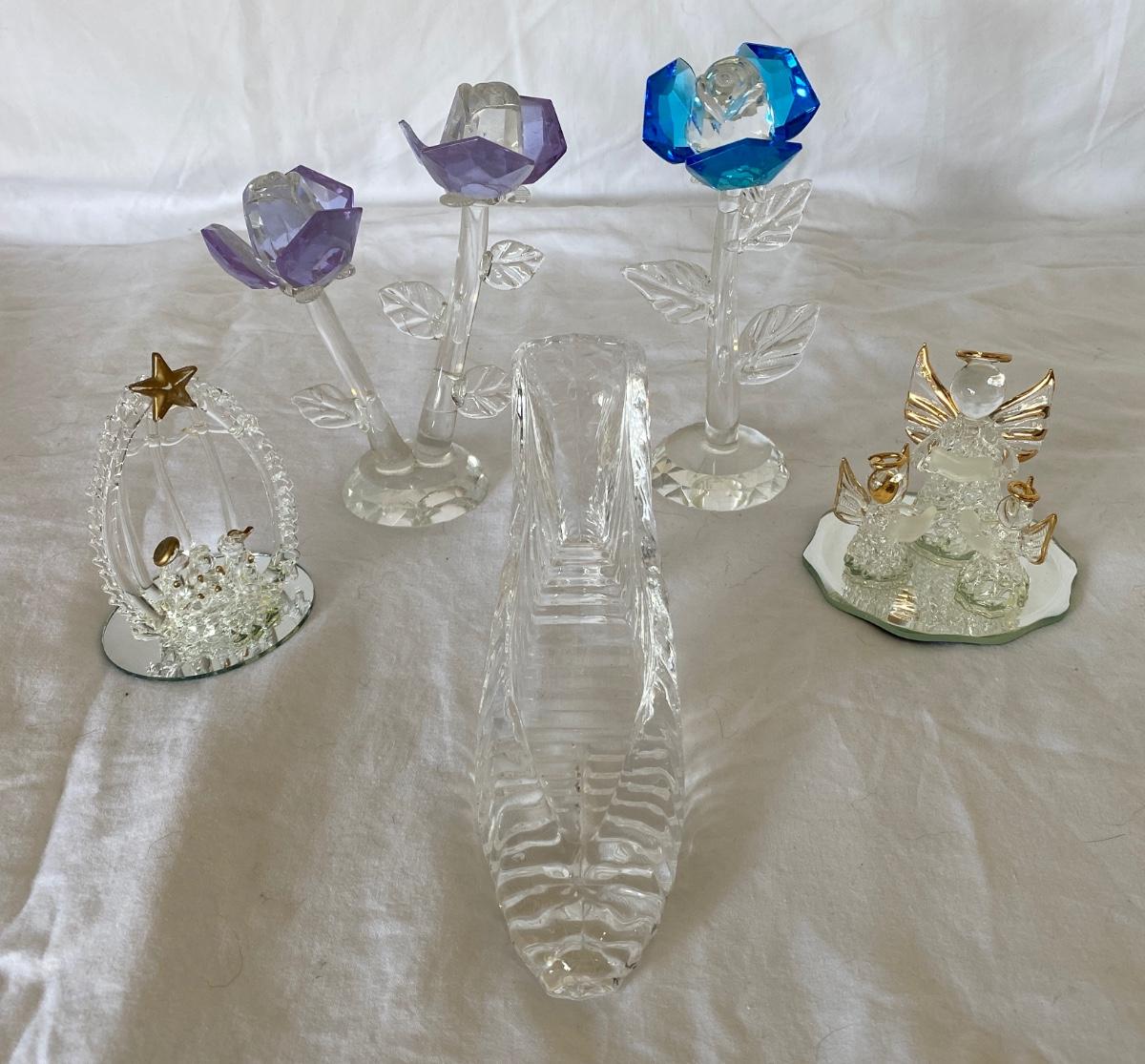 Crystal figurine lot. Please note that one of the purple petals is broken. Please see photos for condition. All preowned and sold as is