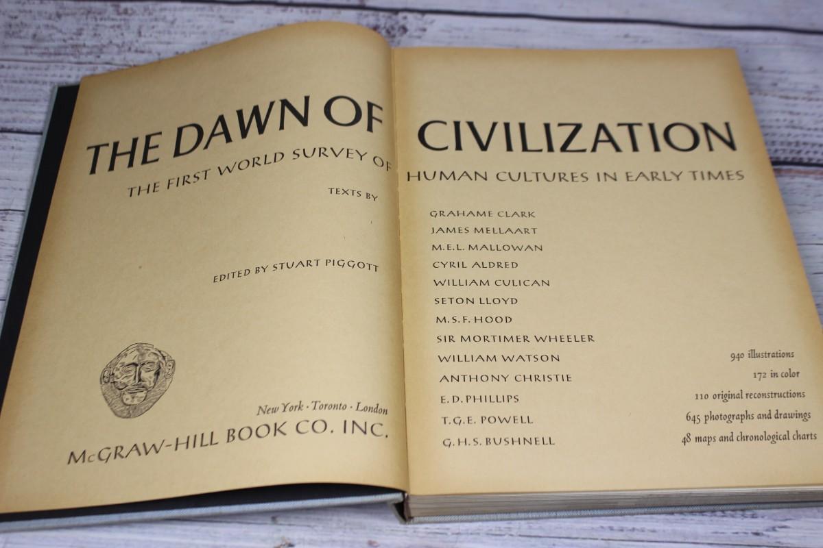 The Dawn of Civilization, a hardcover history book from 1960s. In good vintage condition, some discolor to the cover.
