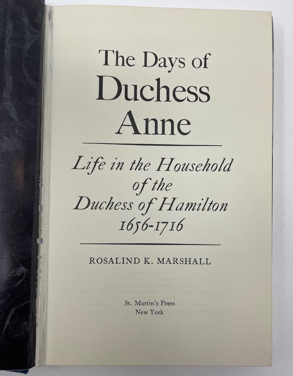 Description: The Days of Duchess Anne Duchess of Hamilton 1656-1716 by Rosalind K. Marshall copyright 1973; Material: Paper