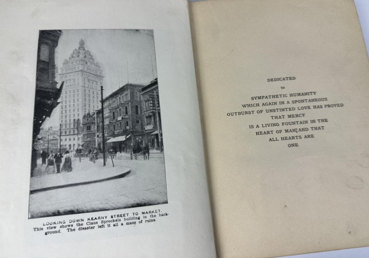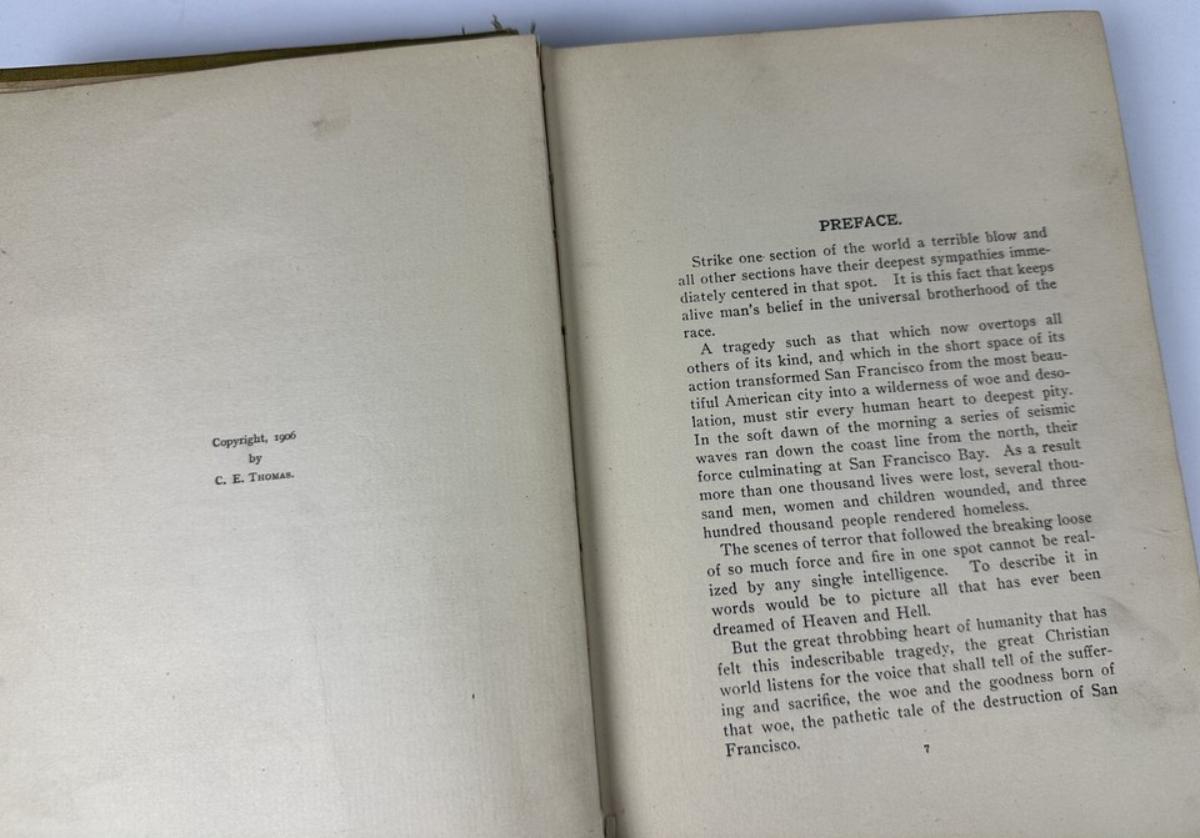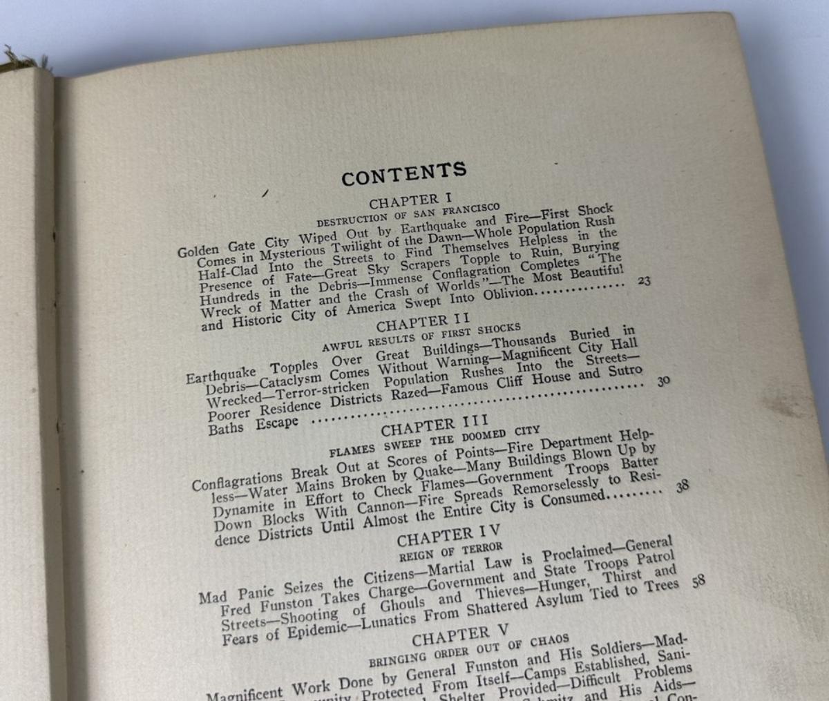 "The Destruction of San Francisco By Earthquake and Fire: The Complete Story of the Greatest of American Disasters" – Charles Eugene Banks & Opie Read...Published soon after in 1906..Hard Cover 464 Pgs. Pictorial cover with light soiling, corners bumped. Pages intact but spine is broken. Needs rebinding. Numerous B/W photos..