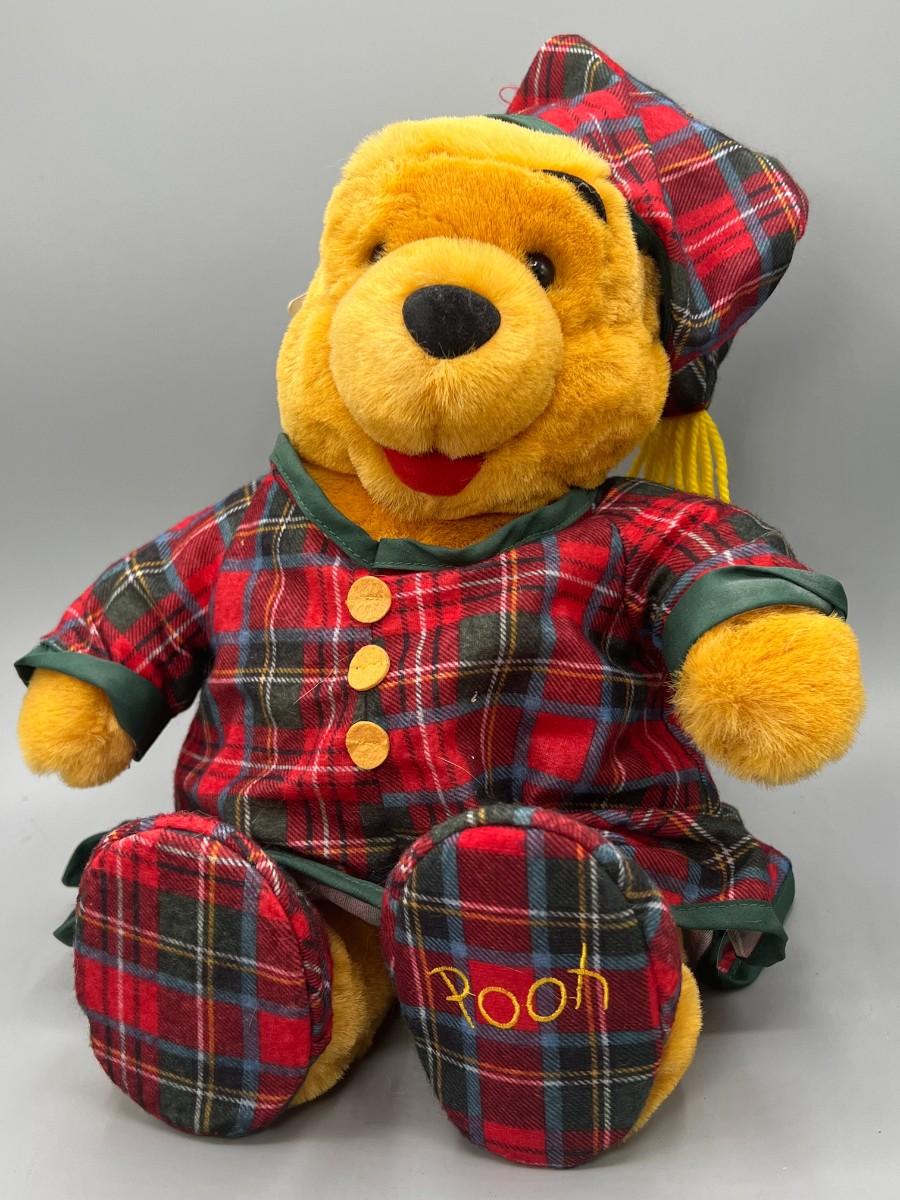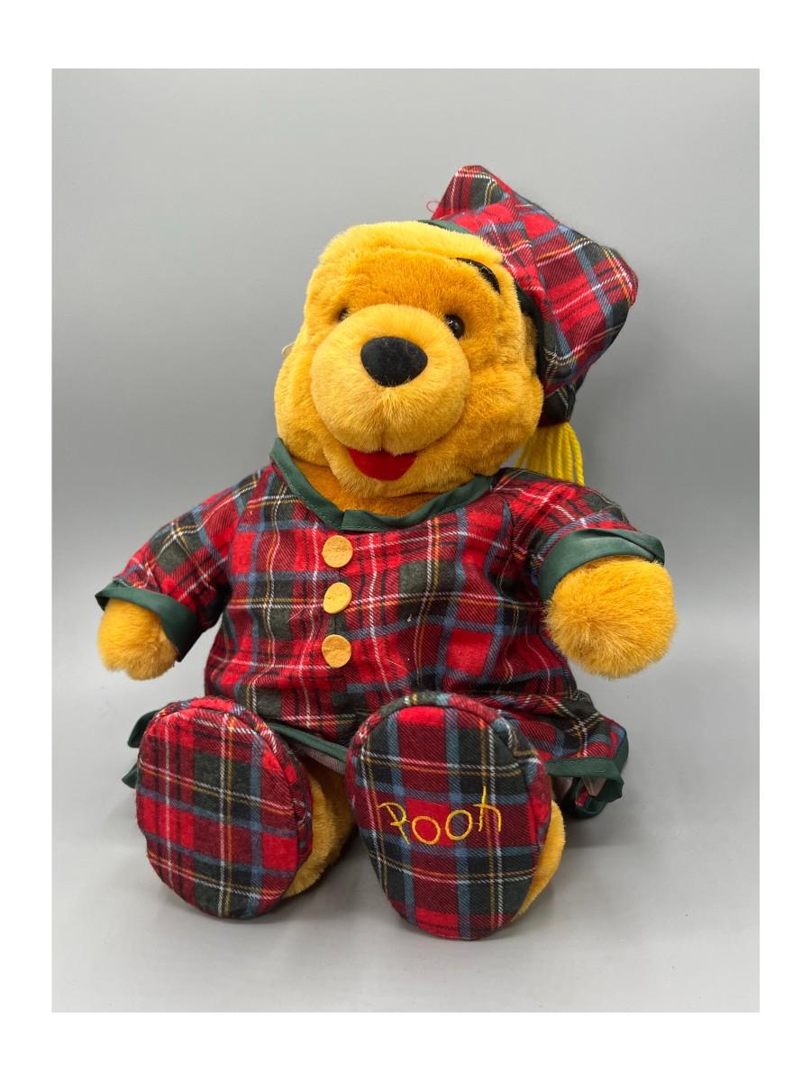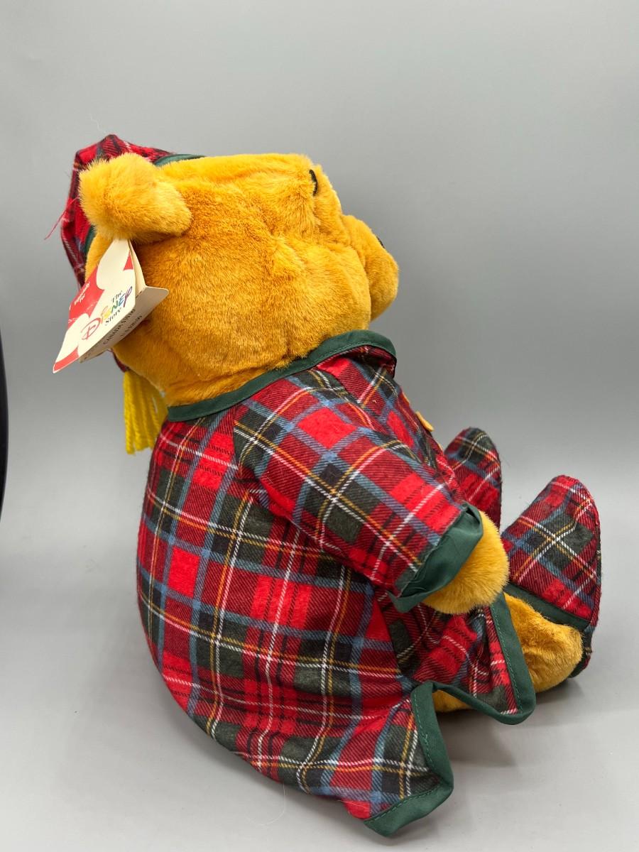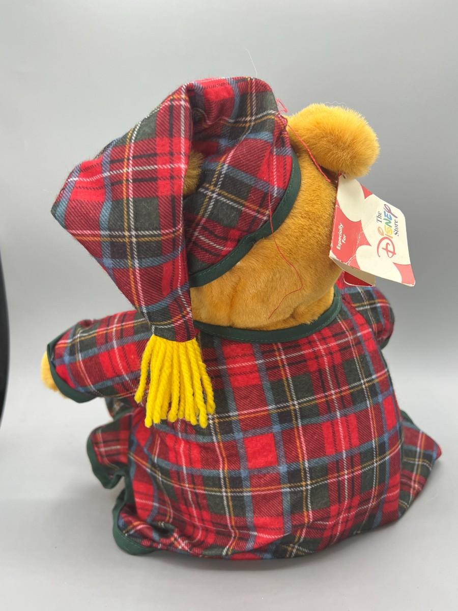 The Disney Store red plaid pajama wearing Winnie the Pooh plush. Original tags attached. Good condition. May be dusty from age, display, and storage.
