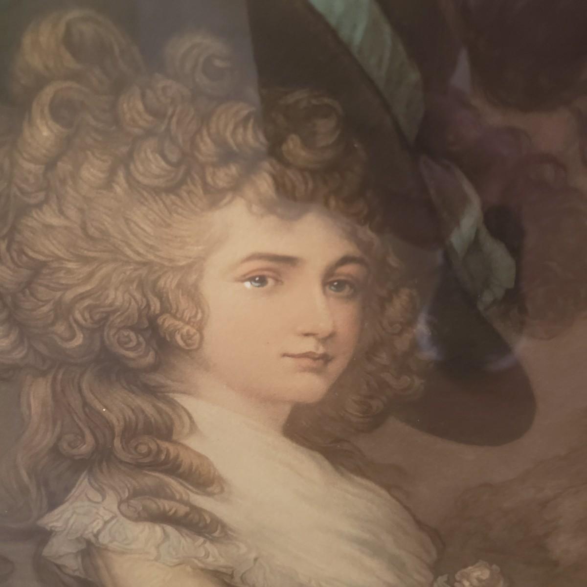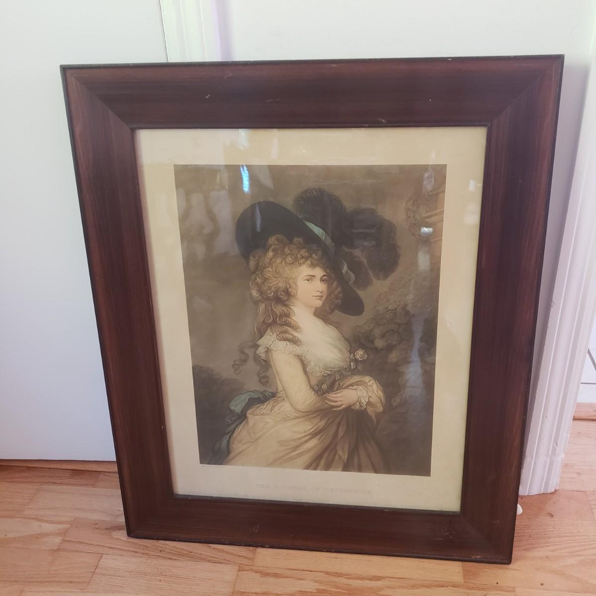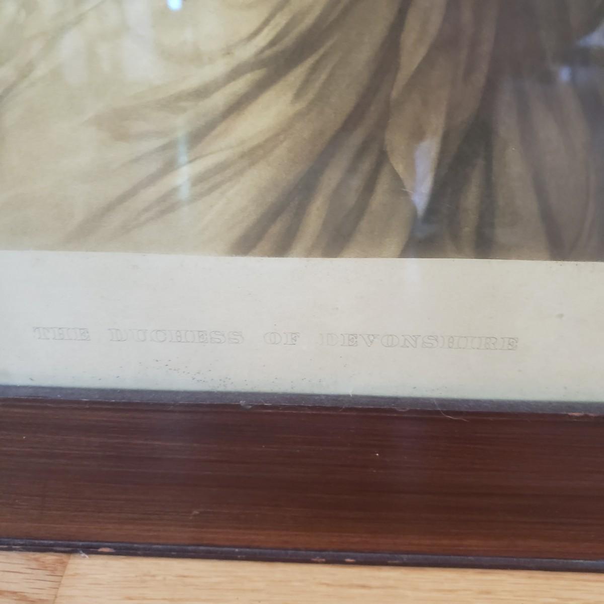 This print of The Dutchess of Devonshire is under glass with a wood frame. The frame measures 22" x 27". There are a few scuff marks on the frame, see pictures.