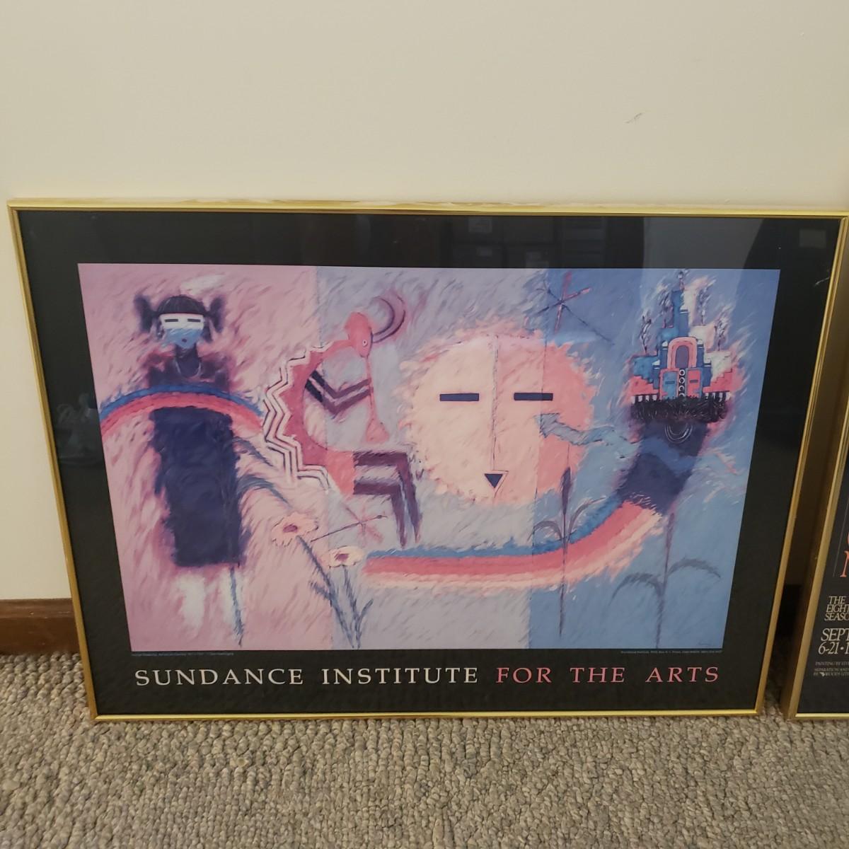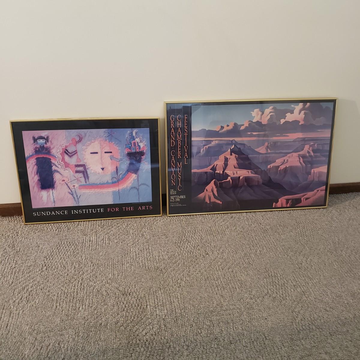 This two piece lot contains two gold metal framed Southwestern prints. The largest one(36" x 24") from The Eighth Season is from the Grand Canyon Chamber Music Festival in 1991. Both pieces are behind glass. The Sundance Institute For The Arts has a printed date of 1986. The artists name is hard to decifer.
