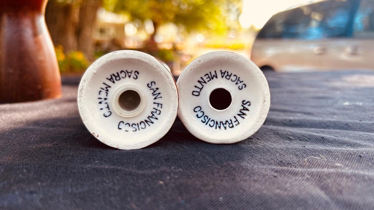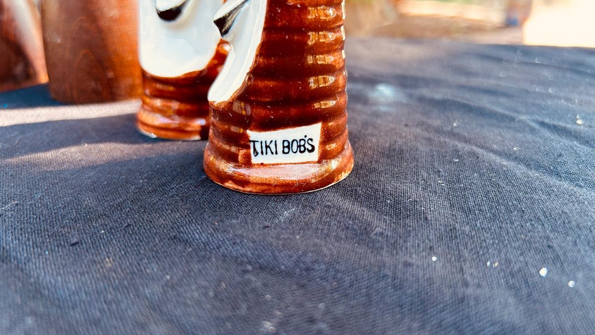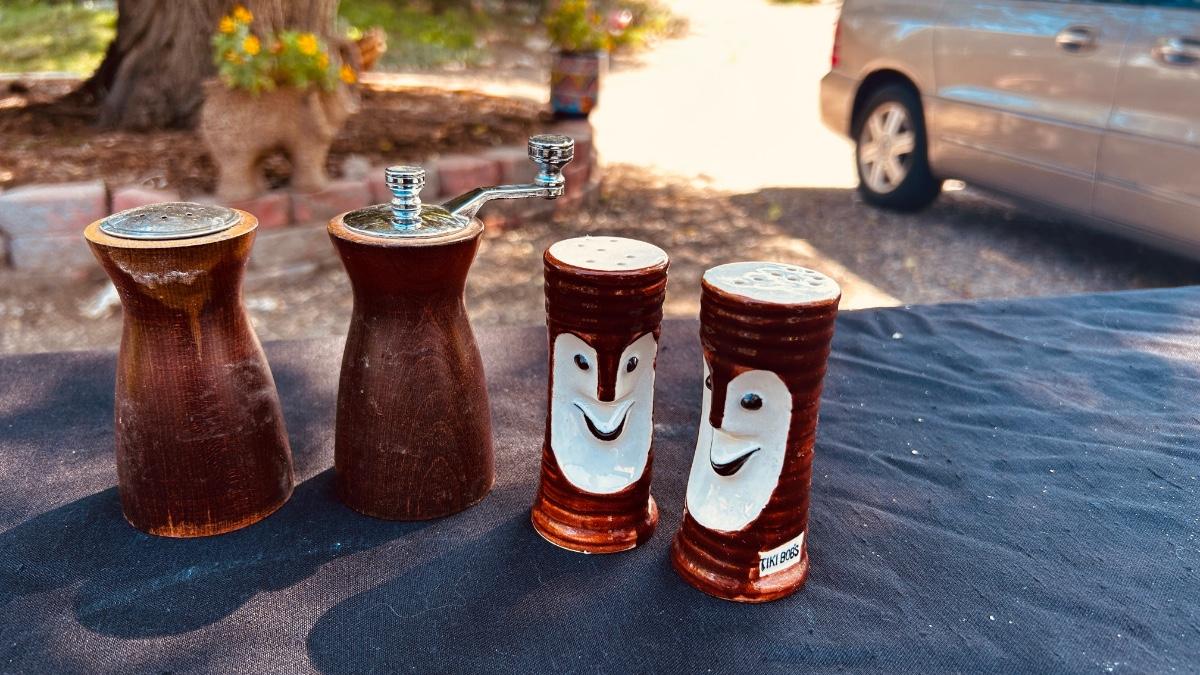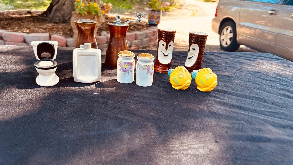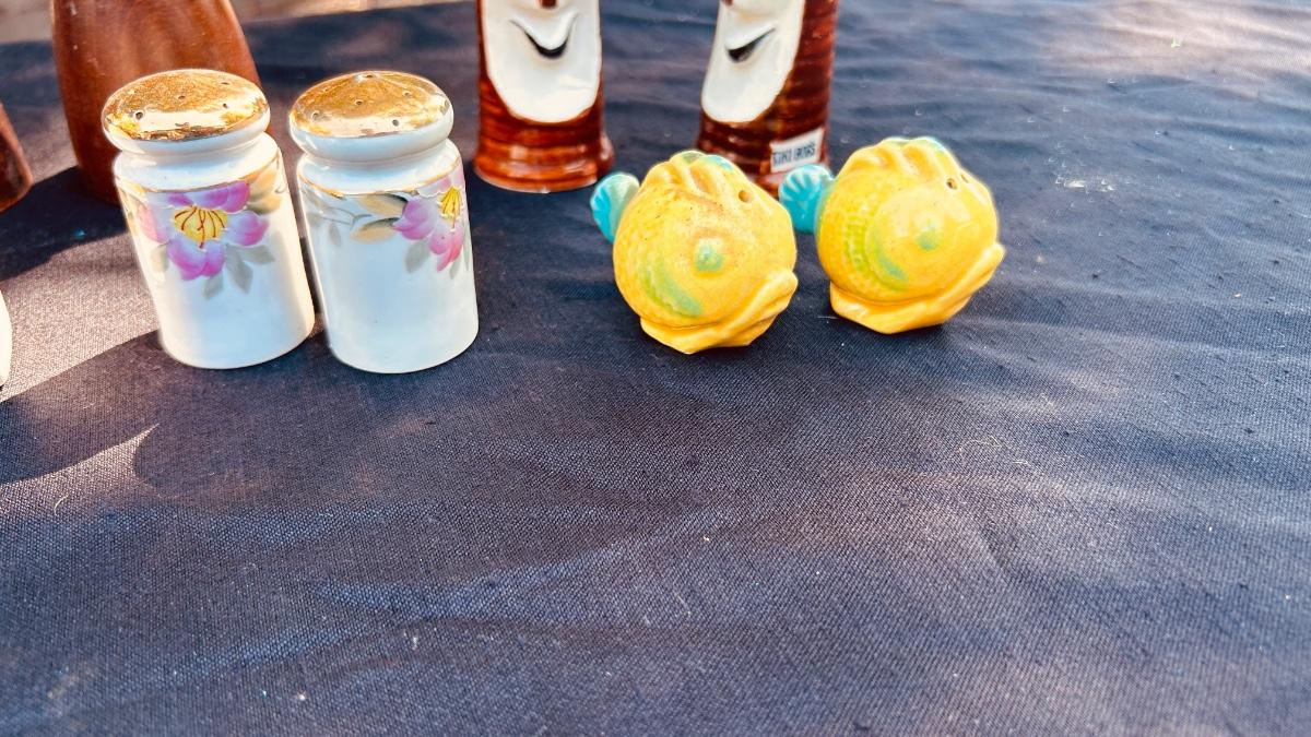 FISH, TREES, WOODEN, & HAND PAINTED SALT AND SHAKERS
