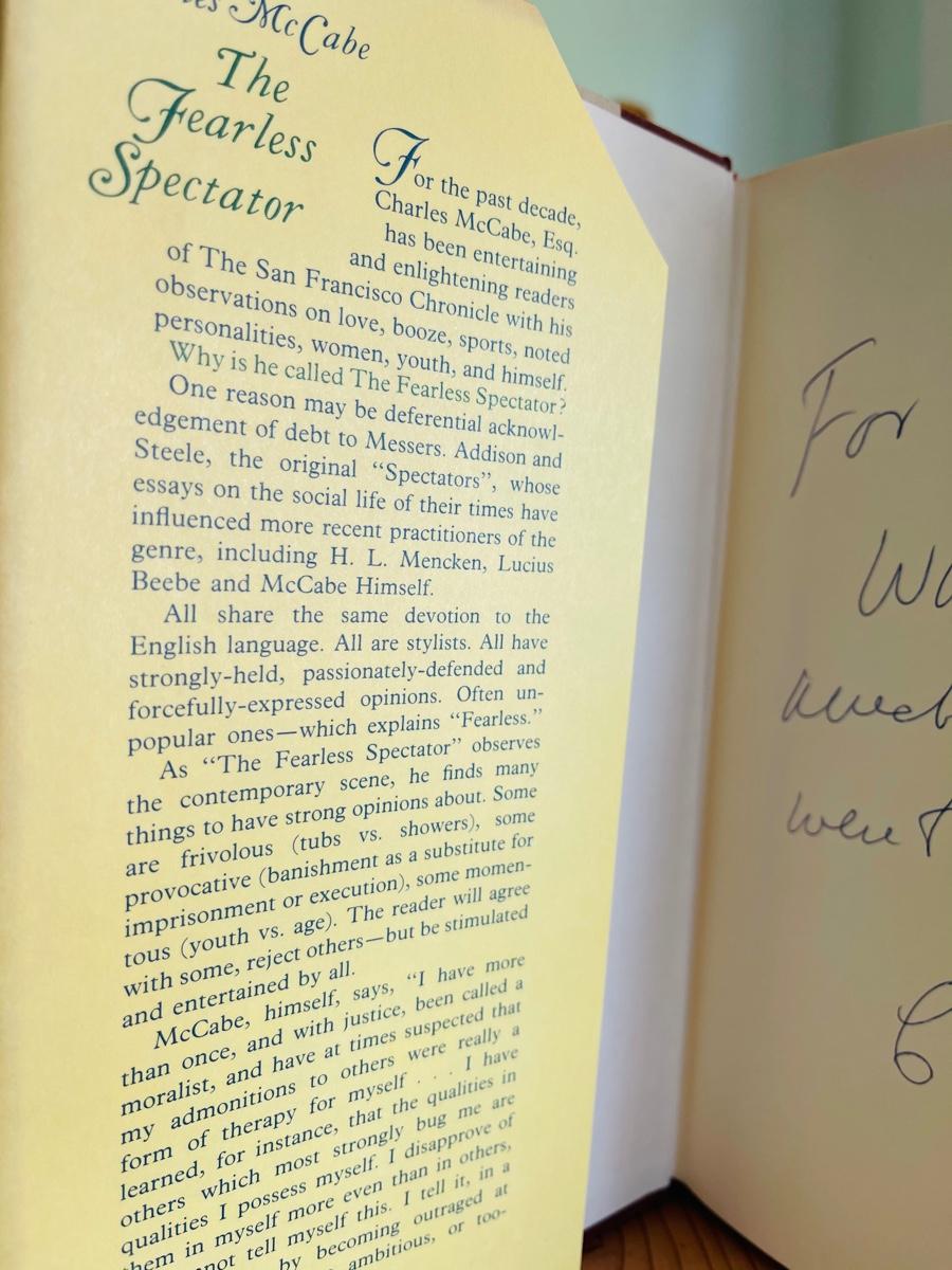 LOT 3 - The Fearless Spectator - Charles McCabe Signed 1970 1st Edition.. This book was signed with inscription to David Pleydell-Bouverie in 1971 by Charles McCabe. This hardcover book in good condition. Some darkening to spine and some marks on dust jacket. Inside pages are crisp, clean and neat. This book was part of the David-Pleydell-Bouverie library at Bouverie Ranch in Glen Ellen. This item can be viewed at our Green + Cate Showroom in Sebastopol from July 15th - July 18th between the hours of 9am-5pm. For the benefit of the Bouverie Preserve of Audubon Canyon Ranch.