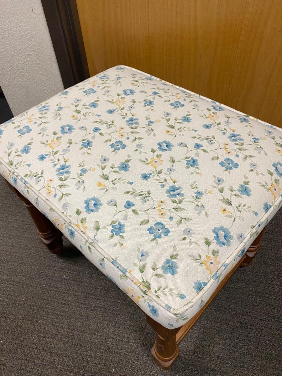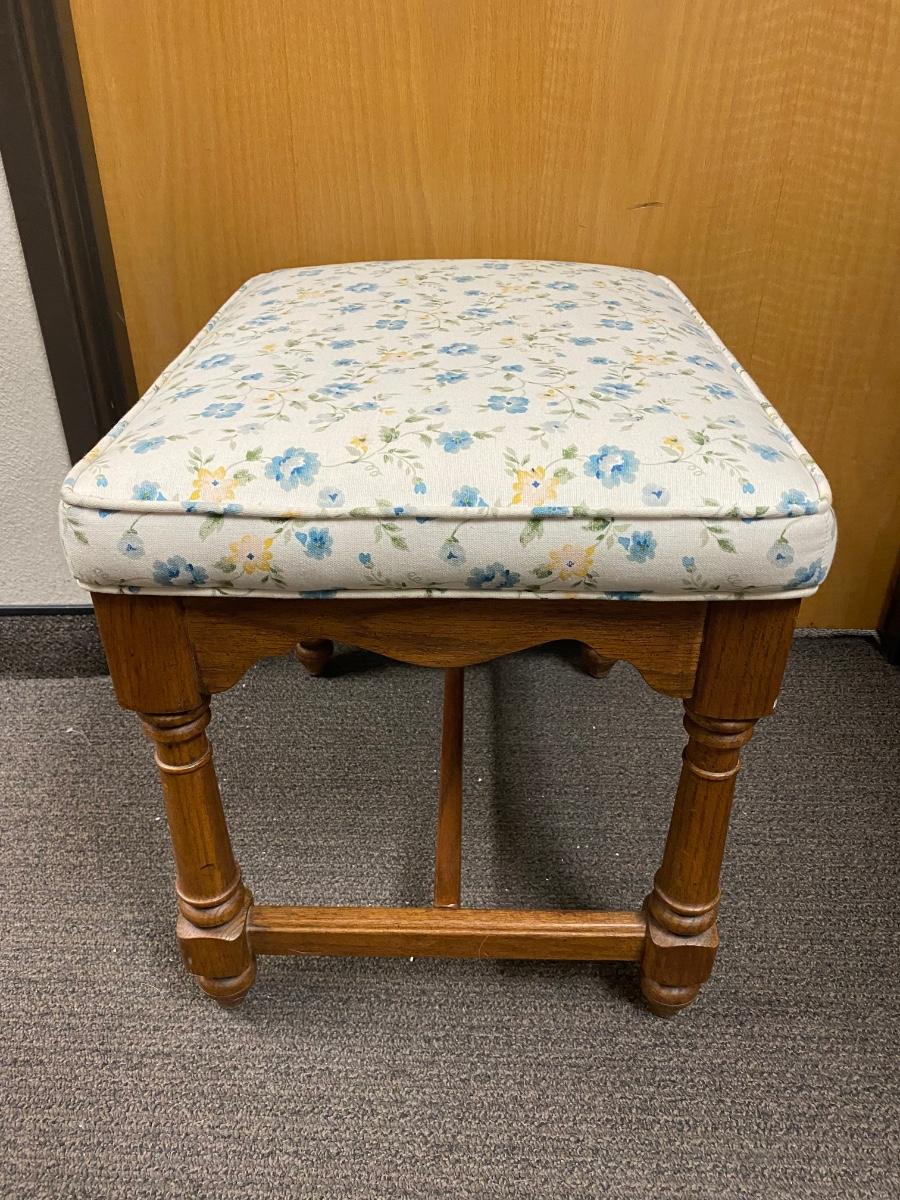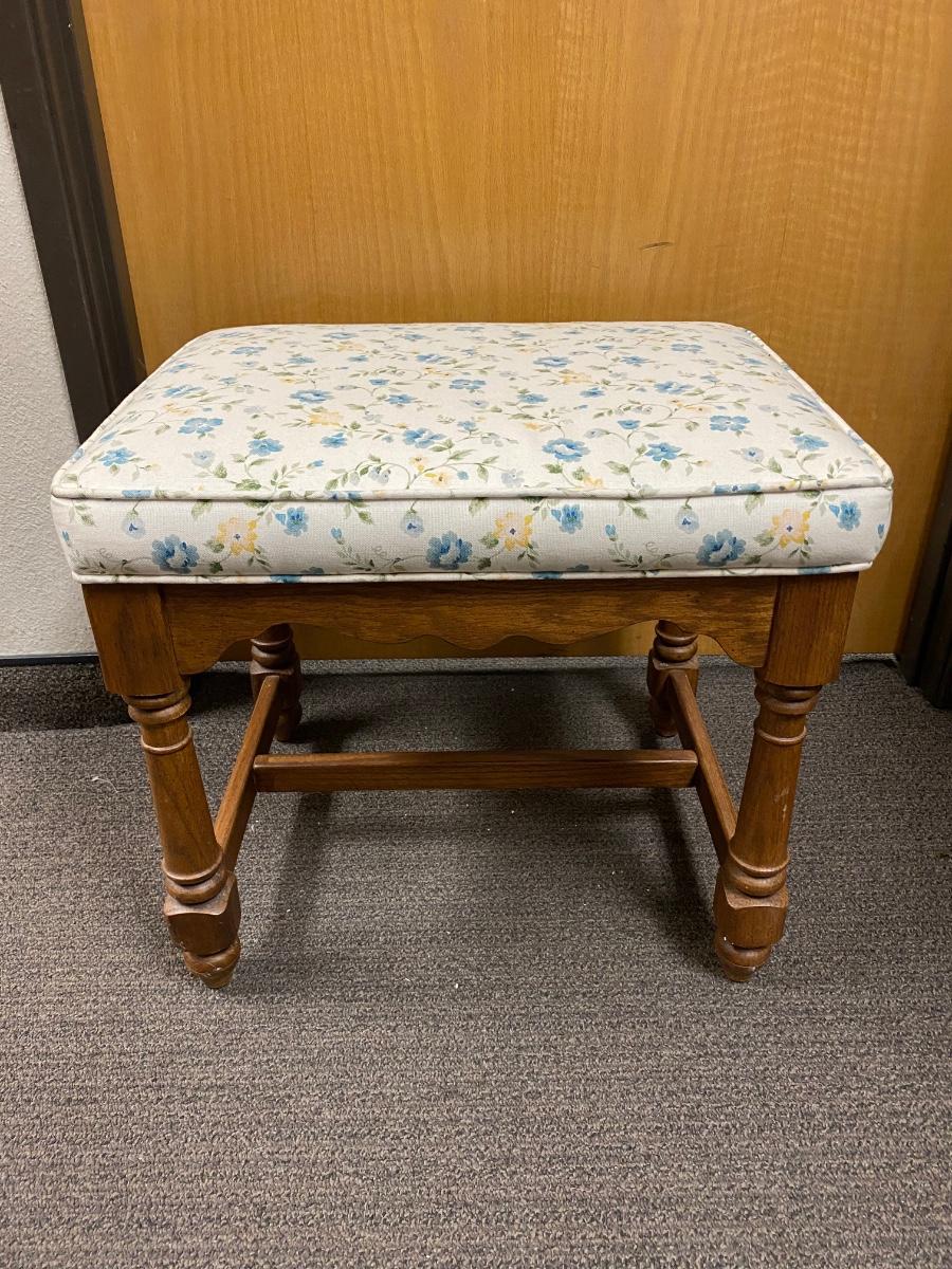 Vintage Light Wood Cushioned Seat Bench Ottoman. Pale yellow and blue floral print fabric cushioned seat. In good condition. About 19" high, 16"x21" seat.