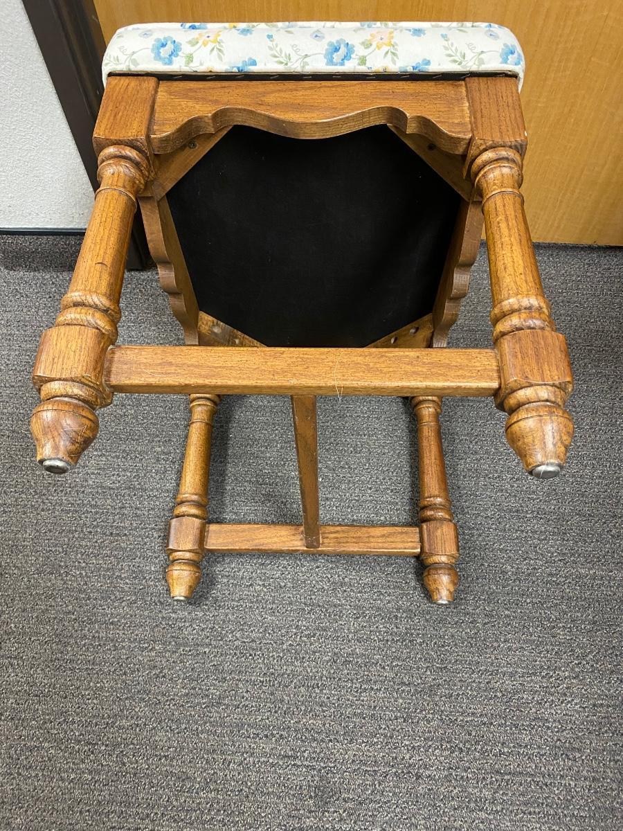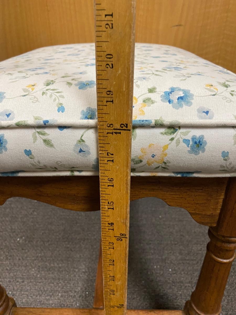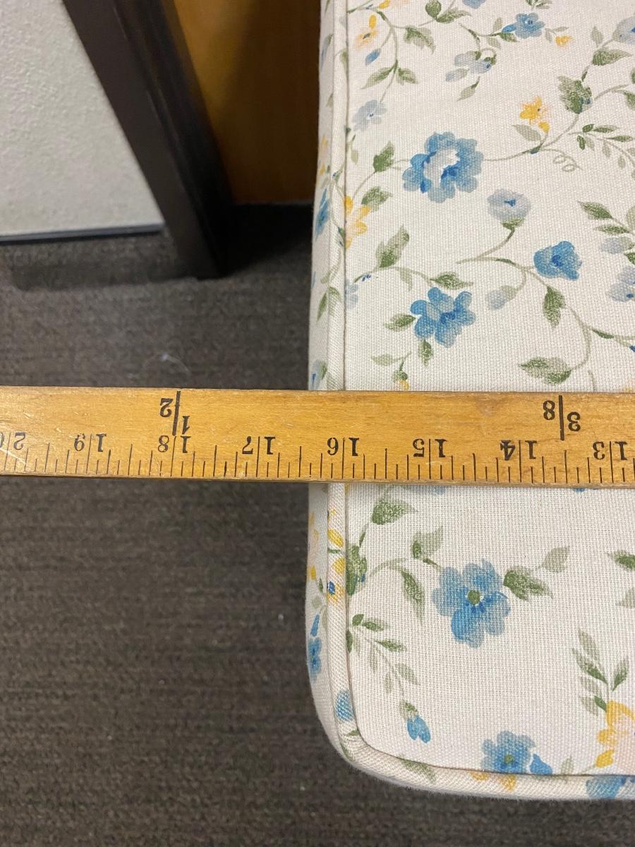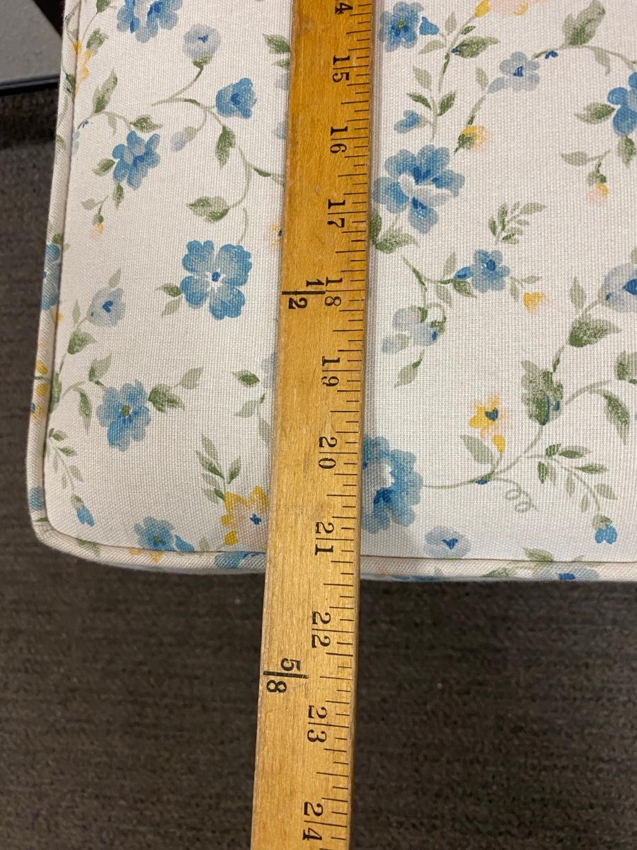Vintage Light Wood Cushioned Seat Bench Ottoman. Pale yellow and blue floral print fabric cushioned seat. In good condition. About 19" high, 16"x21" seat.