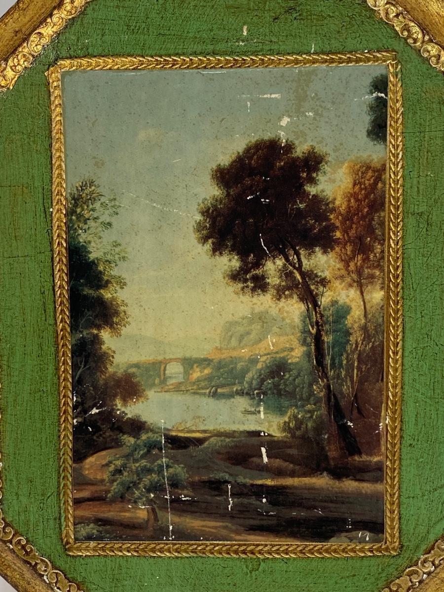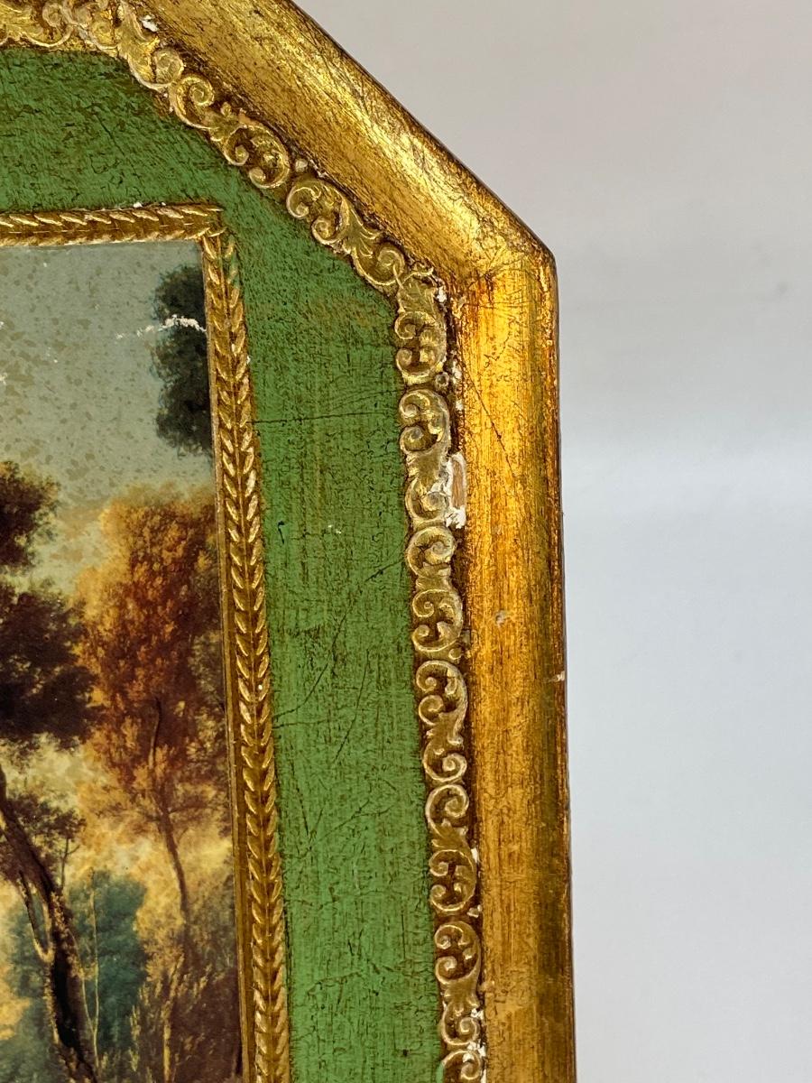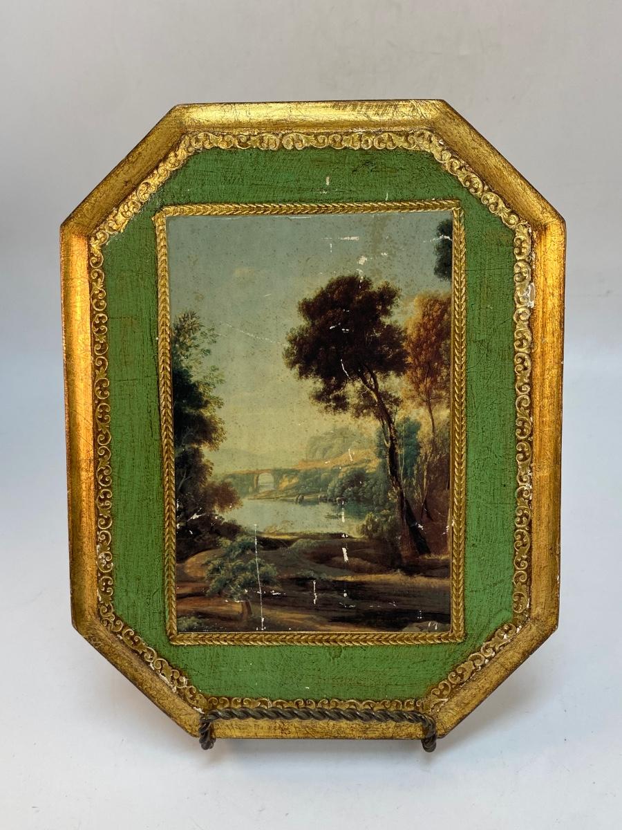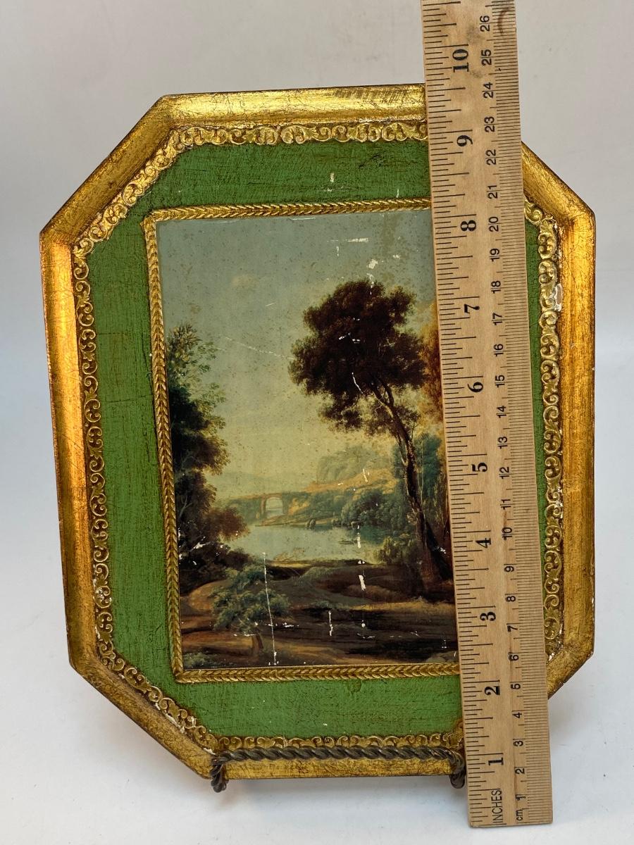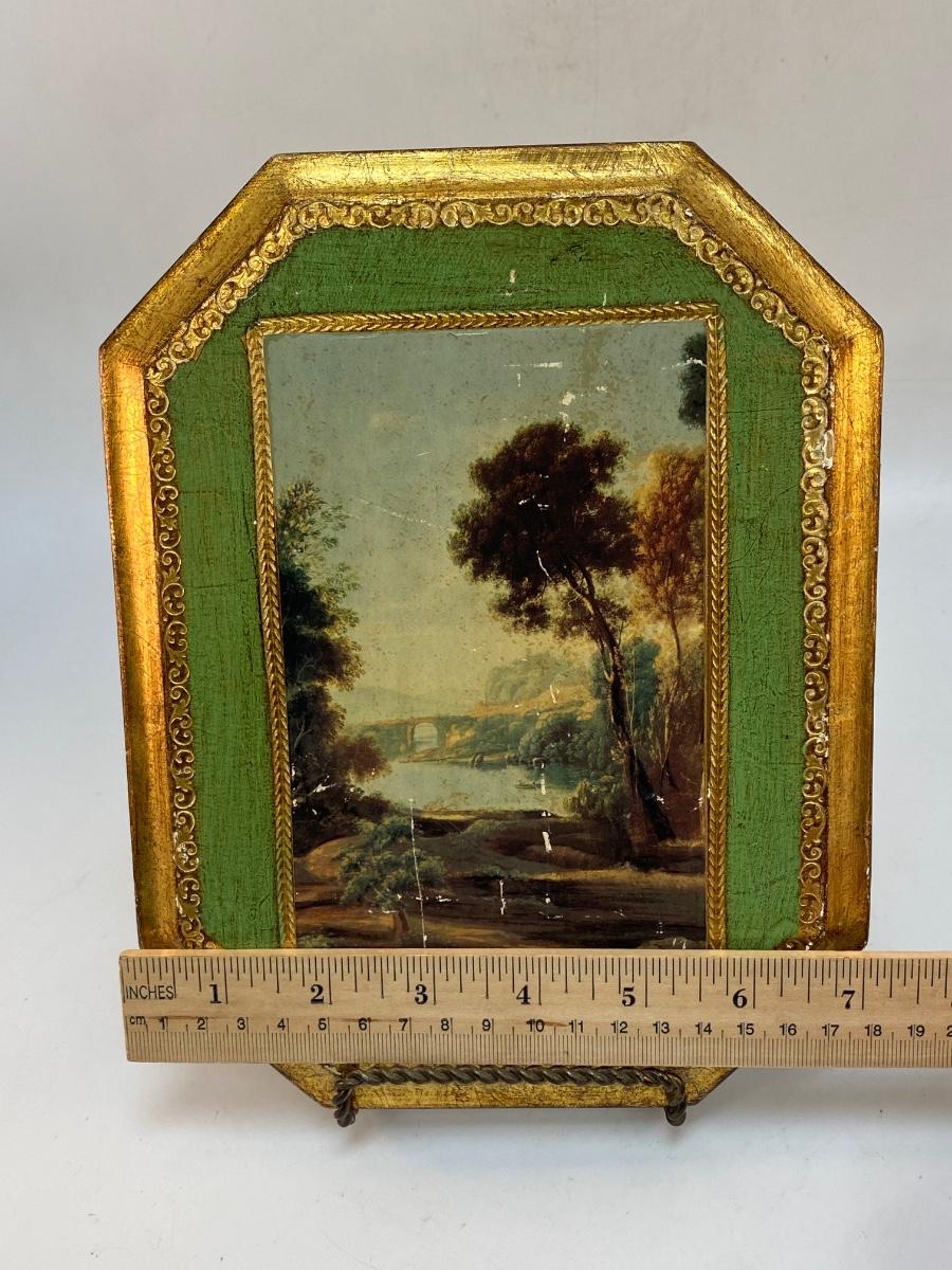 Vintage Made in Italy Mid Century Regency Florentine Style Wall Art Pond with Bridge by Forest. Light wear from age.