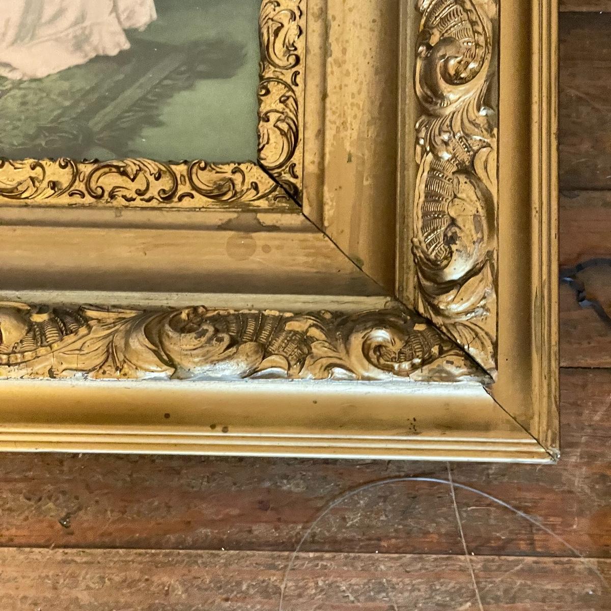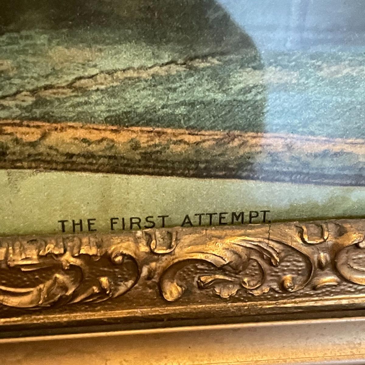“The First Attempt” by Hallen & Weiner framed print. Art sits behind glass in a golden painted wooden frame. Some watermarks are found on art. See images. Shipping available. Please call UPS with dimensions at 828-252-6930 for a shipping quote prior to bidding.