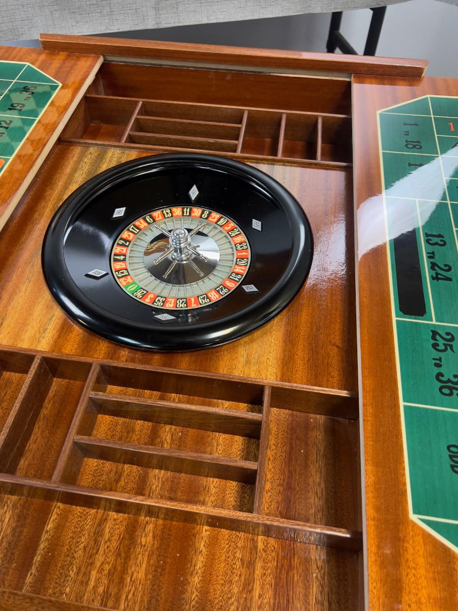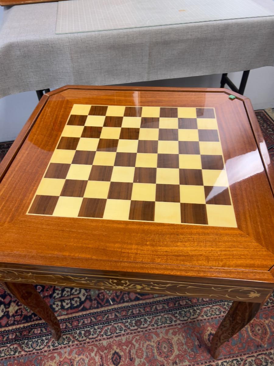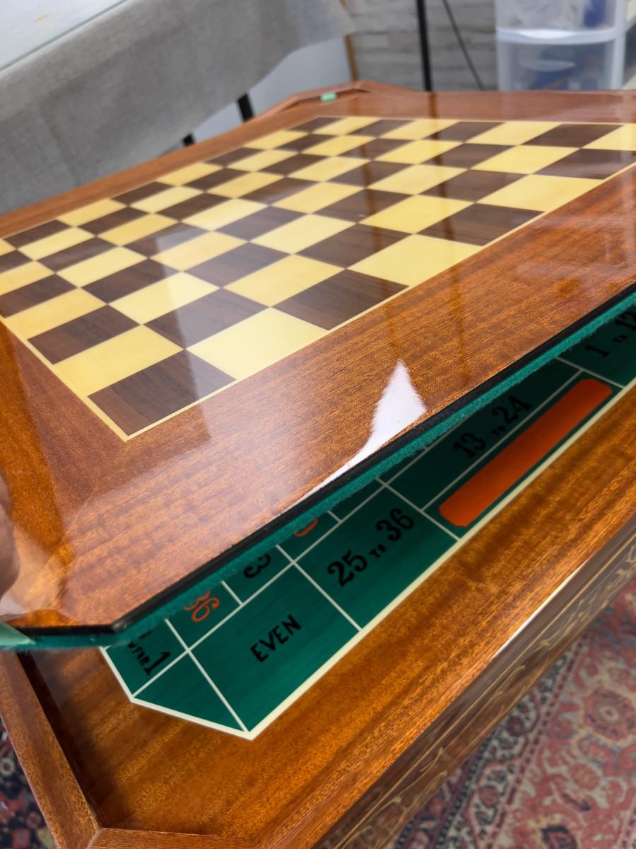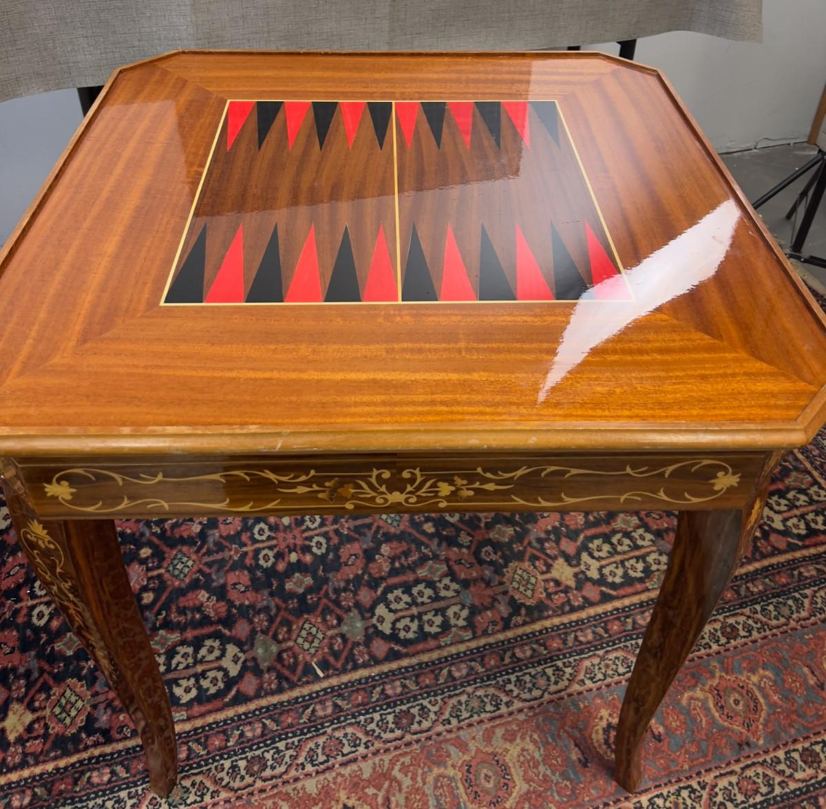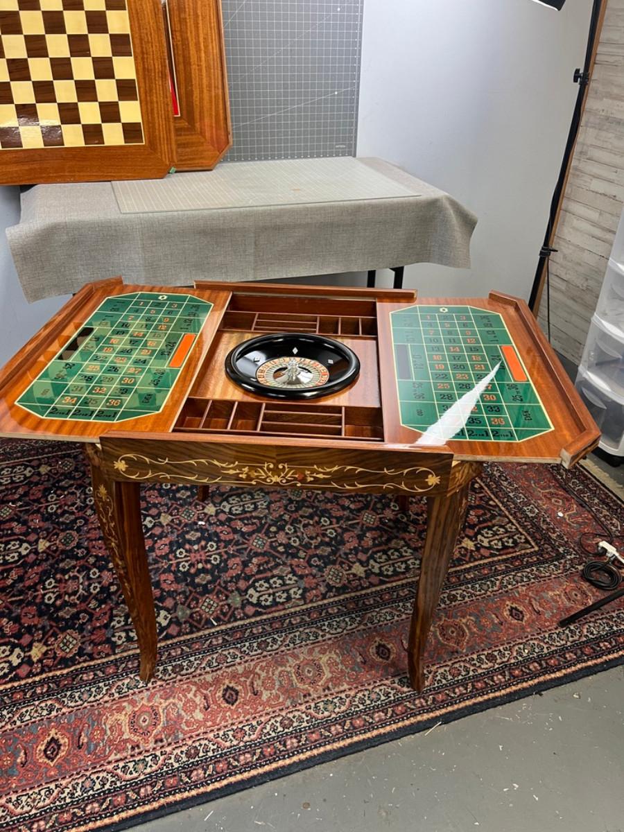Table is in excellent condition, 30" square and 30" tall. Beautifully kept circa 1960's inlay table. Chess, Checkers, Backgammon, Felt top for cards, including a roulette table. If shipping is desired we can facilitate dropping of at a crater/shipping company of the buyers choice.
